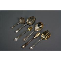 Consisting of a gilt-bowl serving spoon, Wm. B. Durgin Co., Concord, NH, Chrysanthemum pattern, introduced 1893; a pierced gilt-bowl serving spoon and cheese scoop, Whiting Mfg. Co., New York, Louis XV pattern, introduced 1891; a gilt-bowl serving fork, Reed & Barton, Taunton, MA, Majestic pattern, introduced 1894; a gilt-bowl cheese scoop, possibly Reed & Barton, Shell pattern, introduced 1900 and a small pierced-bowl serving spoon, Tiffany & Co., New York, English King pattern, introduced 1885. All but the first engraved with monogram, initial or name. All items, except Shell pattern cheese scoop, impressed with factory mark; the Shell pattern cheese scoop impressed with retailer's mark BIGELOW KENNARD & CO. Wear to all gilt surfaces; some rubbing to high points of decoration.