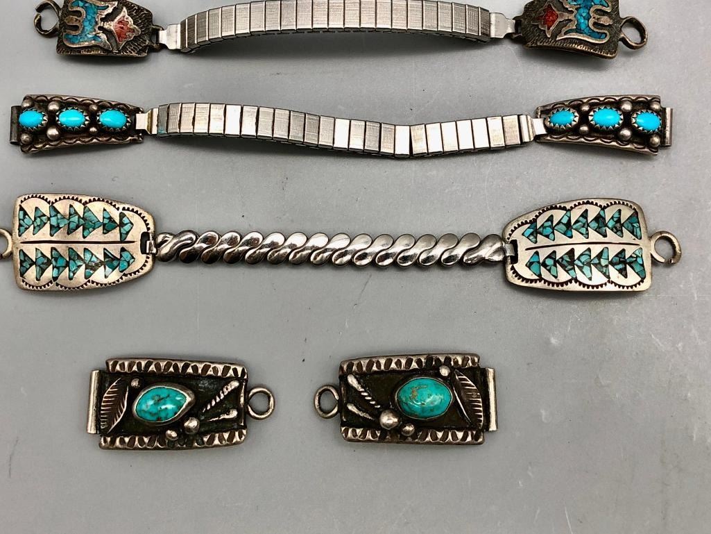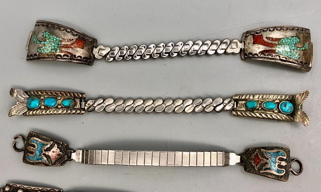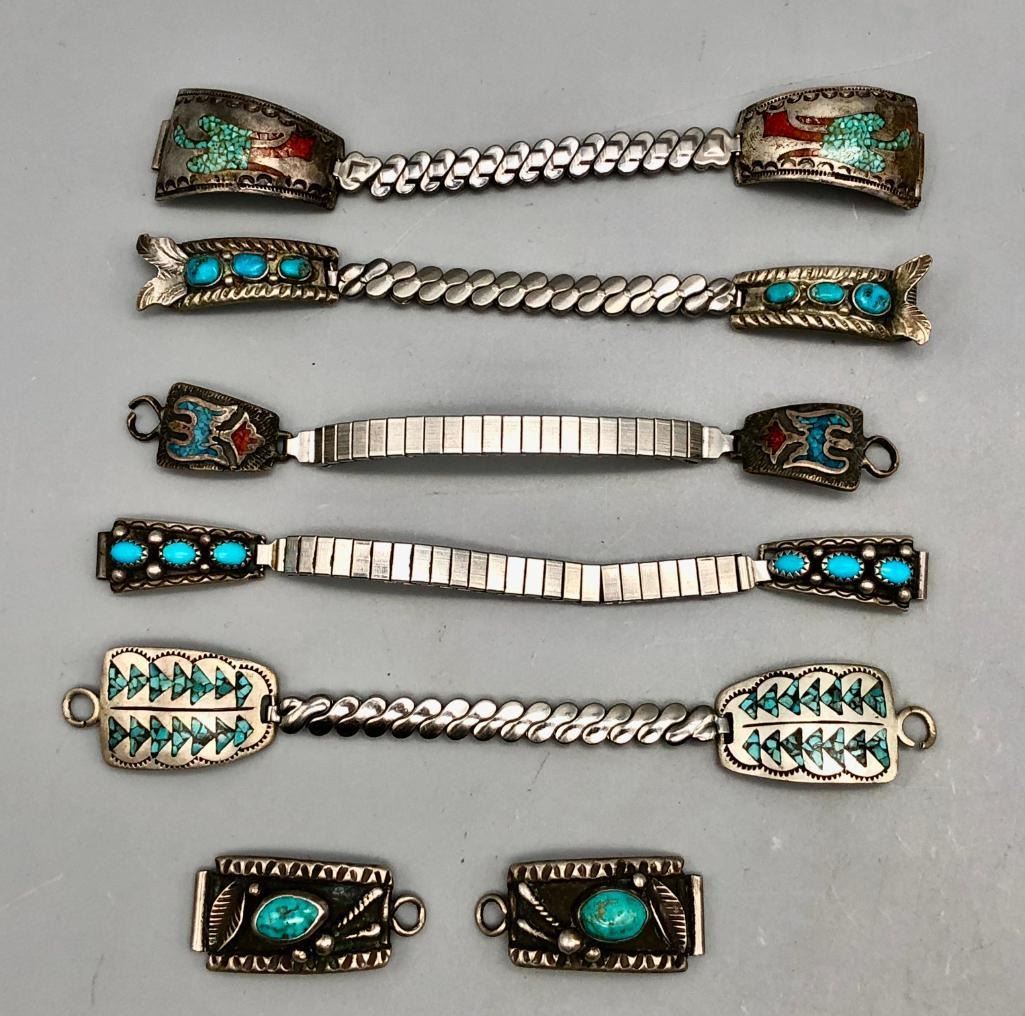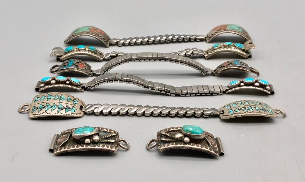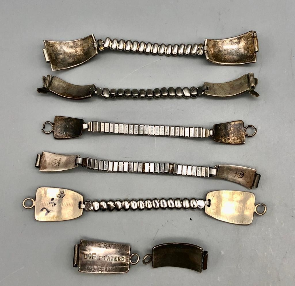 Presented for sale in this lot is a group of six pairs of vintage ladies watch tips. These are great smaller tips. All are various sizes, styles, and set with various stones. Most of them are stretch link bands, and are made from sterling silver. MAKER: Various. APPROX AGE: Vintage. SIZE: Various. Combined weight is 87.5 grams. CONDITION: Good for their age, normal wear expected. Please look closely at the pictures as they are an important part of our description and are hereby incorporated into the description, specifically with regards to condition. SHIPPING: There will be a $5 handling / packaging fee for shipping this lot. The actual cost of postage will be added on top of that. BUY IT NOW: If you would like to buy this item now, without waiting for the auction day to bid on it, we do offer this option (which is available up to 48 hours before the actual auction starts). The “Buy it Now†price is the high estimate of this lot (plus applicable fees and the Buyer's premium is discounted to 10% when using the Buy it Now option). If you would like to exercise this option, you must contact us by email (or phone as long as you talk to someone live). Reference this lot number and your intention to "Buy it Now."