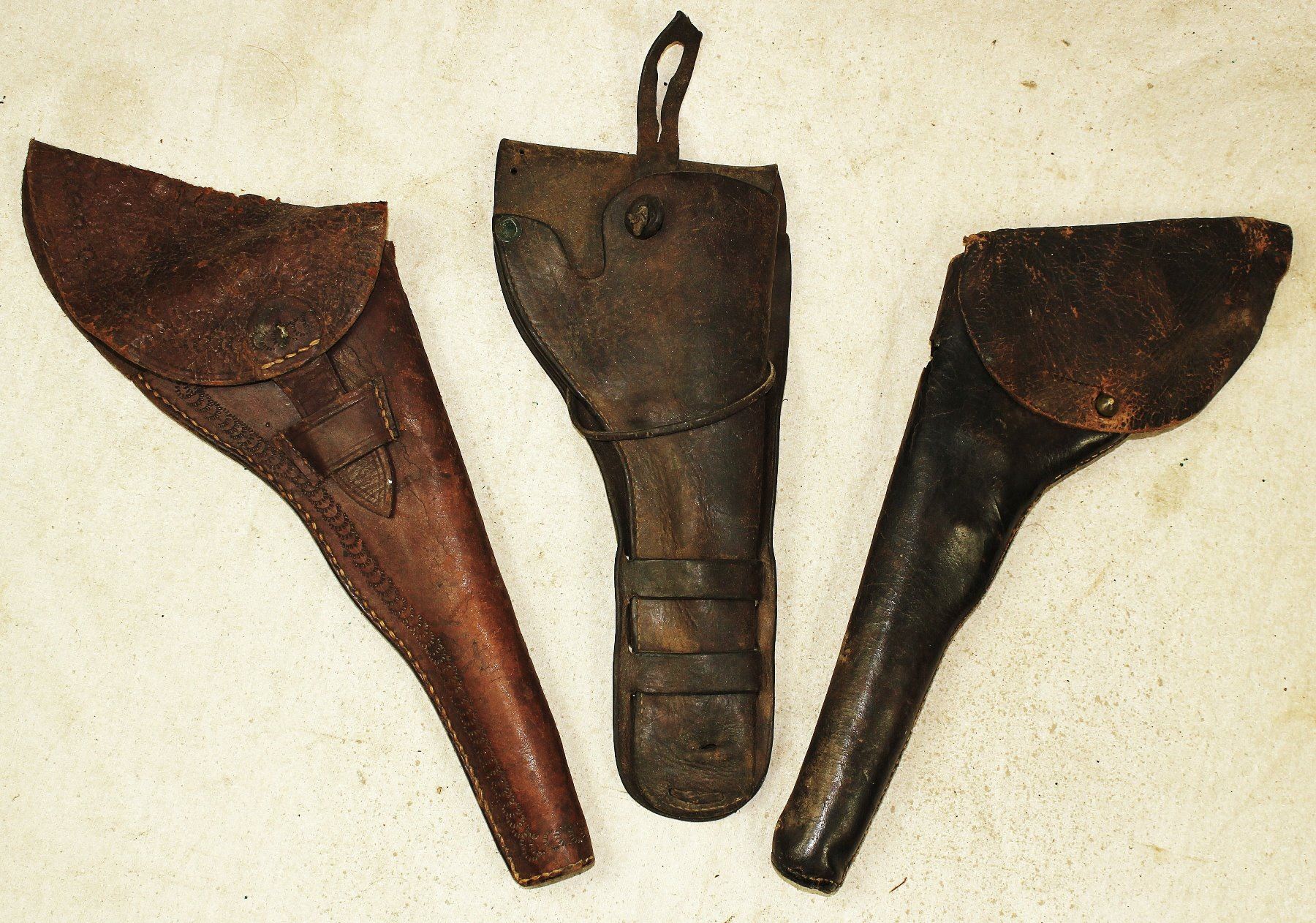 A collection of three early 7 1/2" formed flap holsters with great condition and color.