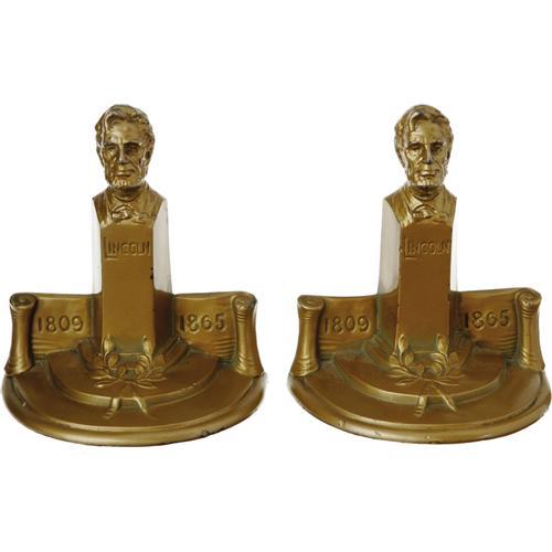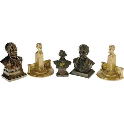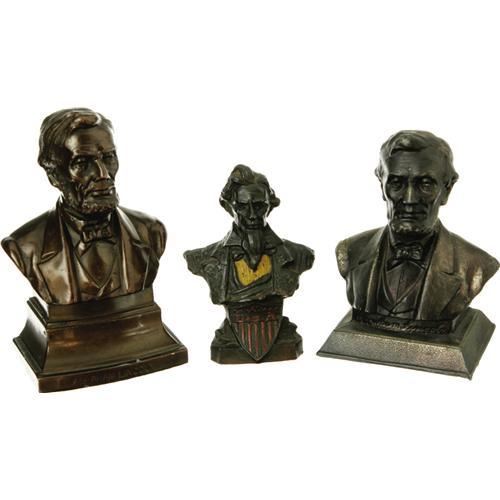 <B>Group of Small Abraham Lincoln Busts and Bookends</B></I> consisting of five items (left to right in photo): a bust by the Aston Casket Hardware Company of Belvedere, Illinois (5.5" tall, slight finish loss on back); pair of bookends marked "W. B. Mfg. Co." (5.25" tall); a metal bust with a painted U.S.A. shield (4.25" tall); and a metal coin bank still with original key (5" tall). Fine grouping.<BR><BR><b>Shipping:</b> Miscellaneous Collectibles, Larg (<a target="_blank" href="http://www.heritageauctions.com/common/shipping.php">view shipping information</a>)