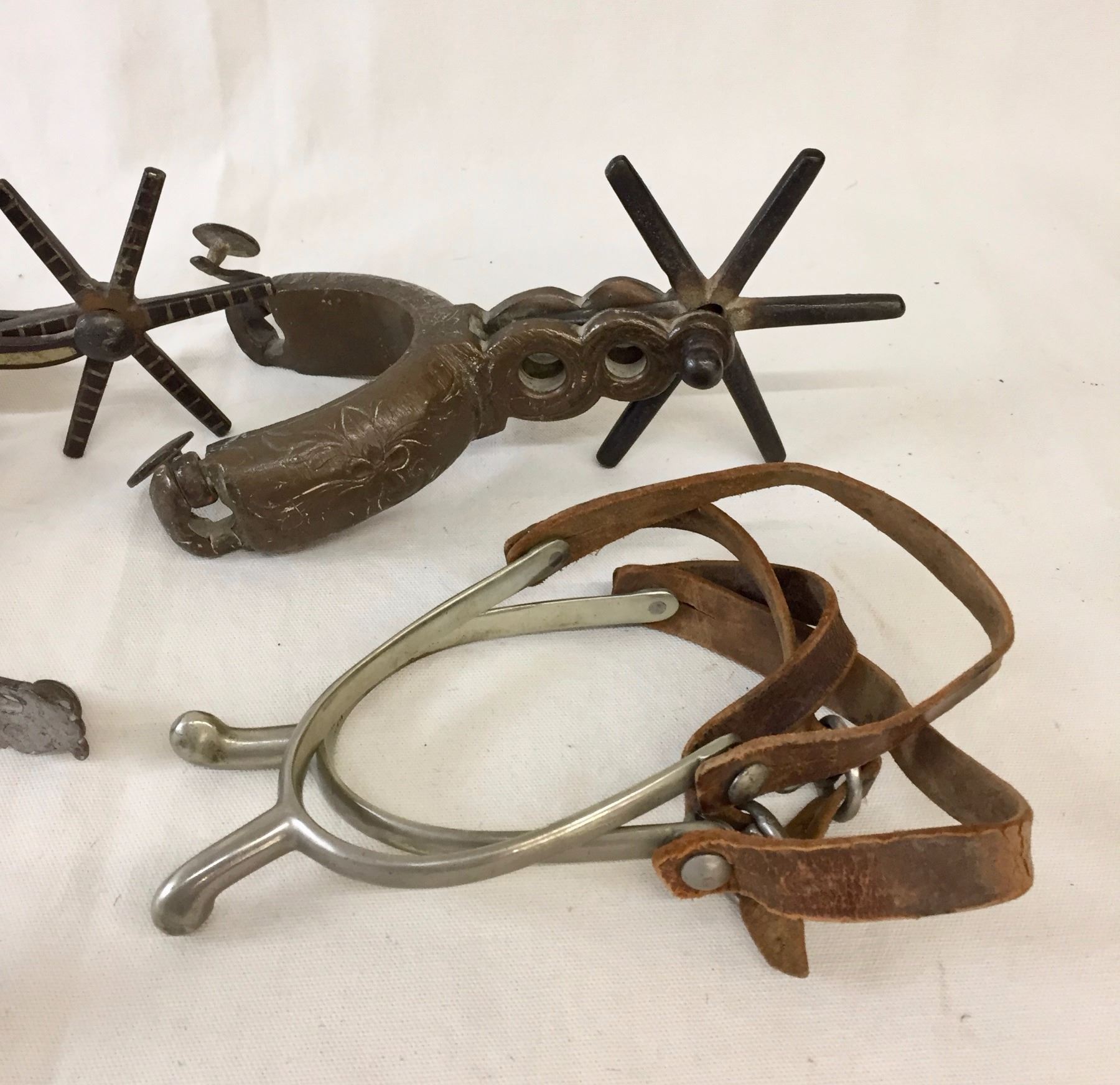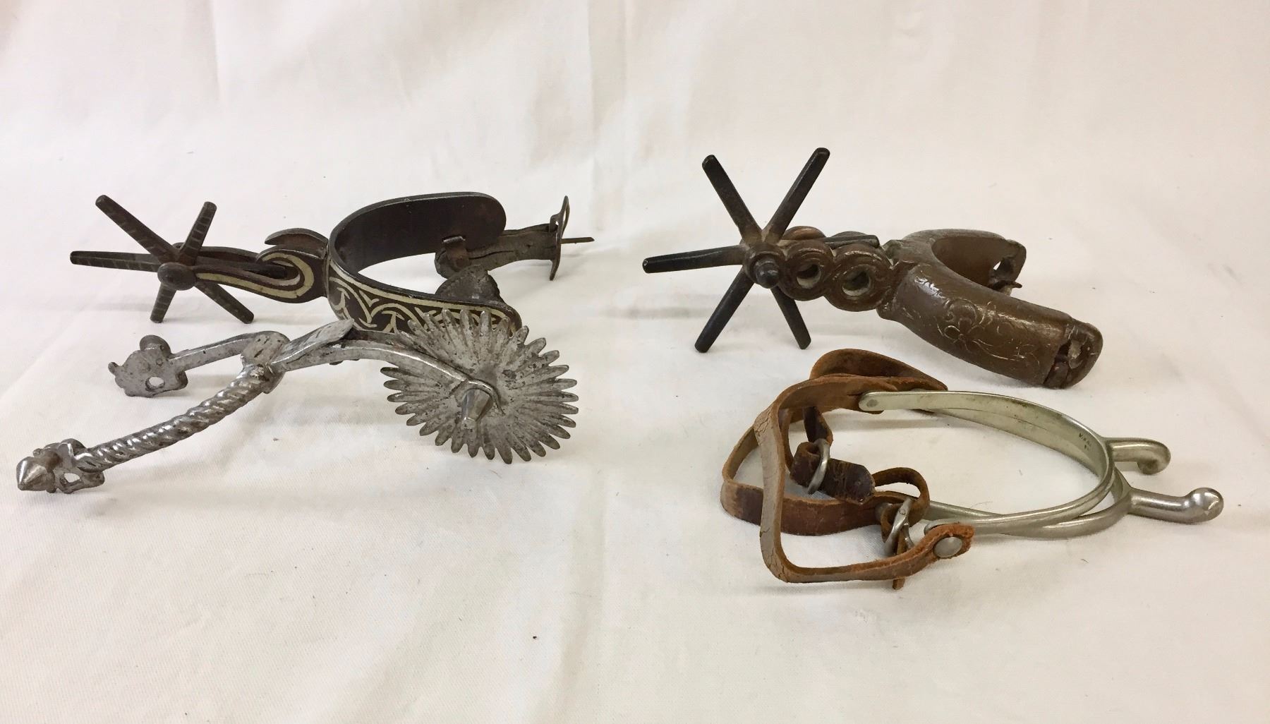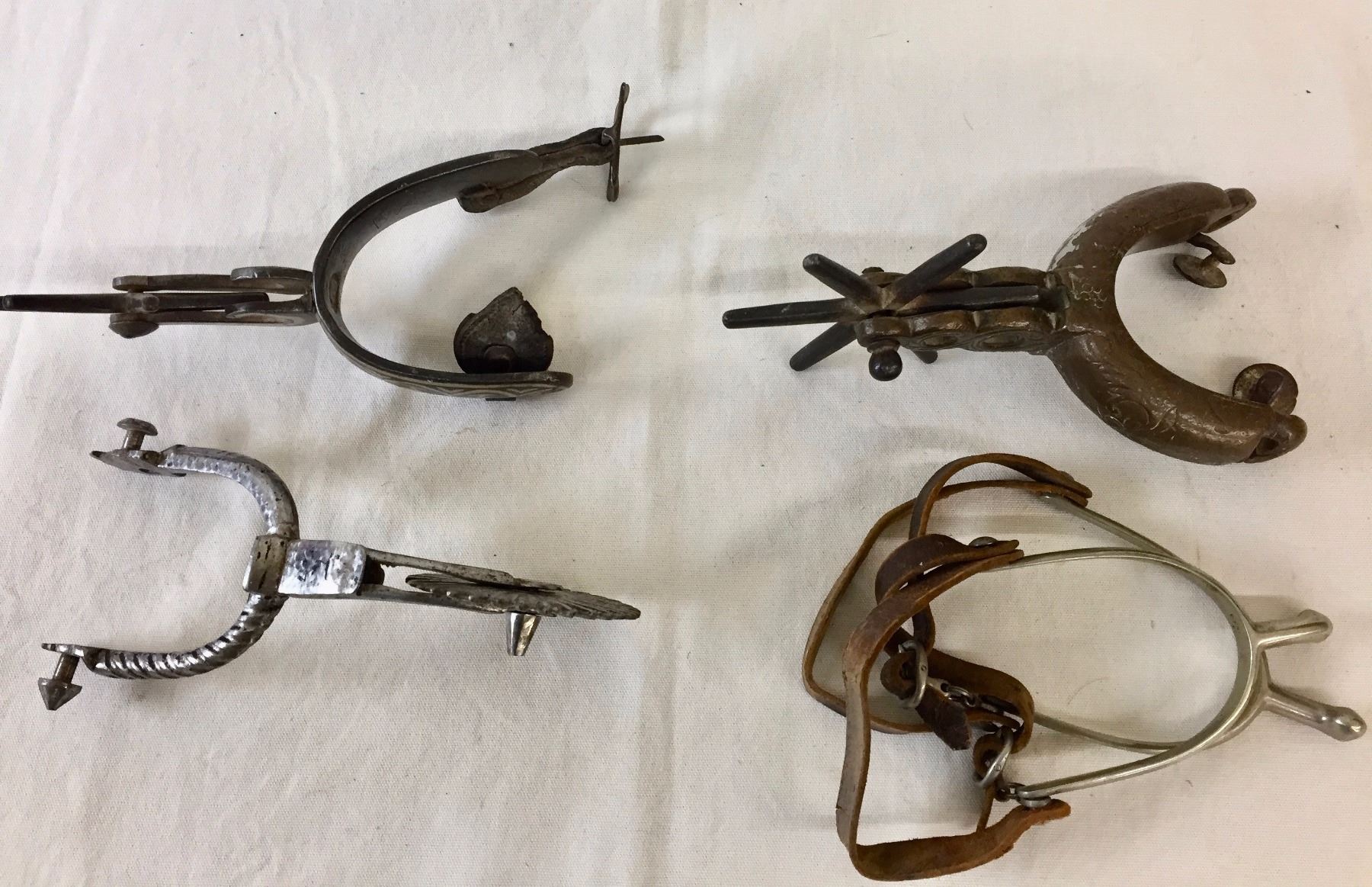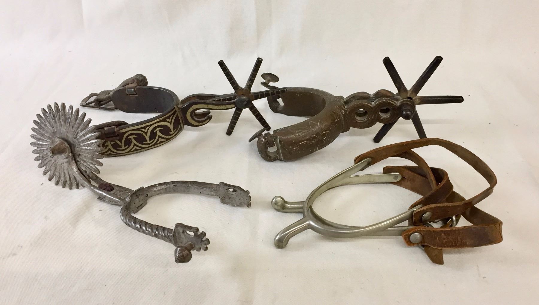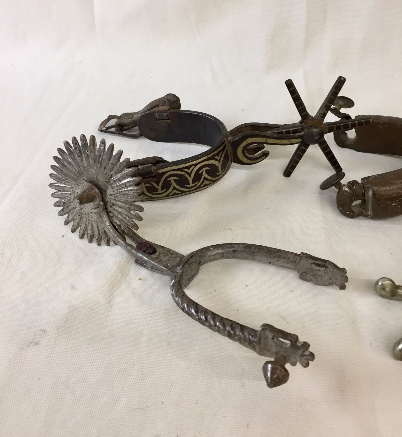 Description: 5 spurs. (3 heavy singles and 1 complete pair of military spurs.) Decorative items at this point, not for use. Maker: Various. Approx. Age: Vintage. Size: Sizes range from: Heel opening is 3 1/8“. Heel bands are 1 1/2“ wide. Shanks are approx. 5” long including the rowels to heel opening is 3“. Heel bands are 1/2“ wide. Shanks are 1 1/2“ long. Condition: Pretty good for their ages, wear expected. Please look closely at the pictures - they are an important part of our description. Shipping: There will be a $5 handling / packaging fee for shipping this lot. The actual cost of postage will be added on top of that.