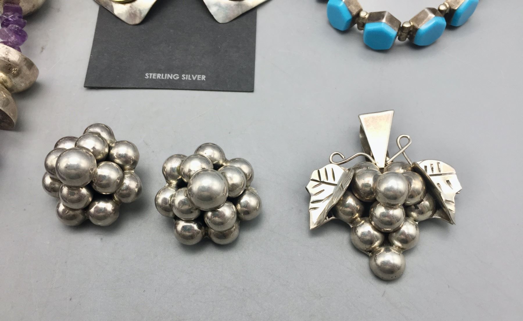 Description: For sale in this lot is a group of sterling silver jewelry in various styles and designs. Maker: Various makers, most are marked as being from Mexico. Approx. Age: Vintage to modern. Size: Varies, but the combined weight is 225.2 grams. Condition: Good for their ages, normal wear expected. Please look closely at the pictures - they are an important part of our description. Shipping: There will be a $5 handling, packaging fee for shipping this lot. The actual cost of postage will be added on top of that.