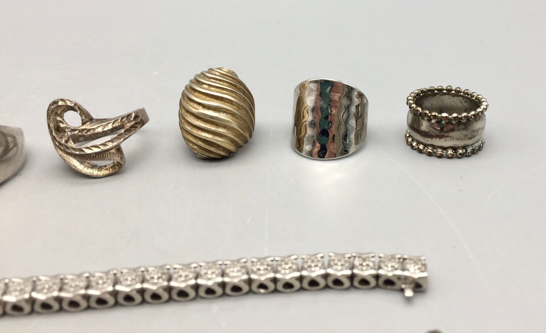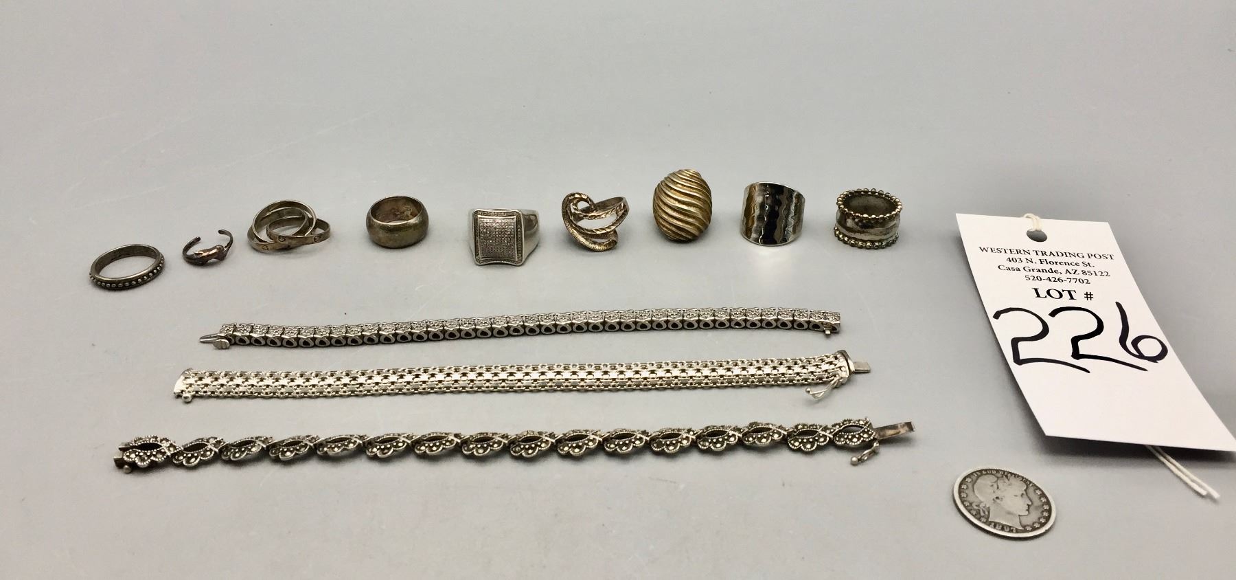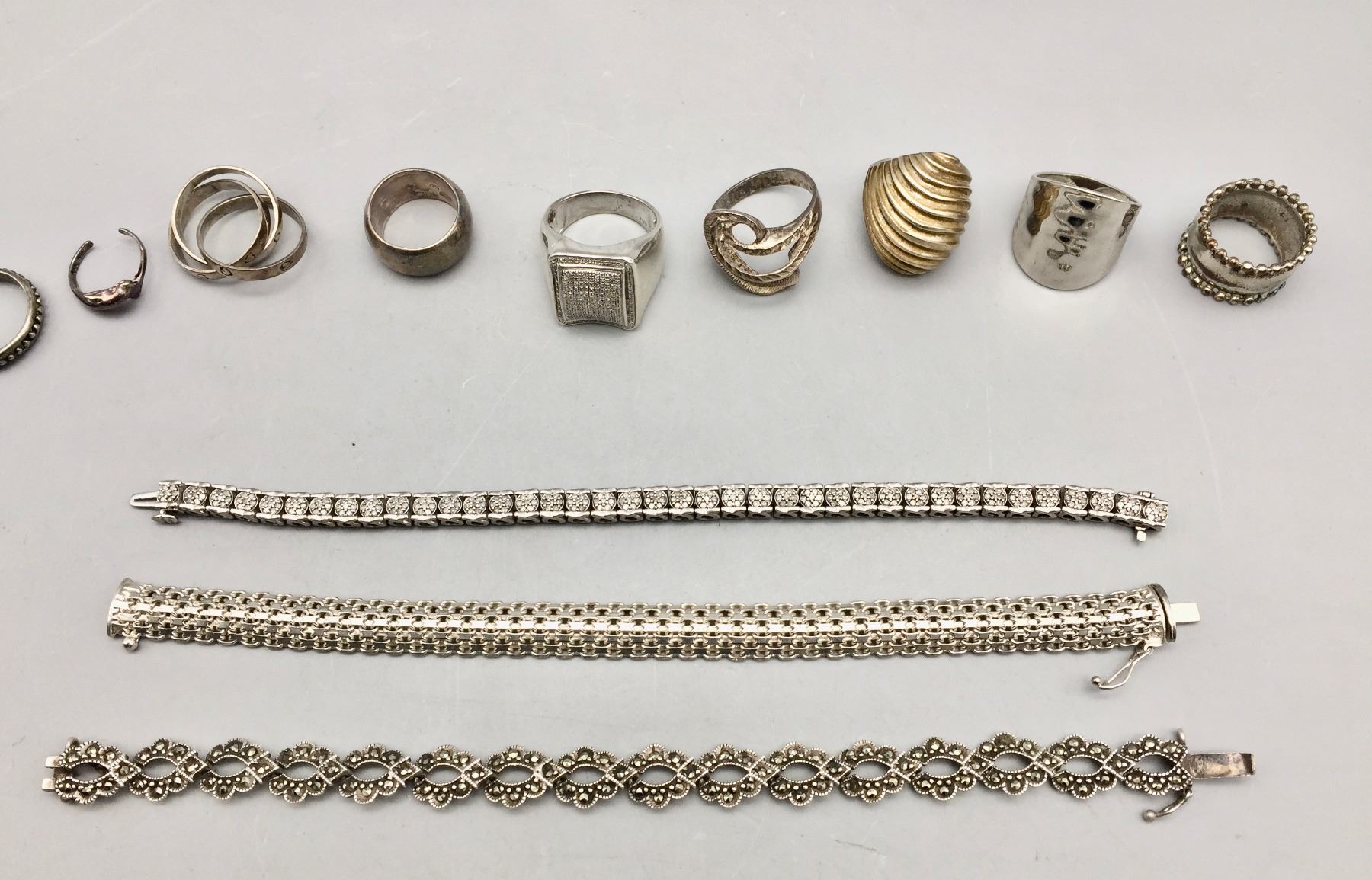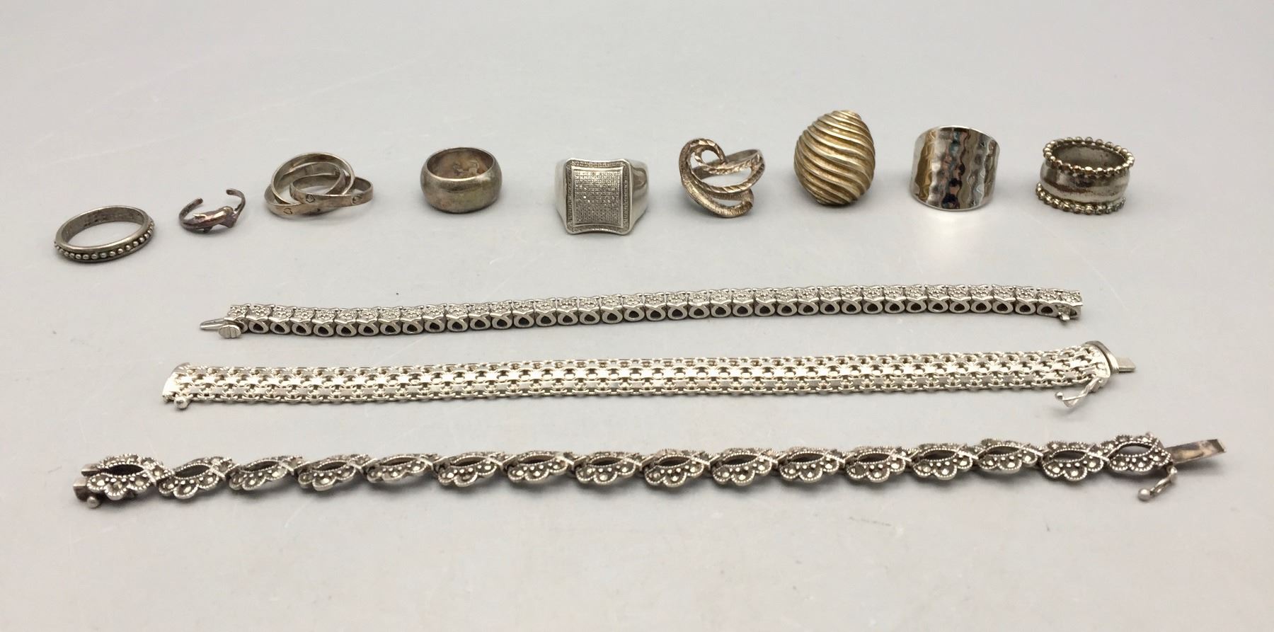 Description: Offered in this bargain lot is a group of sterling silver rings and bracelets in varying sizes and styles. Maker: Various.