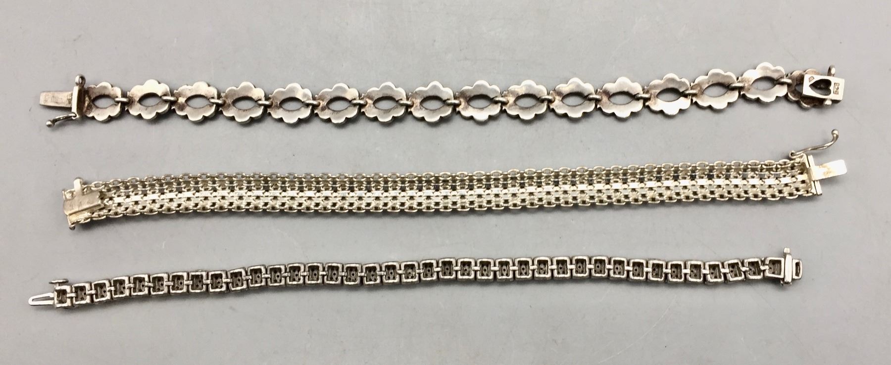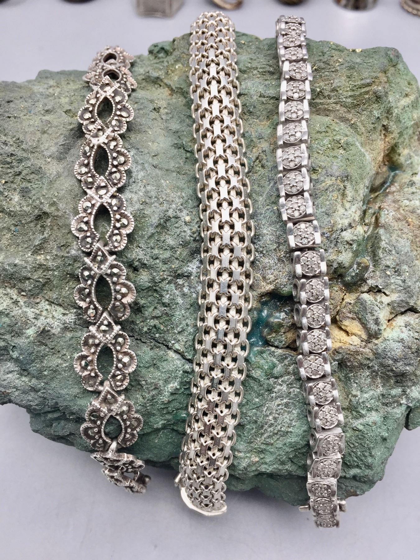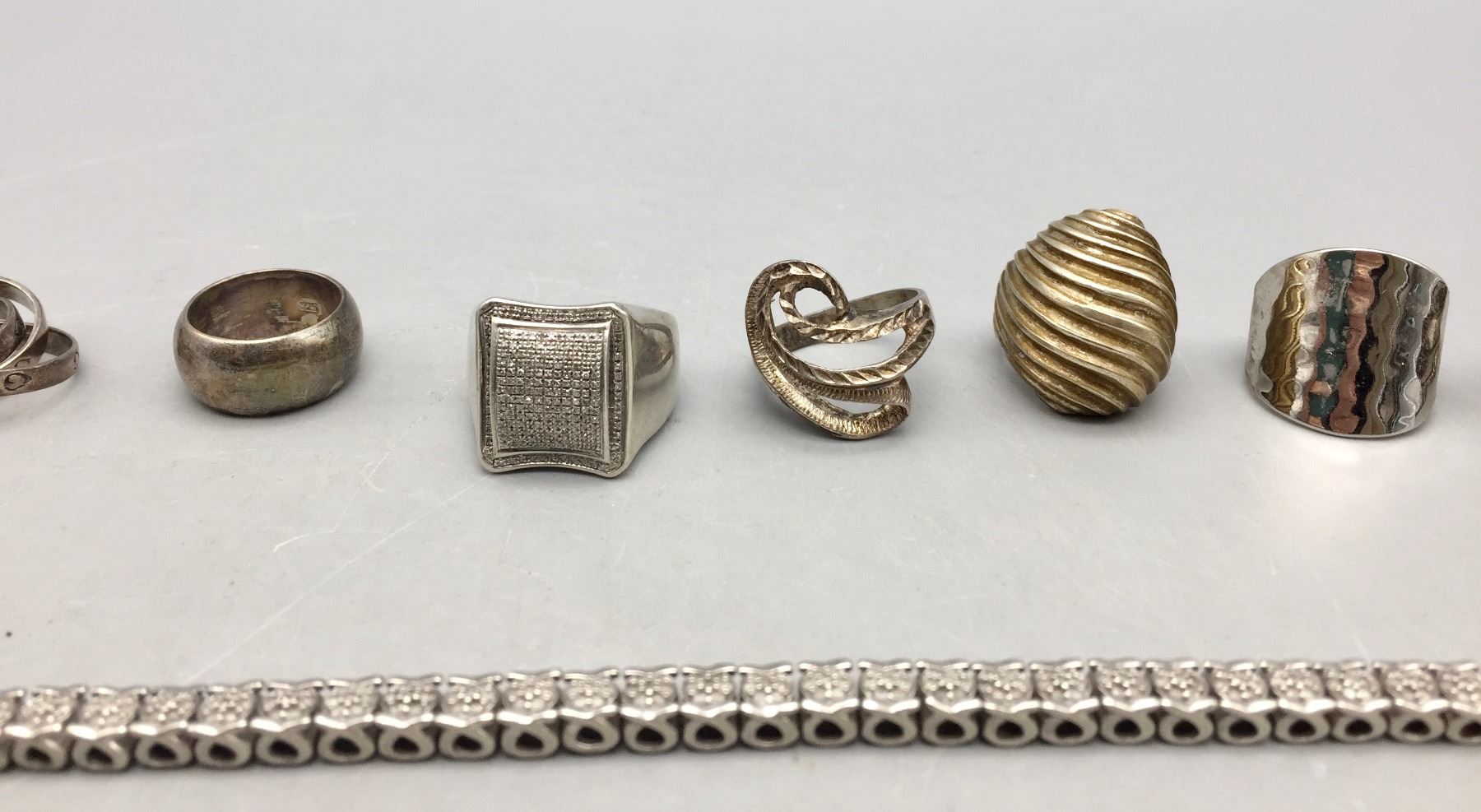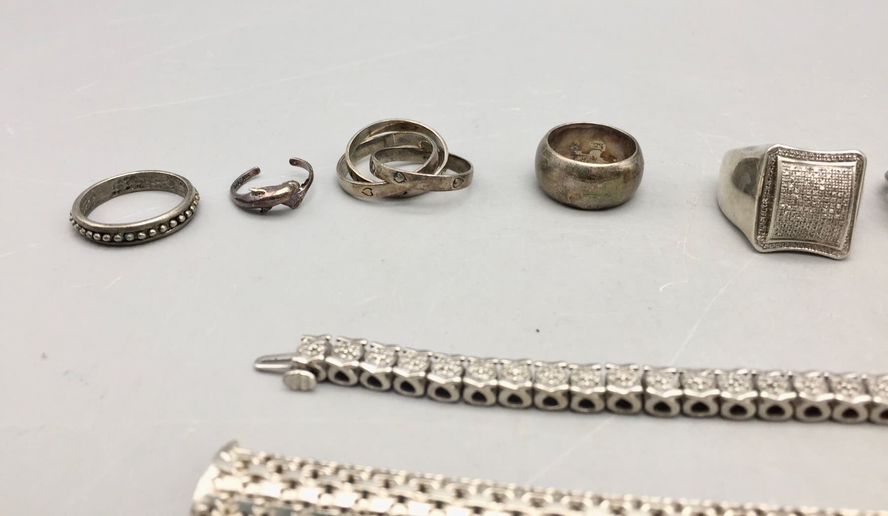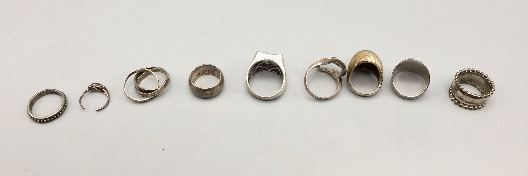 Description: Offered in this bargain lot is a group of sterling silver rings and bracelets in varying sizes and styles. Maker: Various.