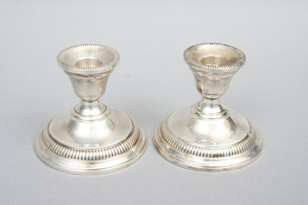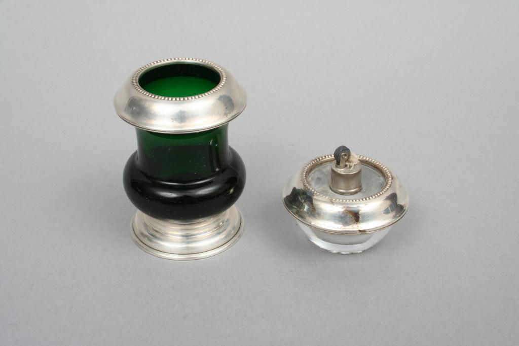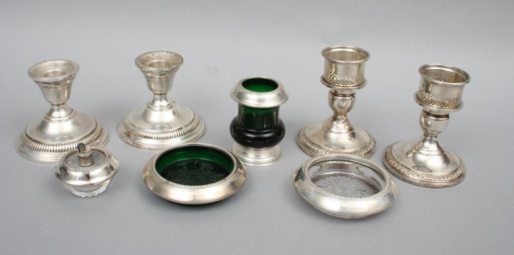 Comprising: a pair of Lamerie sterling silver low candle sticks with weighted bases (3 /4"H); another pair of low candlesticks with weighted bases (3"H); a pair of pierced sterling candle stick enhancers; a Whiting sterling and cut glass coaster (5 1/8"D); a sterling silver bonbon with pierced and gadrooned rim (1"H. 5 1/4"D); a small sterling compote with weighted base (2 1/2"H. 4 3/4"D); a Frank Whiting green glass and sterling rimmed cigarette urn and ashtray; a Frank Whiting clear glass ashtray with sterling rim; and a Frank Whiting sterling rimmed part lighter. Condition: some light surface imperfections, including light scratches, one pair of candlesticks with a crimped base, otherwise very good.