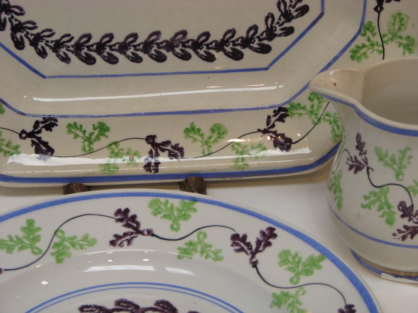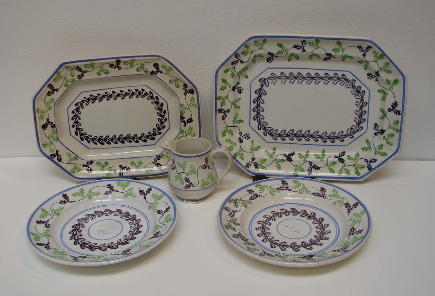 Title: Group of Stick Spatter Holly Pattern Ceramics including: creamer, 2 octagonal platters, 2 small plates
