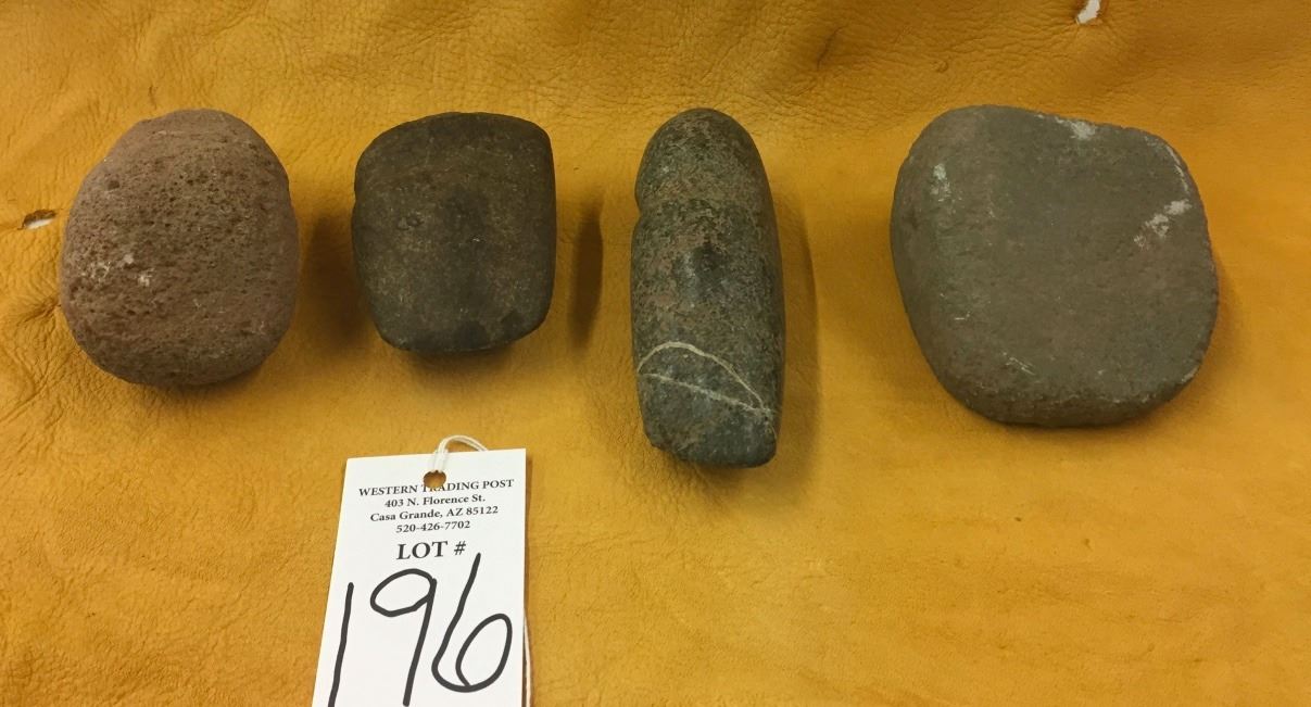 Maker: Prehistoric Hohokam items from a Coolidge, AZ collection. Approx. Age: Prehistoric. Size: Items are from 3.5” to 5” long. Condition: As found. Additional Info: 4 items. Axeheads / Celts. Please look closely at the pictures - they are an important part of our description. Shipping: There will be a $7 handling / packaging fee for shipping this lot. The actual cost of postage will be added on top of that.