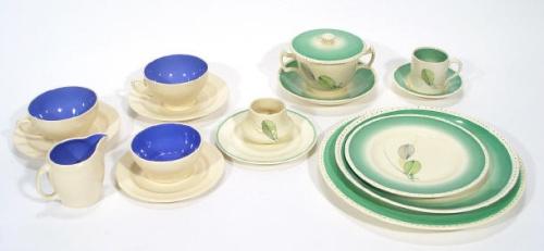 Group of Susie Cooper 'Leaf' patterned tea/dinnerware comprising a two handled soup bowl and cover on stand, coffee can and saucer, three graduated plates, together with two blue and cream glazed Susie Cooper cups and saucers, cream jug and sugar bowl and side plate and two other smaller items