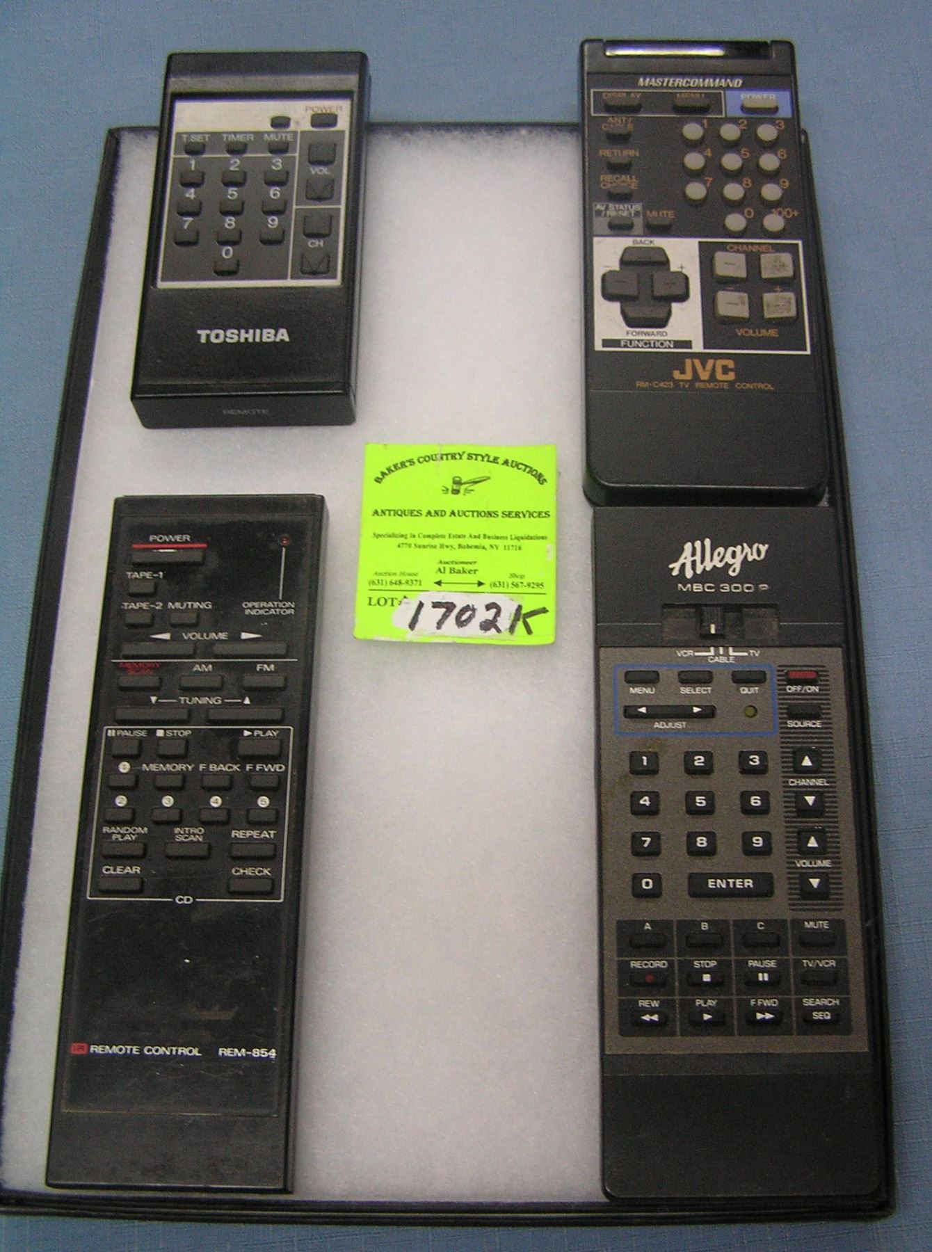 Group of TV remote controls includes Toshiba, JVC, Fisher and Allegro est. value $40.00-$60.00