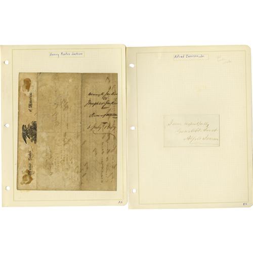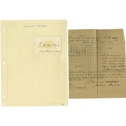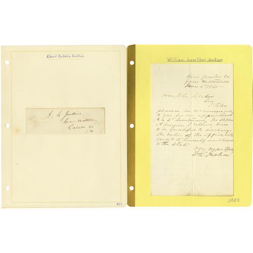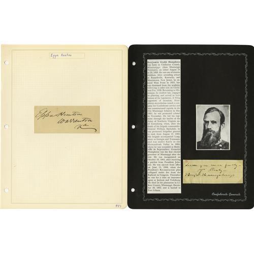 <B>Group Lot of Ten Confederate Generals' Autographs</B></I> consisting of: <BR><B>William Young Conn Humes</B></I>- ANS, one page 9.25" x 7.75", ink has bloomed due to moisture, else very good. <BR><B>Benjamin Grubb Humphreys</B></I>- Clipped signature on lined paper, very good. <BR><B>Eppa Hunton</B></I>- Signature card, bold from Warrenton, Virginia. <BR><B>Alfred Iverson, Jr.</B></I>- Signature card, ink slightly faded, else very good. <BR><B>Henry Rootes Jackson</B></I>- DS, promissory note, 8" x 12",state of Georgia, dated 1849 with multiple signatures by Jackson. <BR><B>Alfred Eugene Jackson</B></I>- DS, one page, a ration return, 10.5" x 9", dated 1864, extremely fine. <BR><B>William Hicks Jackson</B></I>- Signature card with rank below, bold but lightly smudged. <BR><B>William Lawther Jackson</B></I>- ALS, one page, 5.5" x 9", dated 1861. <BR><B>Albert Gallatin Jenkins</B></I>- Clear clipped signature, very good. <BR><B>Adam Rankin Johnson</B></I>- Signature on what appears to be a flyleaf cut from a book. Ink has run in a couple of spots, else very good.<BR><BR><b>Shipping:</b> Small Flat (<a target="_blank" href="http://www.heritageauctions.com/common/shipping.php">view shipping information</a>)