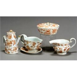 Consisting of two teacups with saucers, a cream jug, a small oval covered dish, a circular dish, and a gravy boat with undertray decorated in the 'Sacred Bird' pattern, and a teacup with saucer, a shallow bowl and a small lighthouse-form teapot decorated with butterflies on a floral field; all decorated in orange-red with gilt highlights. Hairline crack to handle of gravy boat; wear to gilt decoration on rims.