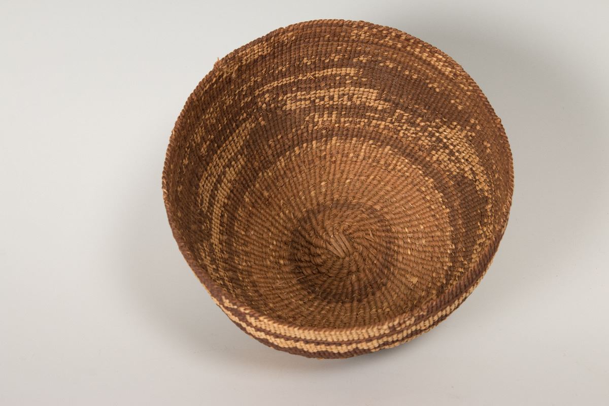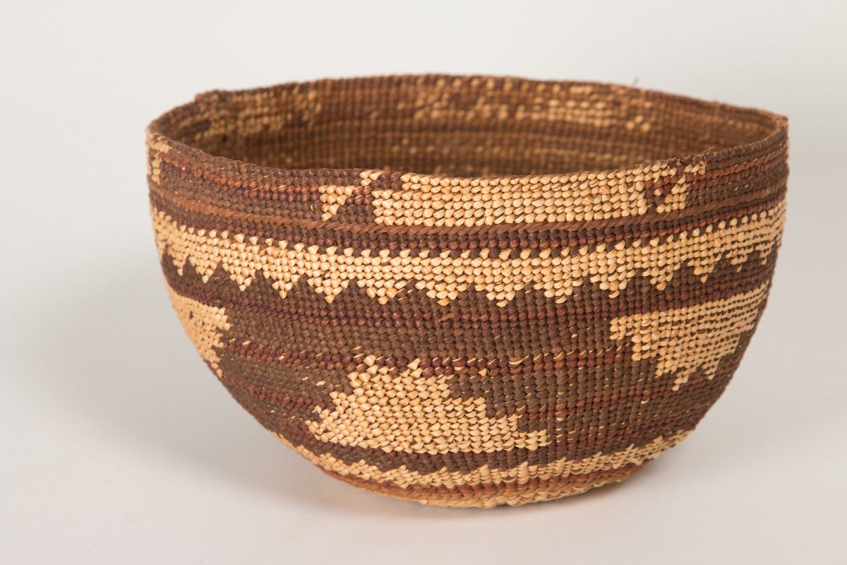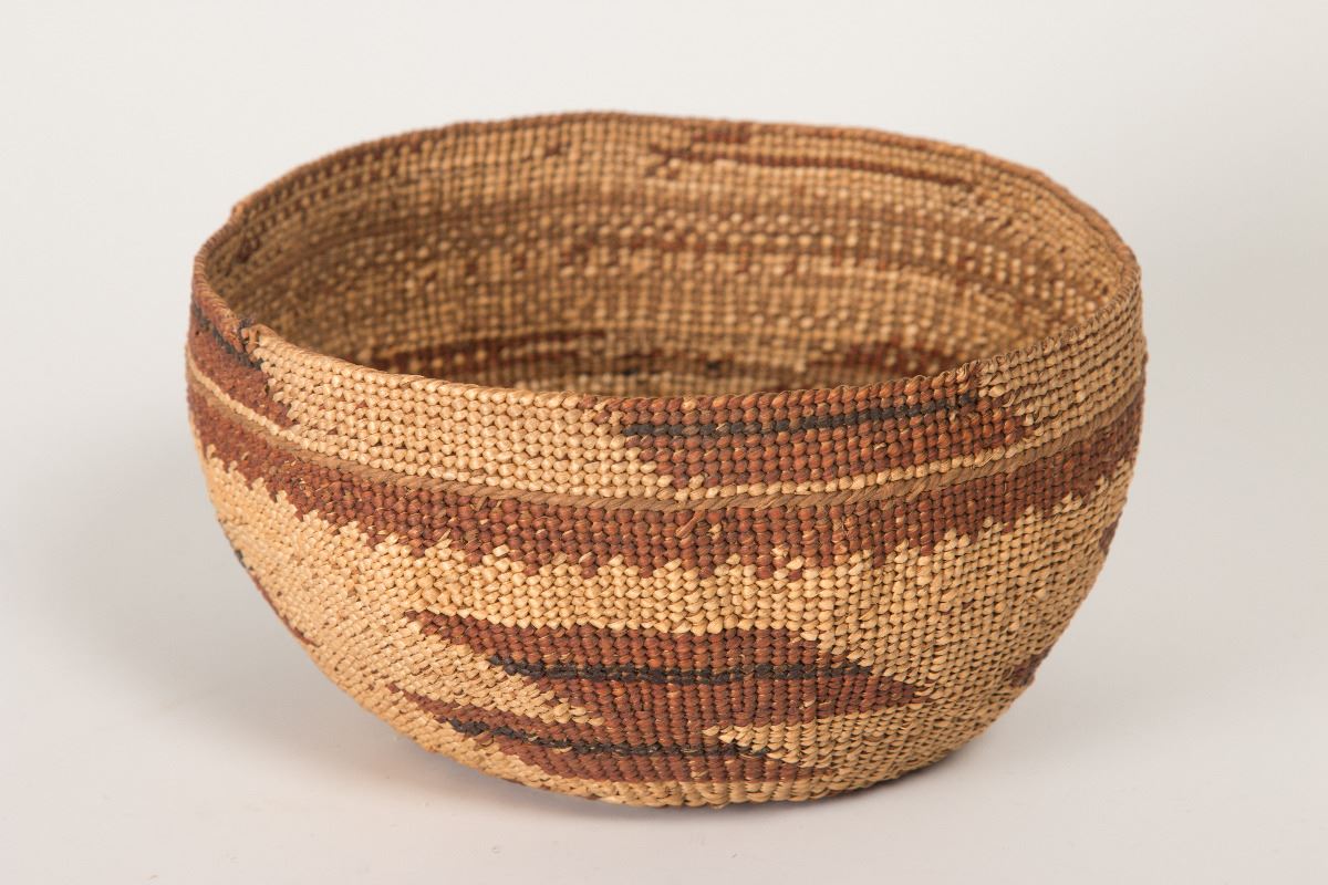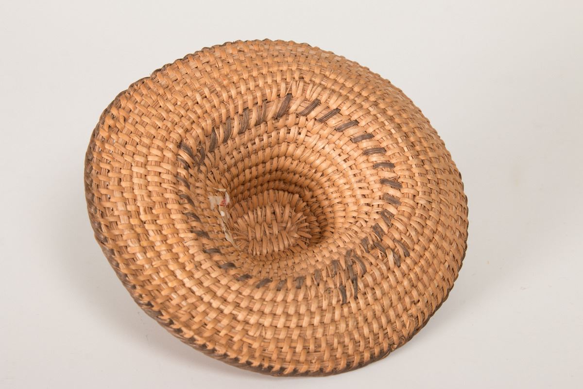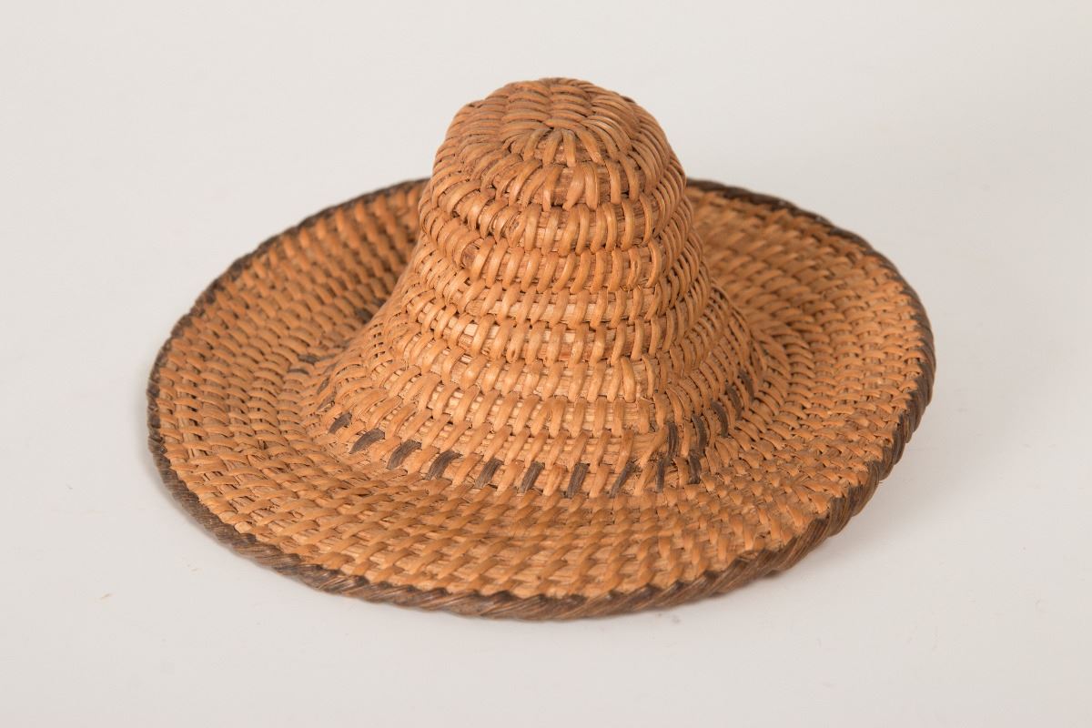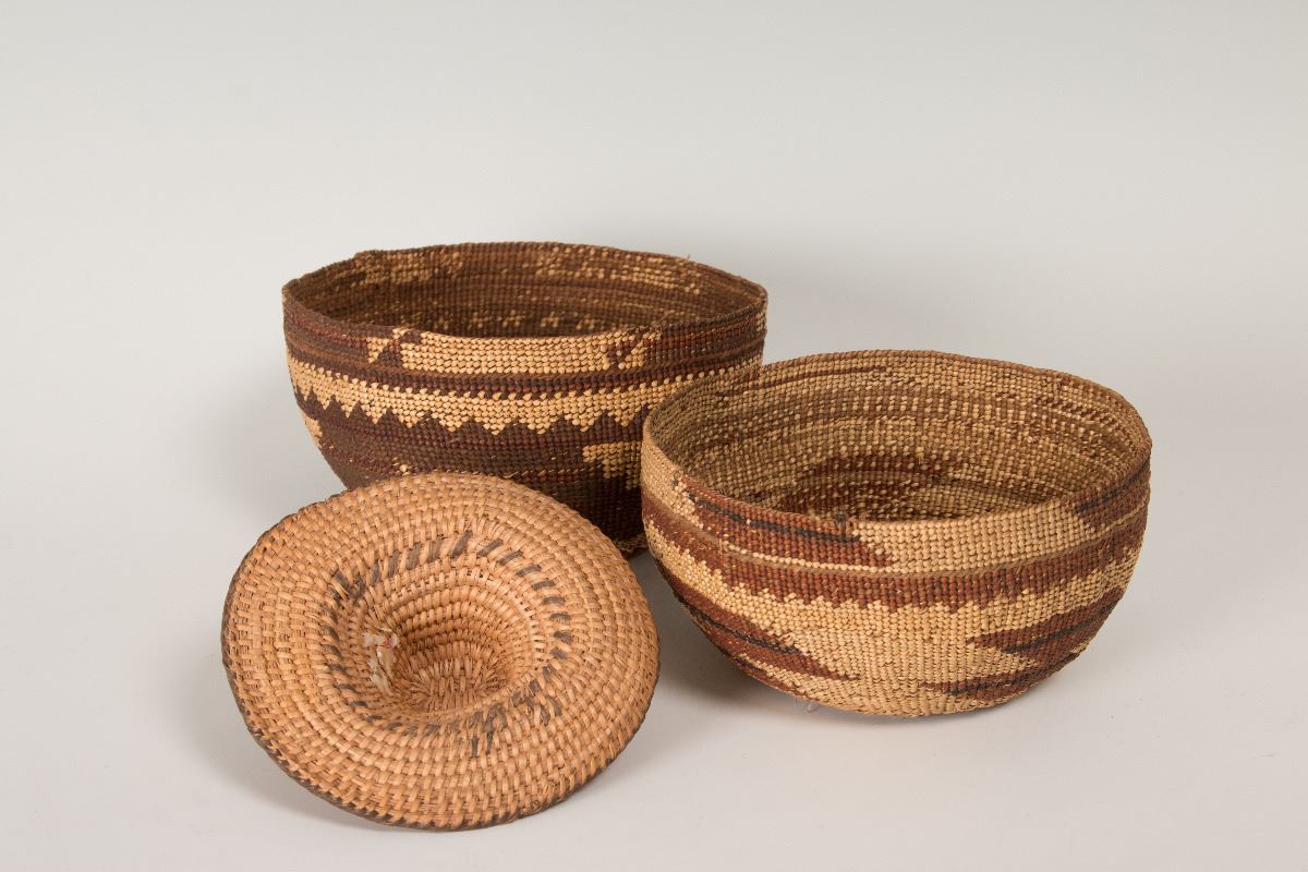 Group of Three Baskets. 1) Hupa Basketry Hat. 4" x 7" with nice color and shape. 2) Hupa Basketry Hat. 3" x 6" with good color and shape. 3) Papago Miniature Basketry Hat. 2" x 5". Circa 1930s.