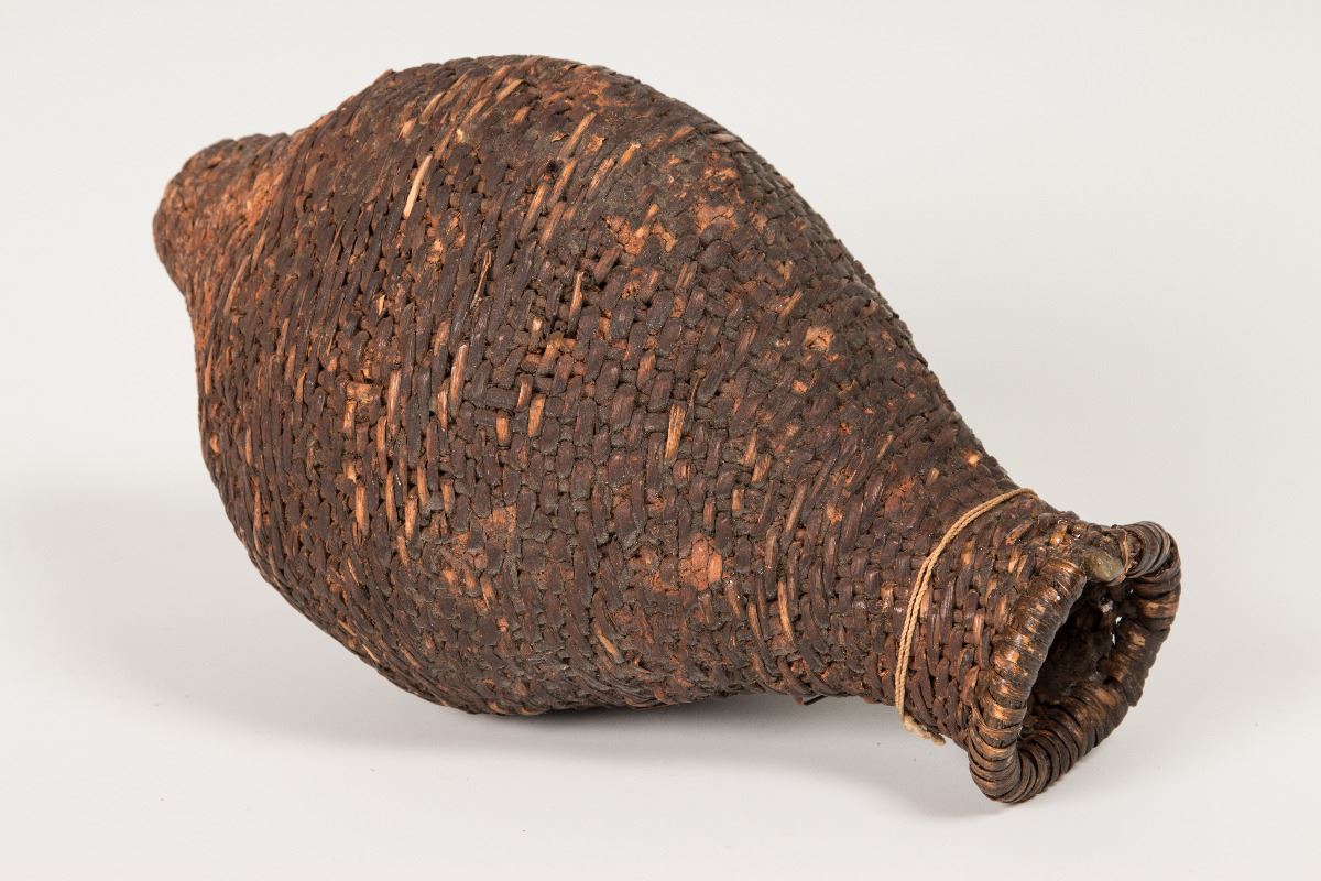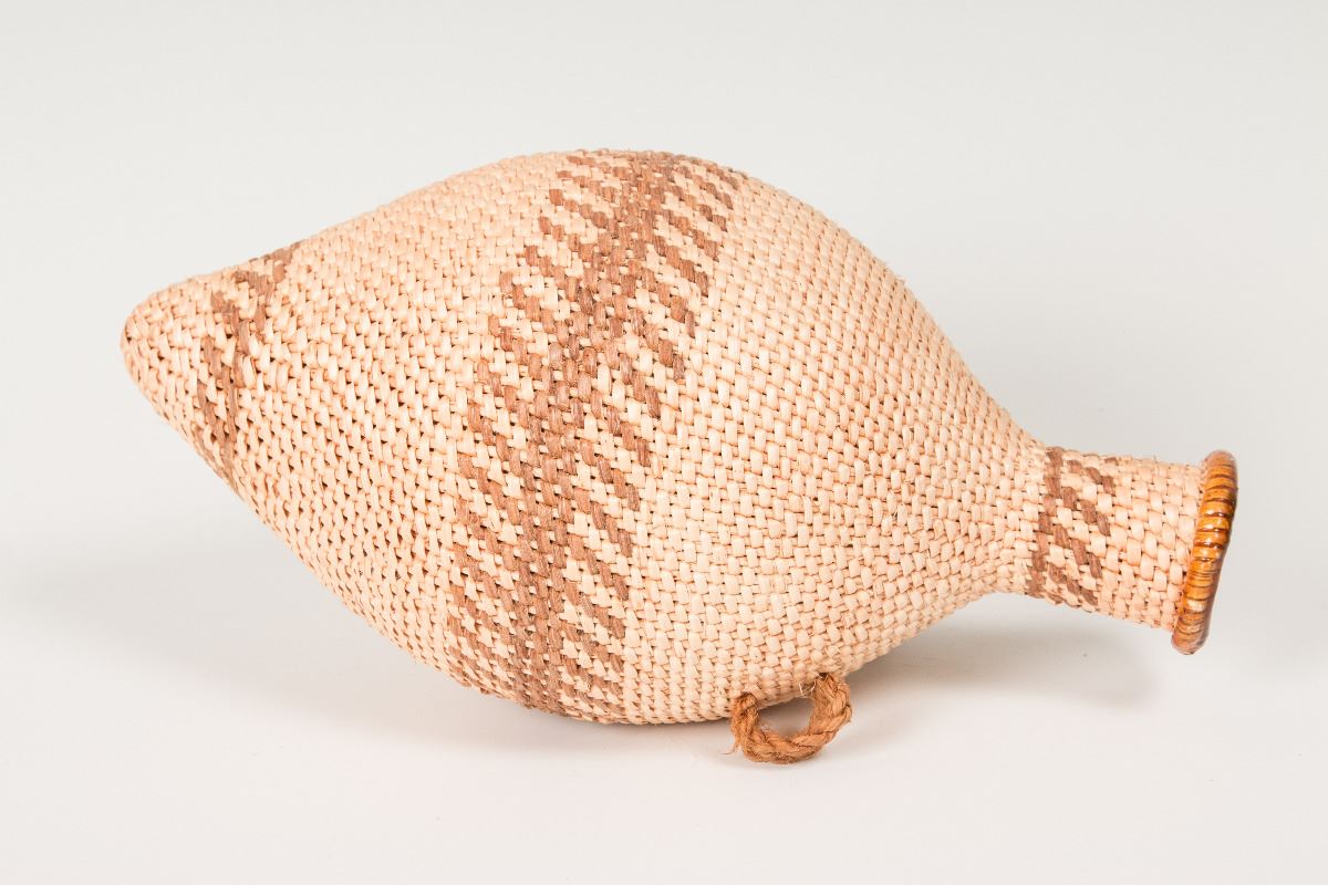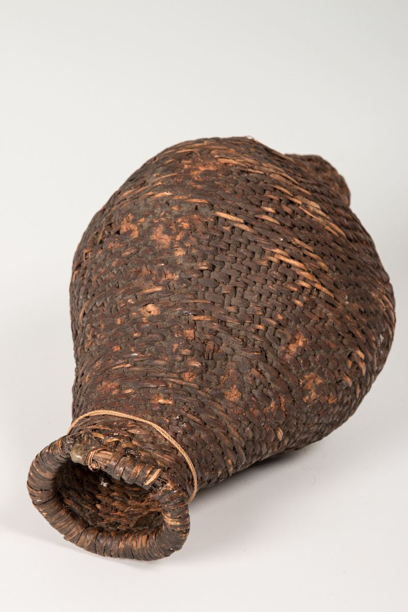 8" x 6 ¼". Contemporary. 2) Paiute Pitched Water Jug by Everett Pikyavit. 11 ½" x 6". Contemporary. Includes Second Place ribbon from the SWAIA, 83rd Santa Fe Indian Market for Artist's Duplicate. 3) Apache Tus. 8" x 6 ¼". Pine pitch covered basket.