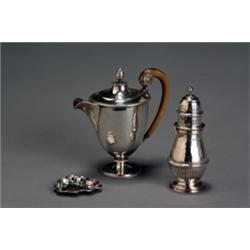 Consisting of a coffeepot, James Deakin & Sons, Sheffield, 1919; a Britannia standard caster, Z. Barraclough & Sons, London, 1909; and a Britannia standard small shaped tray, maker's marks EJL, London, 1935.
