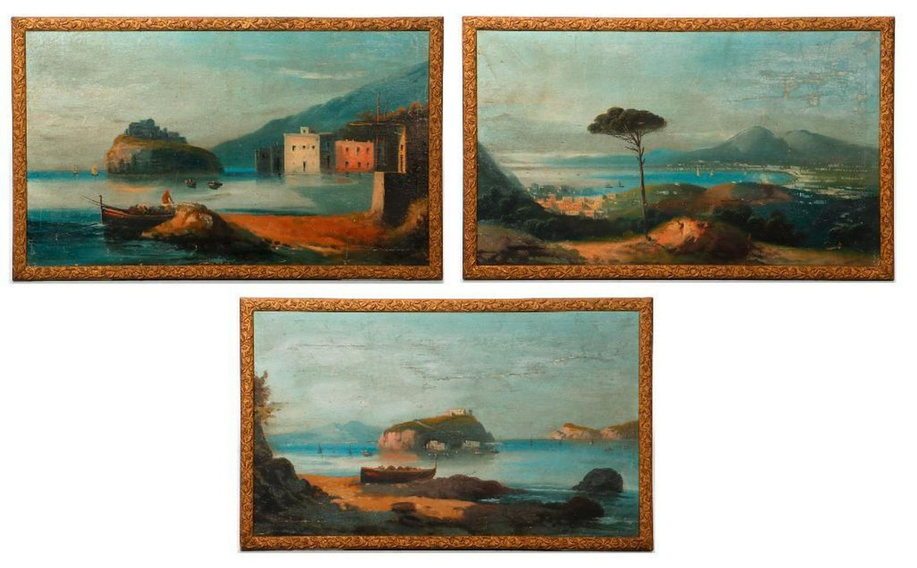Artist: Unknown. Title/Subject: Group of Three Landscapes of Coastal Towns with Boats. Size: Each, 13in x 22in (image); Each, 15in x 24in (framed). Year Created: C. 1900s. Signature: Unsigned. Medium/Ground: Oil on Canvas. Paint loss. Scratches, cracks and other visible surface imperfections. Condition Report: All lots are sold as is and where is. Turner Auctions + Appraisals, LLC provides condition reports upon request to aid in your bidding decision. No statement regarding age, condition, kind, value, or quality of a lot, whether made orally at the auction or at any other time, or in writing in this catalog or elsewhere, shall be construed to be an express or implied warranty, representation, or assumption of liability. All sales are final, Turner Auctions + Appraisals, LLC does not give refunds based on condition. Turner Auctions + Appraisals, LLC does not perform any shipping or packing services. We do have a list of suggested shippers who gladly provide quotes prior to your bidding. Please visit our webpage for a list of recommended shippers.