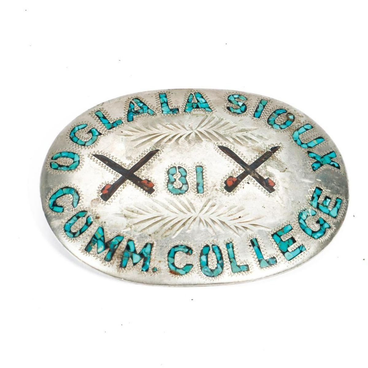 Group of three accessories consisting of a Belt Buckle from Oglala Sioux Community College with inlaid Turquoise and Two Hat Bands, one Navajo and one Mexican. Measuring: 3 1/4in x 4 1/4in. Belt Buckle, Hat Band 25in and 26 1/2in. Belt Buckle has dirt on front and back. Stamped VERO on the back. Hat Bands are both stamped too. The Mexican one has MEXICO stamped on it and the Navajo one is stamped and marked as sterling. Condition Report: All lots are sold as is and where is. Turner Auctions + Appraisals, LLC provides condition reports upon request to aid in your bidding decision. No statement regarding age, condition, kind, value, or quality of a lot, whether made orally at the auction or at any other time, or in writing in this catalog or elsewhere, shall be construed to be an express or implied warranty, representation, or assumption of liability. All sales are final, Turner Auctions + Appraisals, LLC does not give refunds based on condition. Turner Auctions + Appraisals, LLC does not perform any shipping or packing services. We do have a list of suggested shippers who gladly provide quotes prior to your bidding. Please visit our webpage for a list of recommended shippers.