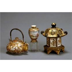 The first, a melon-form teapot depicting on opposing sides two groups of five boys dressed in elaborate robes, unmarked; the second, a miniature vase depicting a lady in a landscape and a floral scene, signed with Shimazu circular family crest and Shuzan; the third, a rooftop-covered censer depicting women and girls in various settings against a cobalt blue ground, signed Kusube. The teapot with repaired blossom finial on lid and unraveling to the brass filigree wire insulator handle; the censer with firing crack to base.