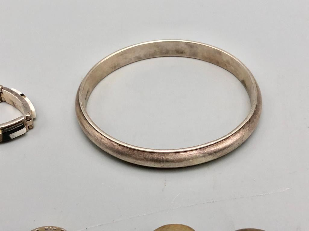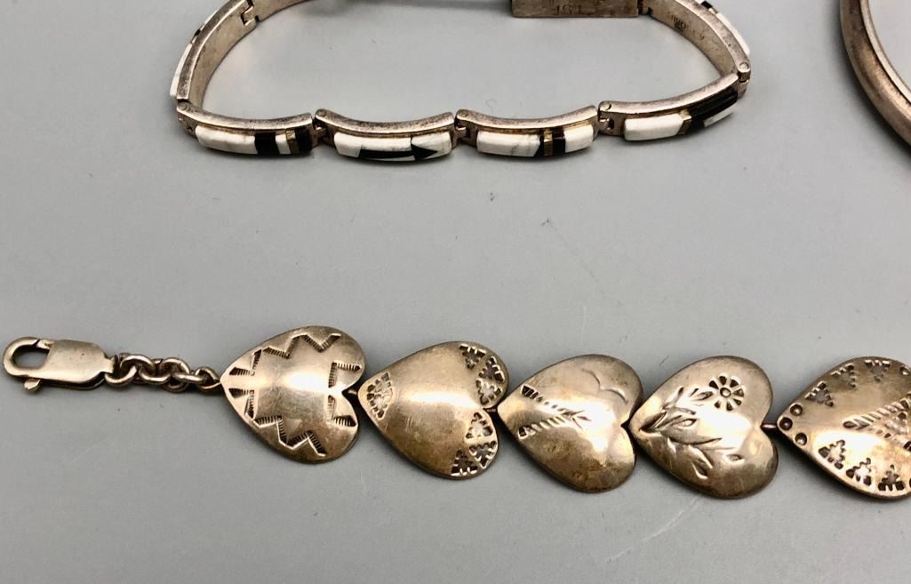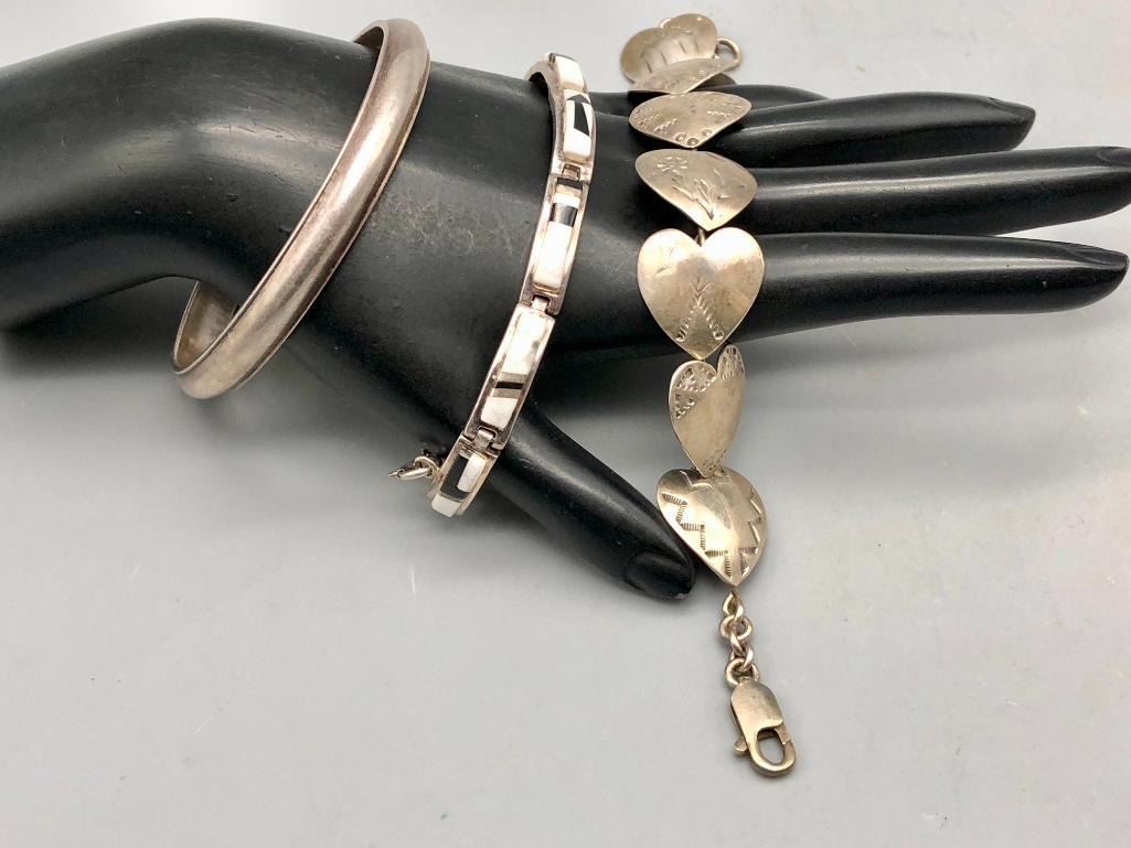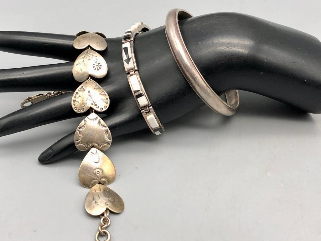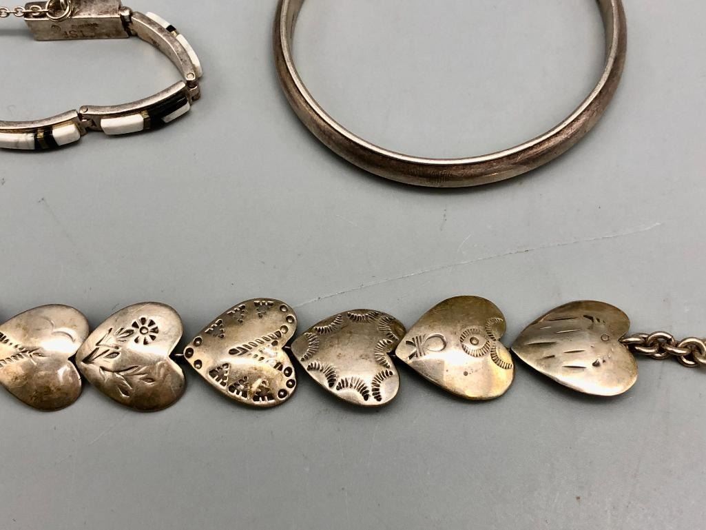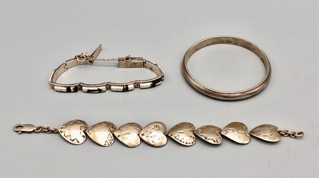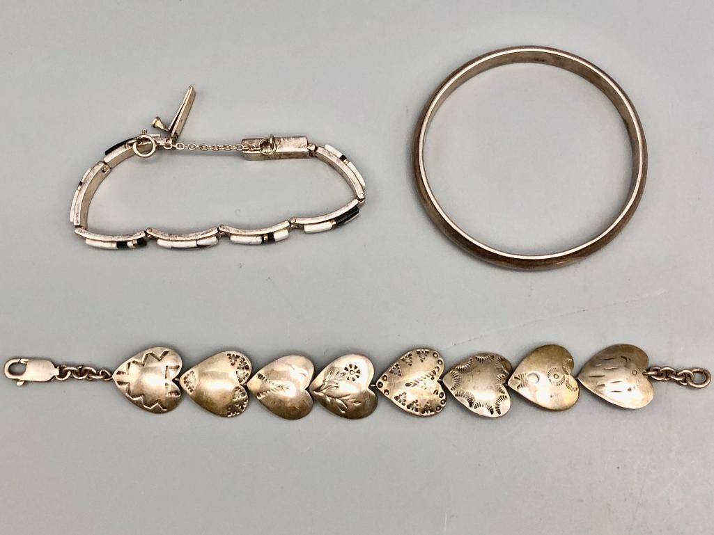 Presented for sale in this lot is a group of three sterling silver bracelets. All are various sizes and styles. One bracelet is set with stones in an inlay design. They are all made from sterling silver. MAKER: Various. APPROX AGE: Vintage. SIZE: Various. Combined weight is 81.6 grams. CONDITION: Good for their age, normal wear expected. Please look closely at the pictures as they are an important part of our description and are hereby incorporated into the description, specifically with regards to condition. SHIPPING: There will be a $5 handling / packaging fee for shipping this lot. The actual cost of postage will be added on top of that. BUY IT NOW: If you would like to buy this item now, without waiting for the auction day to bid on it, we do offer this option (which is available up to 48 hours before the actual auction starts). The “Buy it Now†price is the high estimate of this lot (plus applicable fees and the Buyer's premium is discounted to 10% when using the Buy it Now option). If you would like to exercise this option, you must contact us by email (or phone as long as you talk to someone live). Reference this lot number and your intention to "Buy it Now."