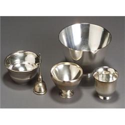 Consisting of a Revere-type bowl, a footed bowl and a bowl; each with engraved conjoined script monogram. Together with a Tiffany & Co. oil can-form vermouth dispenser, late 20th century. Each impressed with factory mark. Each bowl with light scratching to surface.