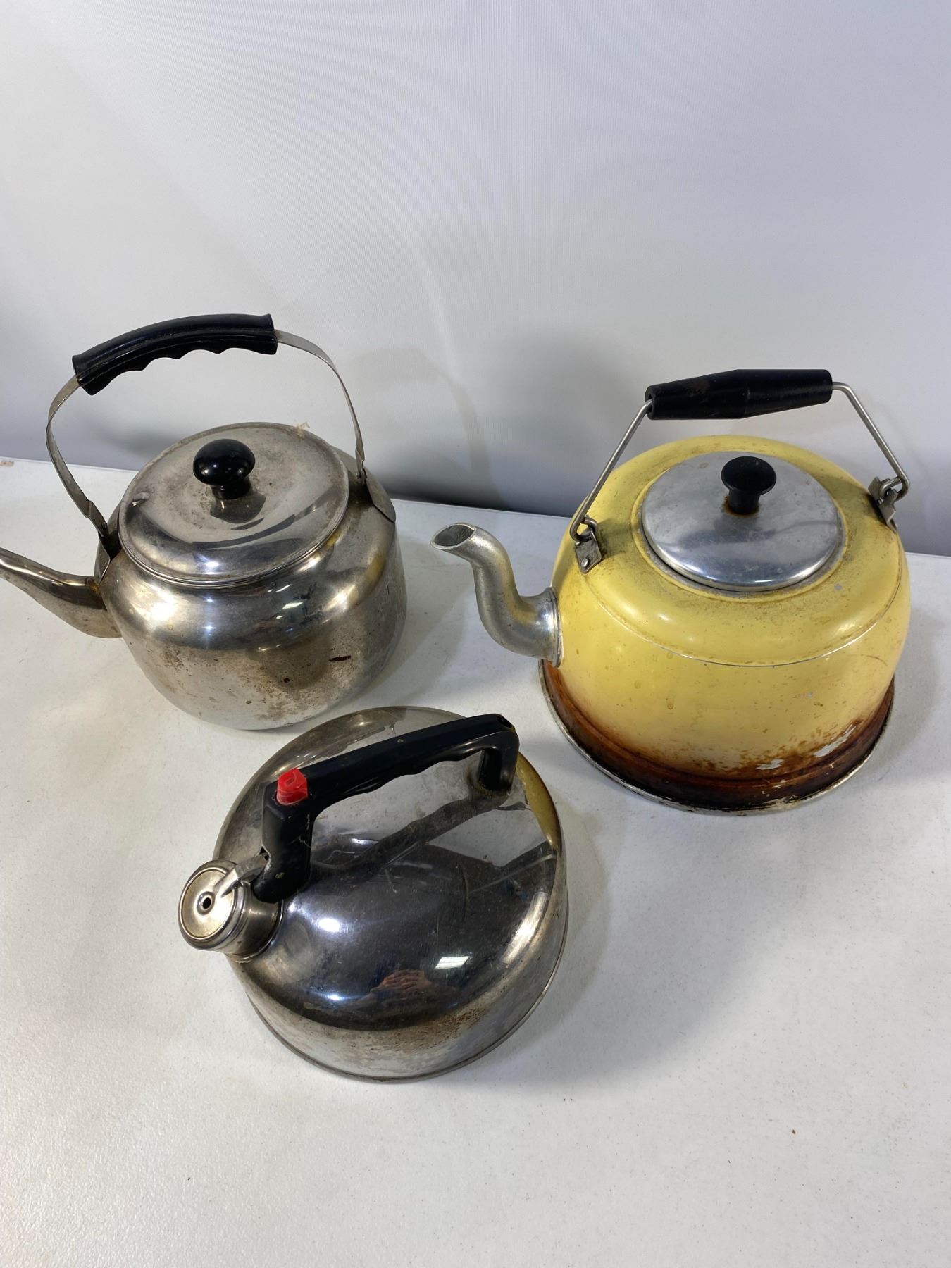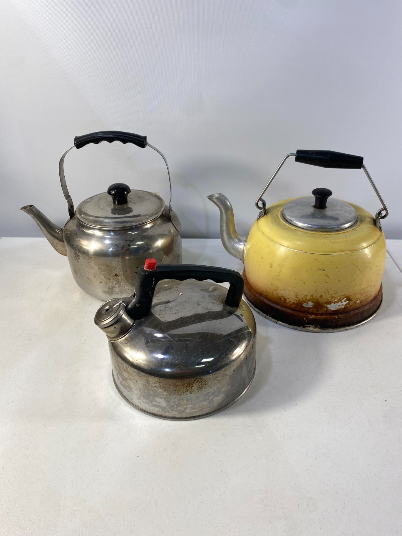 A practical and collectible trio of vintage metal tea kettles, each with classic mid-20th-century styling and well-earned character from decades of use. These kettles show surface wear and patina, making them great for display, rustic decor, or restoration projects. Condition as found; appears untested.