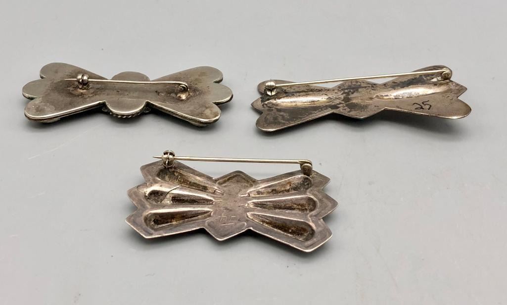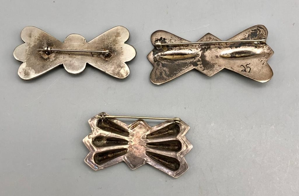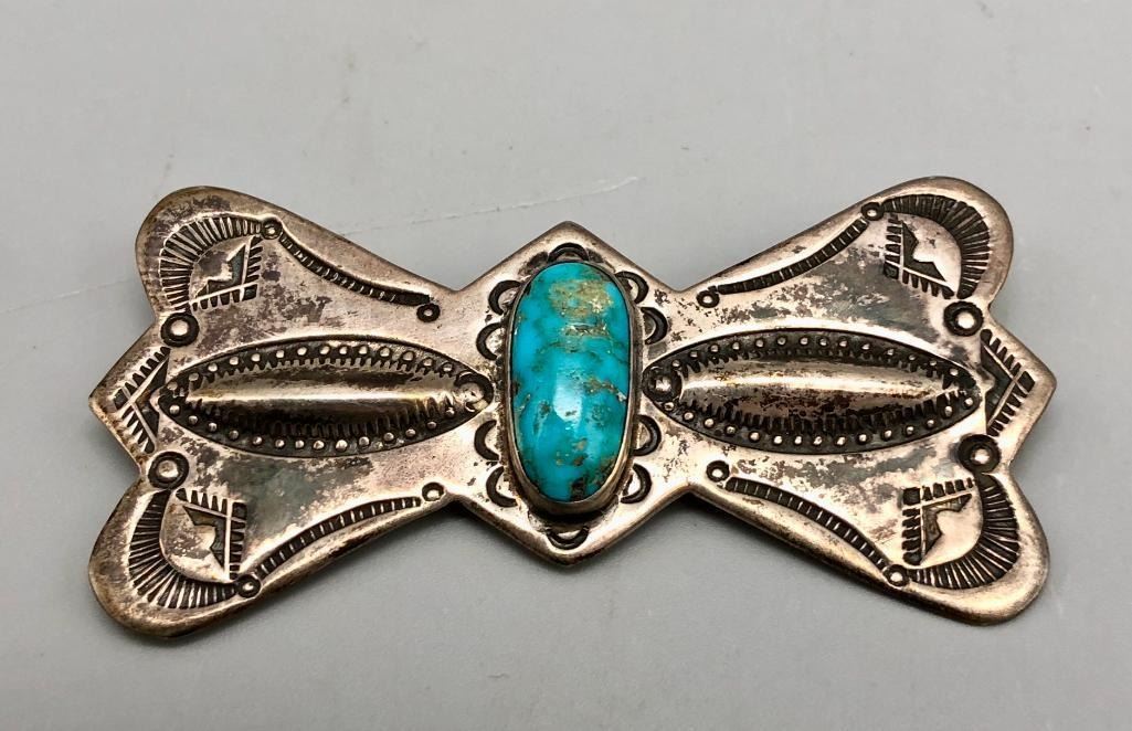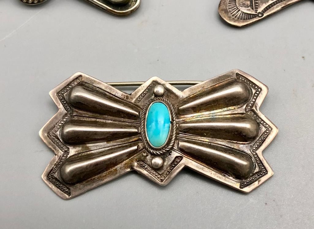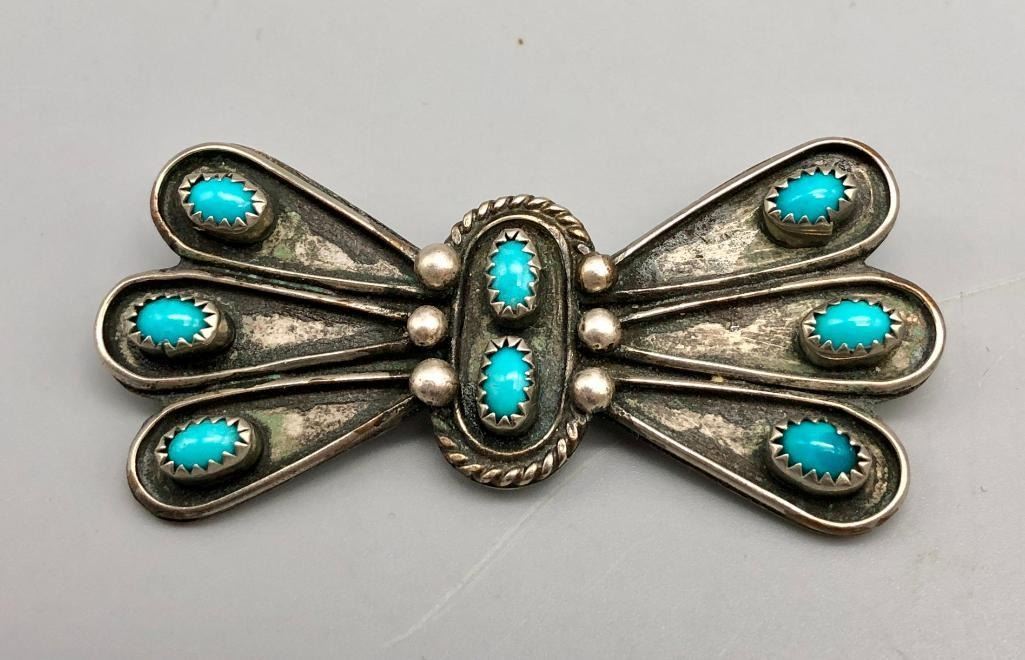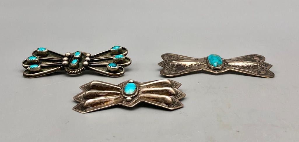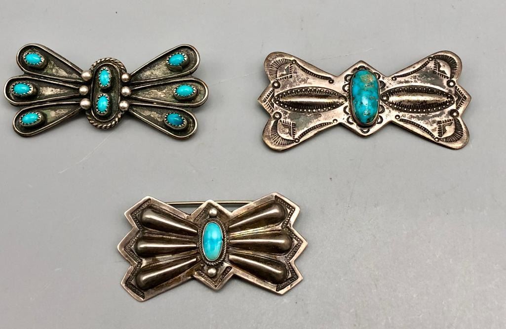 Offered for sale in this lot is a group of three vintage sterling silver and turquoise pins. These are beautiful pins that look like butterfly conchos. They are all set with turquoise stones, featuring great repousse, stamp work and fine silverwork. All are made from sterling silver. MAKER: Unmarked. APPROX AGE: Vintage. SIZE: Various. Combined weight is 47.5 grams. CONDITION: Good for their age, normal wear expected. Please look closely at the pictures as they are an important part of our description and are hereby incorporated into the description, specifically with regards to condition. SHIPPING: There will be a $5 handling / packaging fee for shipping this lot. The actual cost of postage will be added on top of that. BUY IT NOW: If you would like to buy this item now, without waiting for the auction day to bid on it, we do offer this option (which is available up to 48 hours before the actual auction starts). The “Buy it Now†price is the high estimate of this lot (plus applicable fees and the Buyer's premium is discounted to 10% when using the Buy it Now option). If you would like to exercise this option, you must contact us by email (or phone as long as you talk to someone live). Reference this lot number and your intention to "Buy it Now."