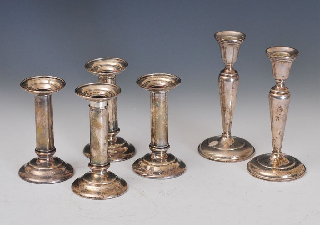 CONDITION REPORT: Tiffany candlesticks monogrammed and one with dings to bobeche, a few scattered dings throughout; one of Cartier has dings to base