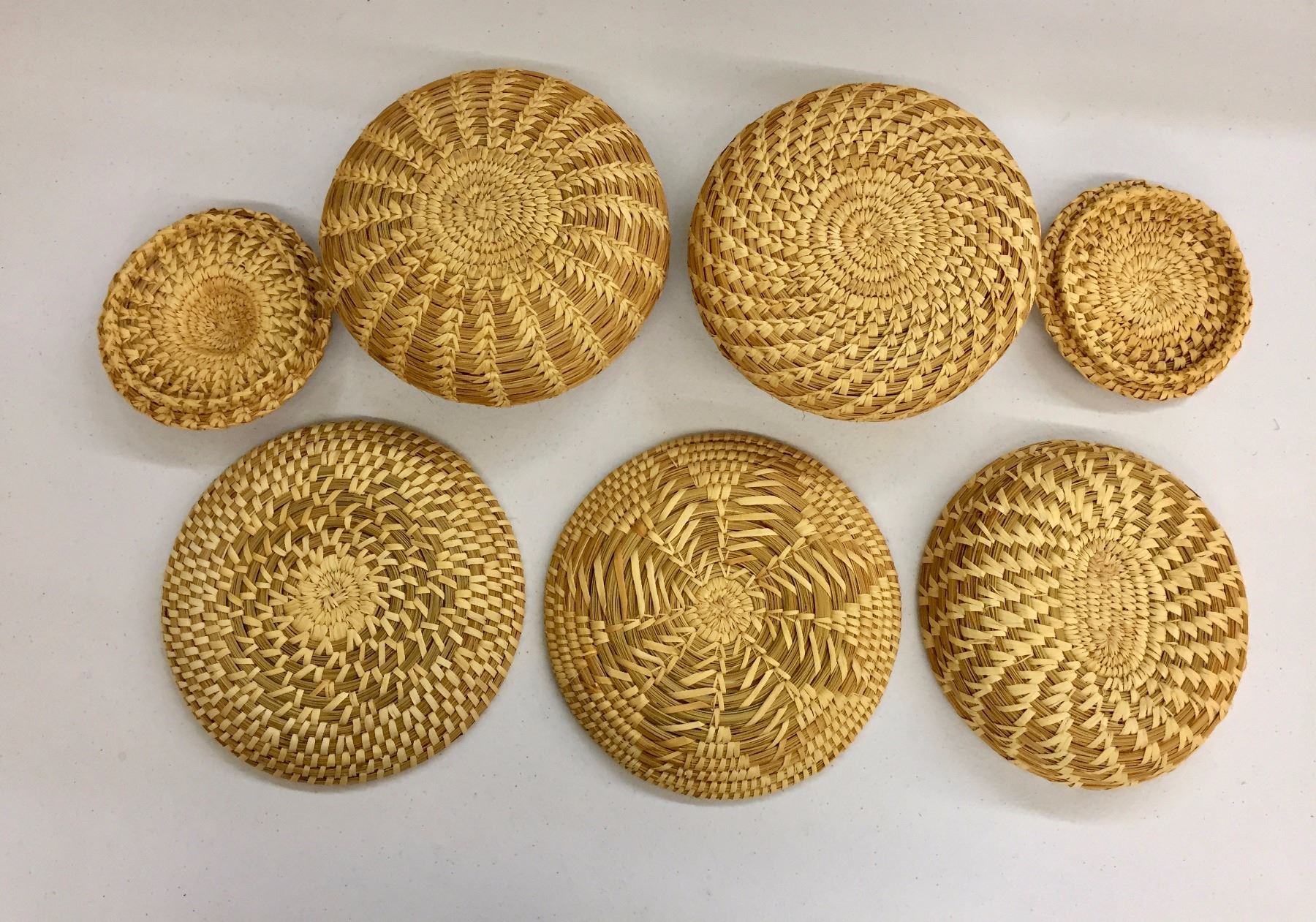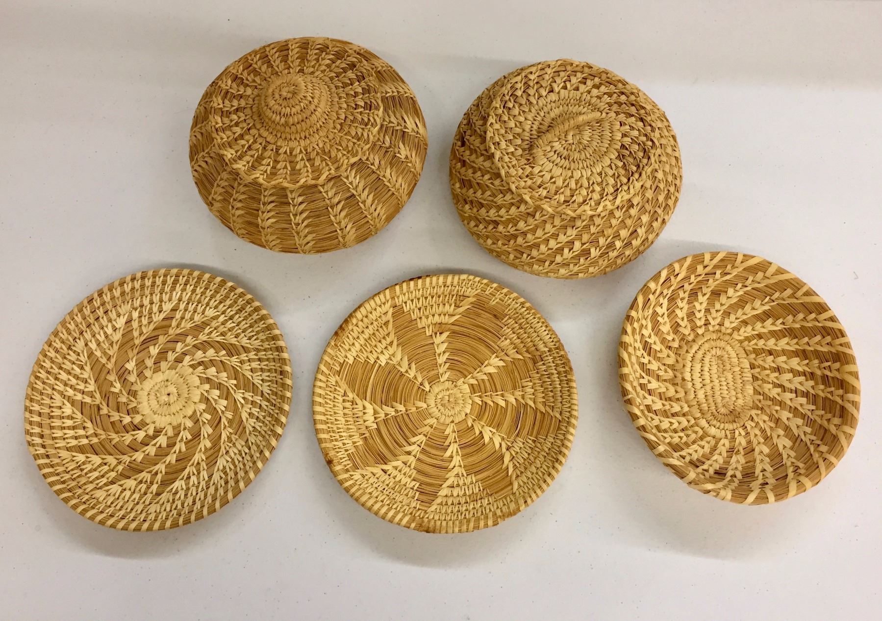 Description: Group of five Tohono O’odham baskets. Maker: Unknown Tohono O’odham weavers. Approx. Age: Circa 1970s. Size: Size range from 10” across x 4 1/2” deep to 9” across x 2 1/2” deep. Condition: Fair for their ages, normal wear and fading expected. Please look closely at the pictures - they are an important part of our description. Shipping: There will be a $10 handling / packaging fee for shipping this lot. The actual cost of postage will be added on top of that.