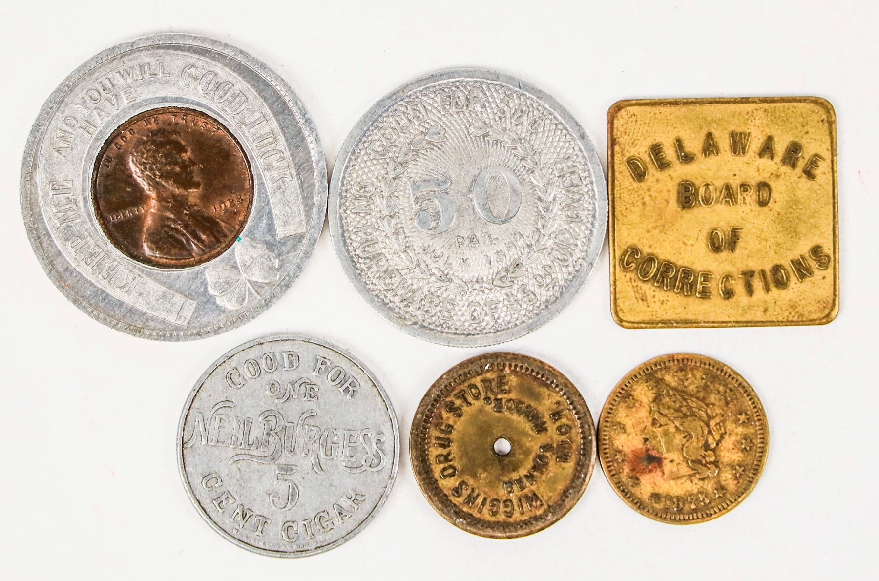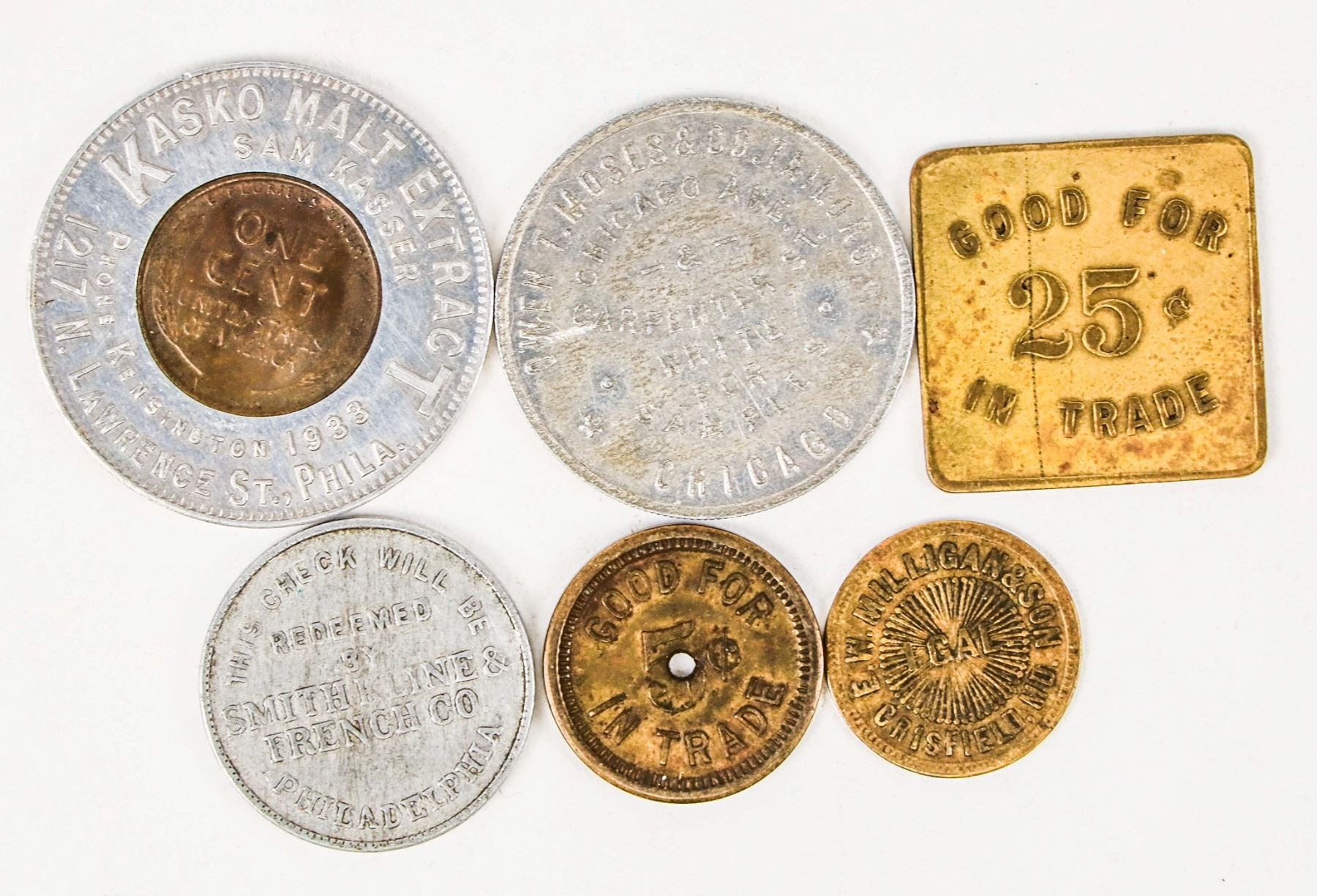 Lot of six items: 1) Encased Lincoln cent 1923, Kasko Malt Extract, Philadelphia. 2) Delaware Board of Corrections // Good For / 25c / In Trade; Br., Sq., 26 mm. 3) 1873 Liberty Head // E. W. Milligan & Son / 1 Gal. / Crisfield, Md.; Br., rd., 19 mm. 4) This Check Will Be / Redeemed / By / Smith Kline & / French Co. / Philadelphia // Good For / One / Neil Burgess / 5 / Cent Cigar; Wm, rd., 25 mm. 5) Wiggins Drug Store / Benton Harbor / Mich. // Good For / 5c / In Trade; Br., rd., 21 mm, center hole. 6) Owen T. Moses & Co. Tailors / Chicago Avenue / Carpenter Street / Write / For / Samples / Chicago; Wm, rd., 31 mm.