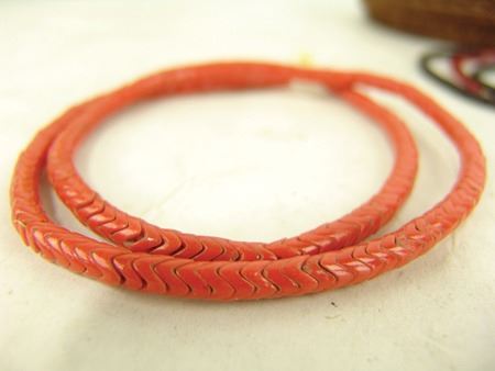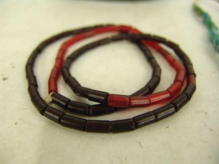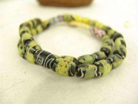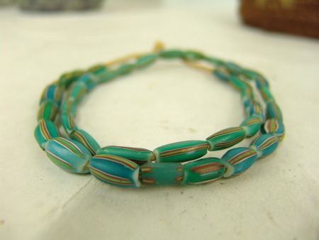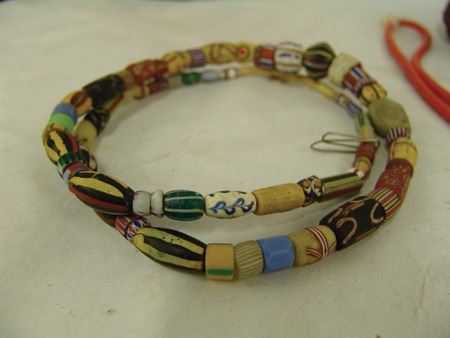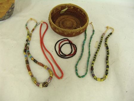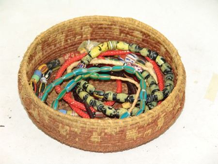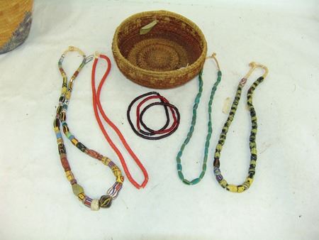 Early/Mid 1900s, Collection of five strands of vintage and antique milifiore, Venetian, etc. beads in a 1930s raffia basket. 2-1/2" x 7-1/4"
