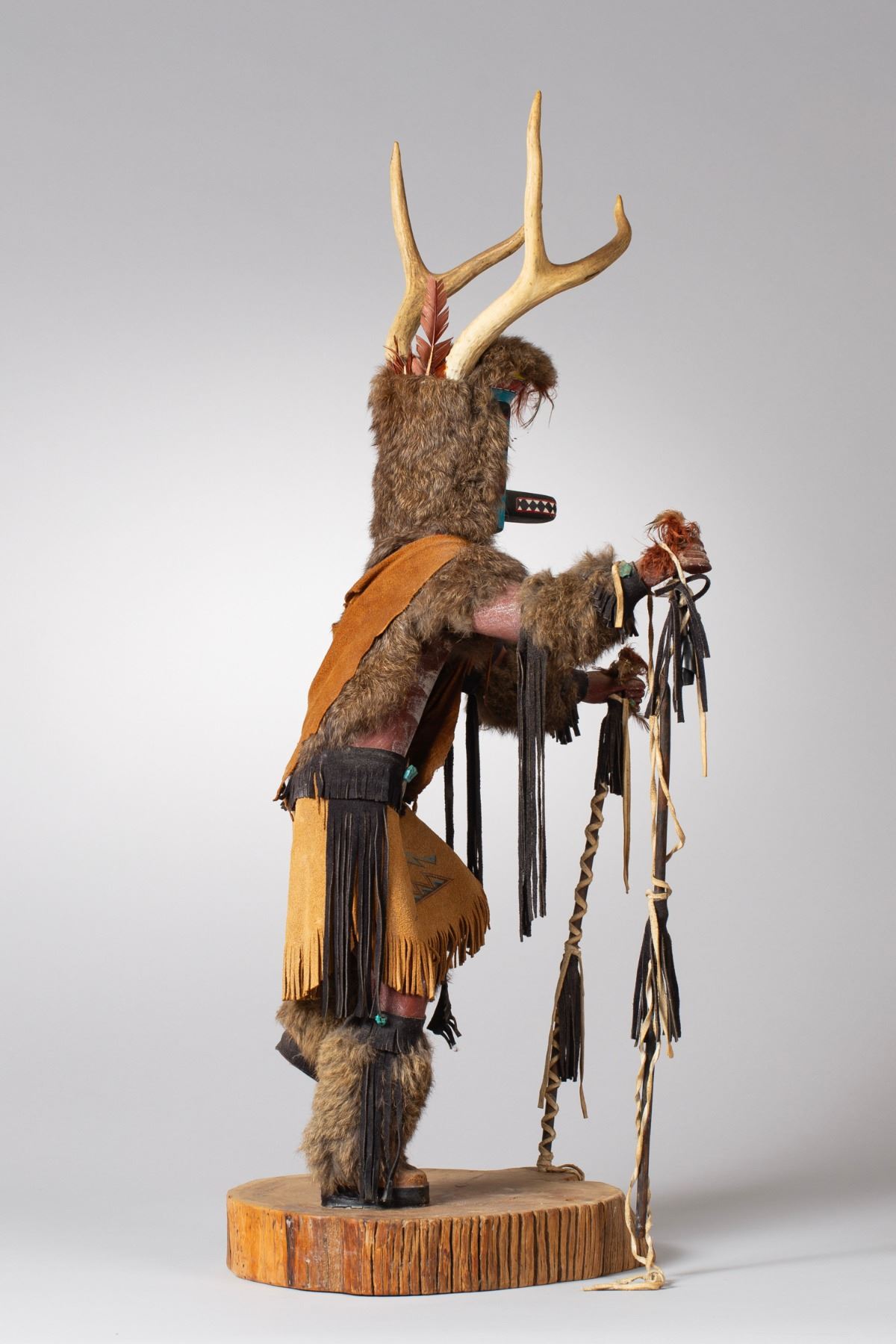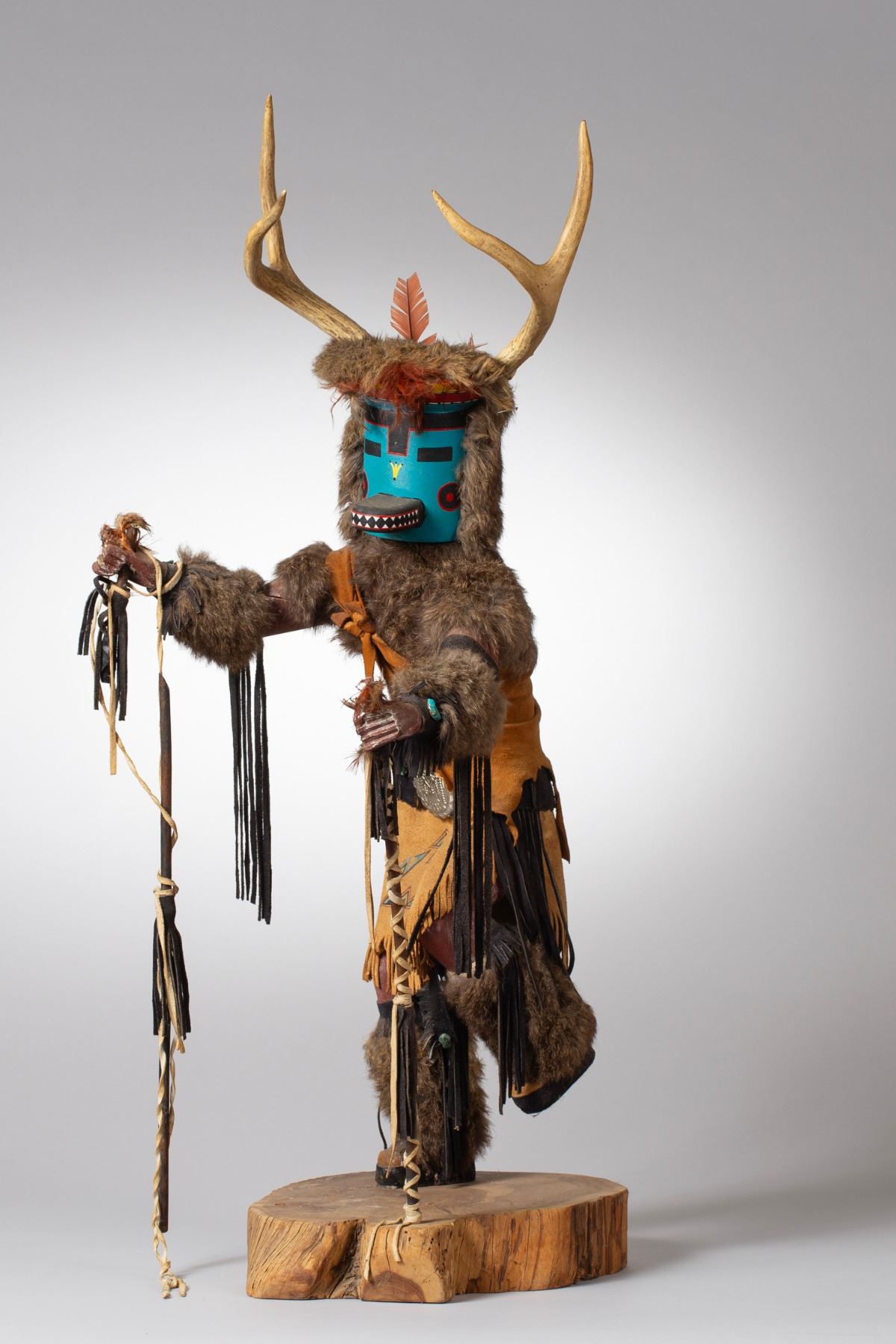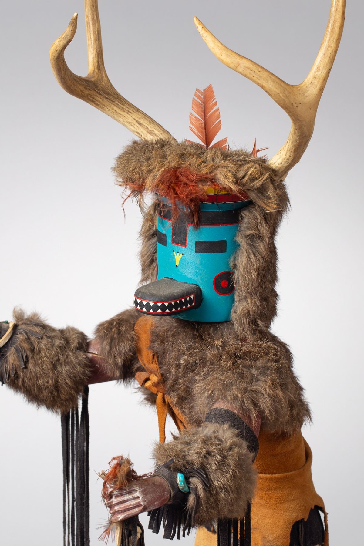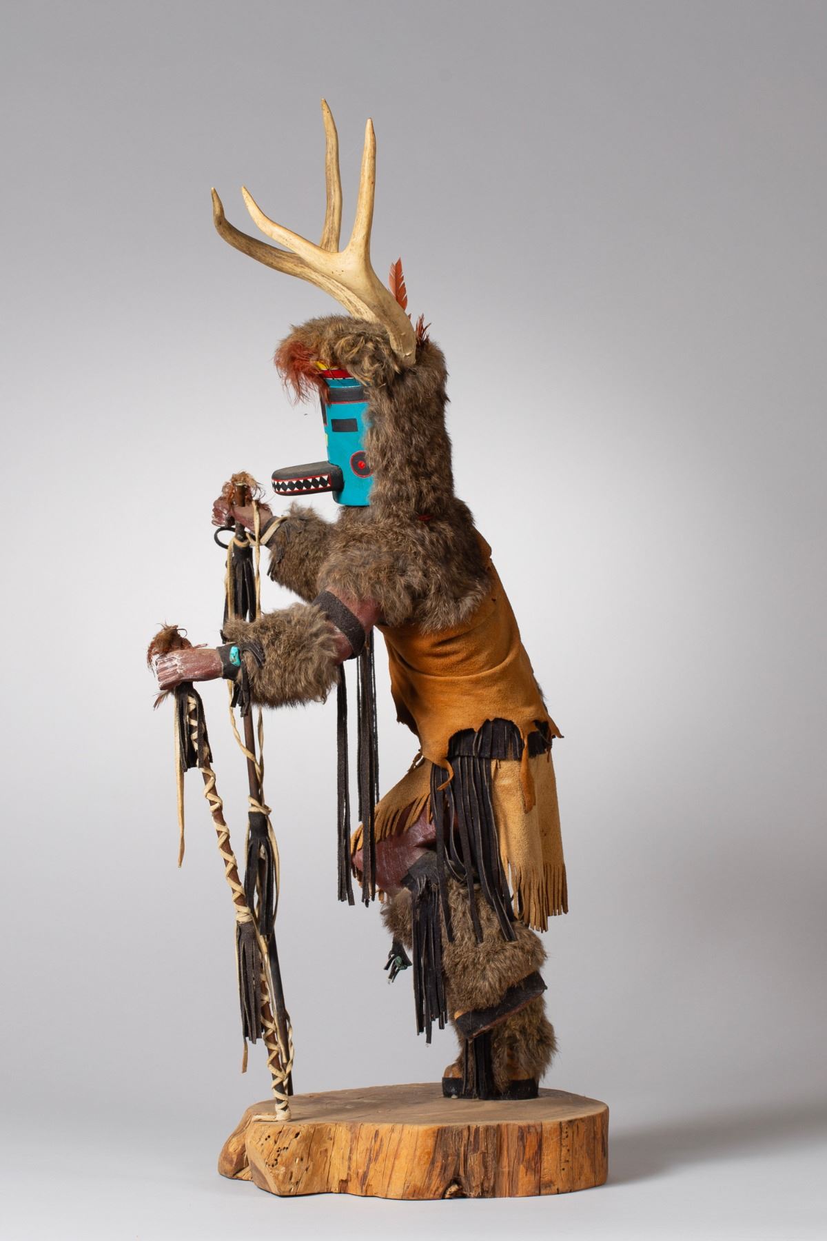 Hand carved from Cottonwood root, brightly painted and adorned with nice accents: antlers, staffs, and fur.