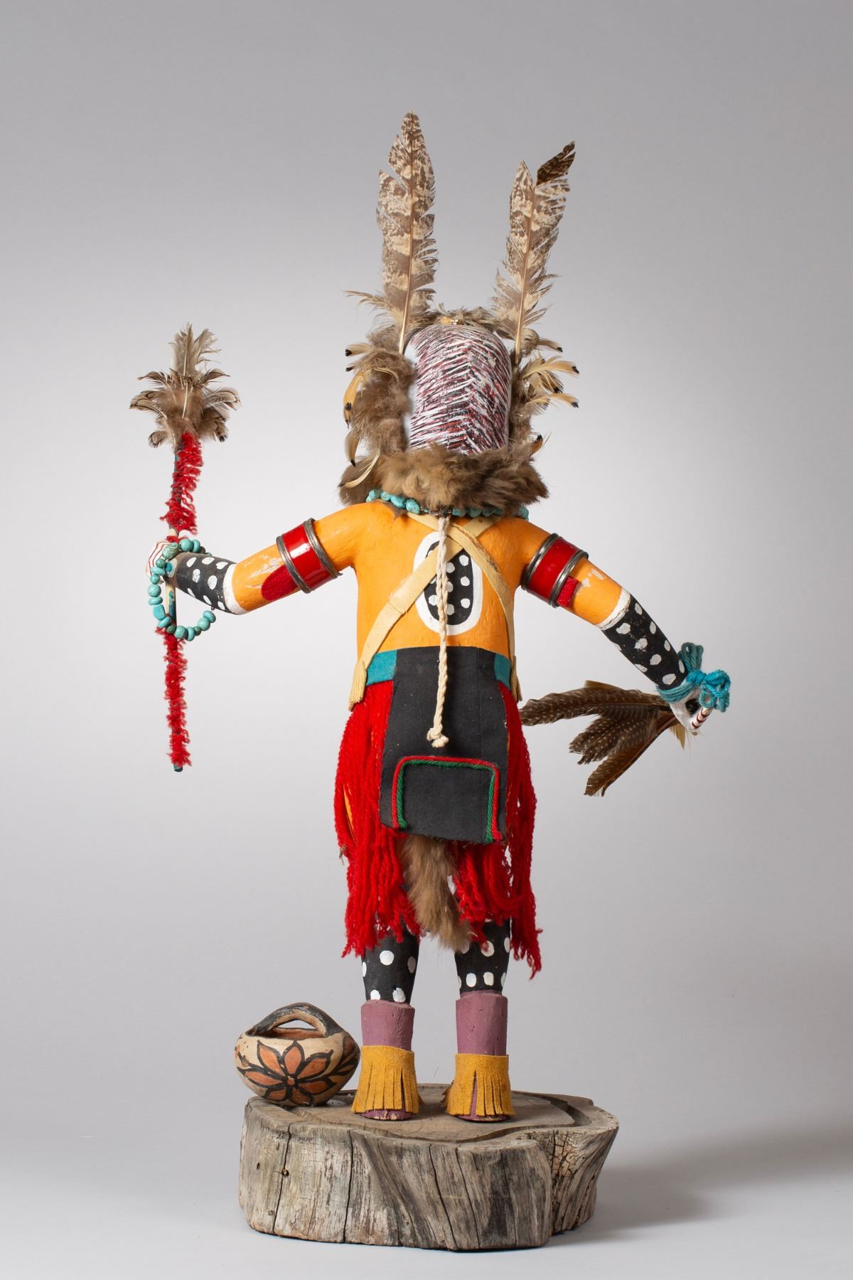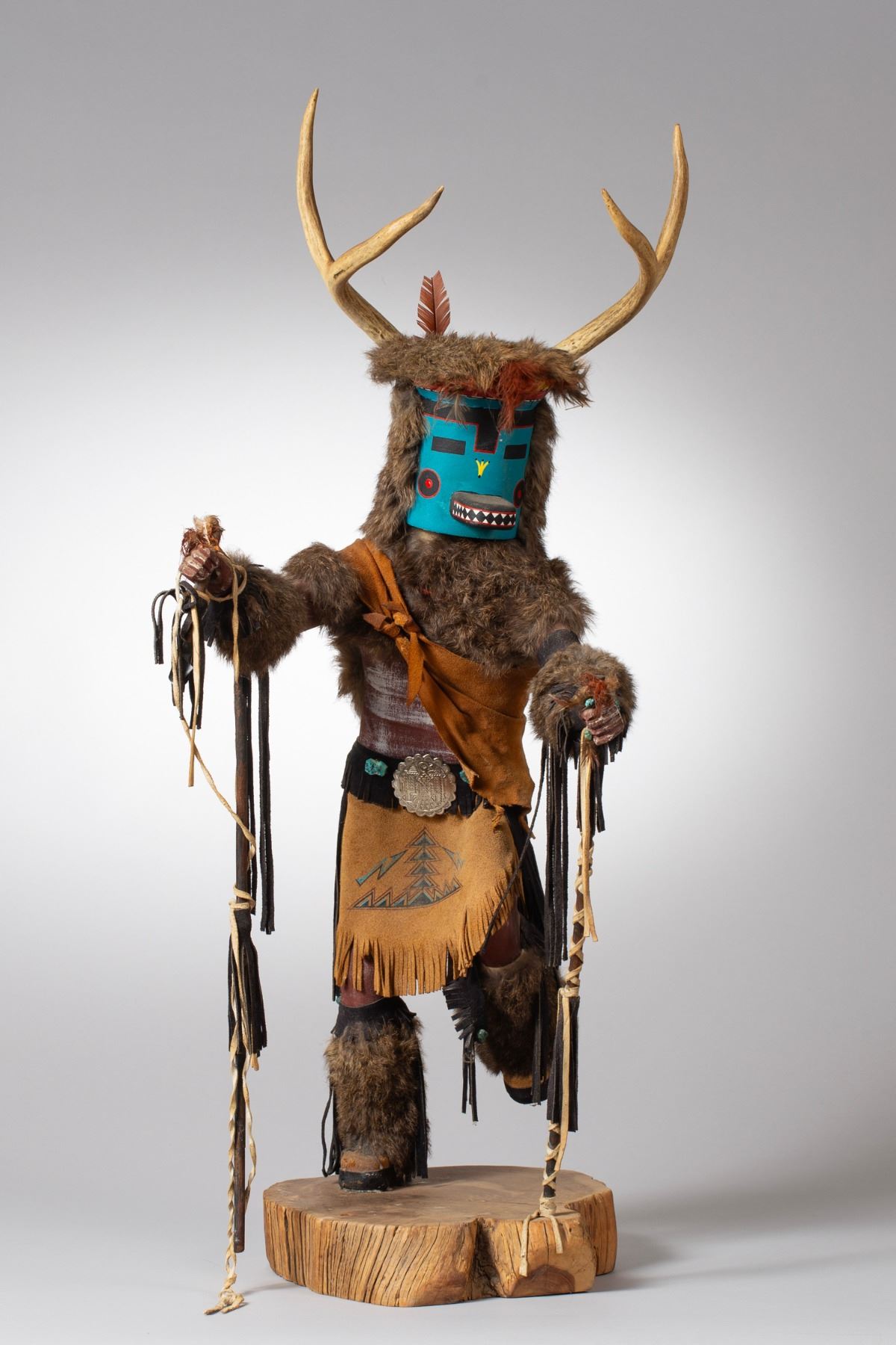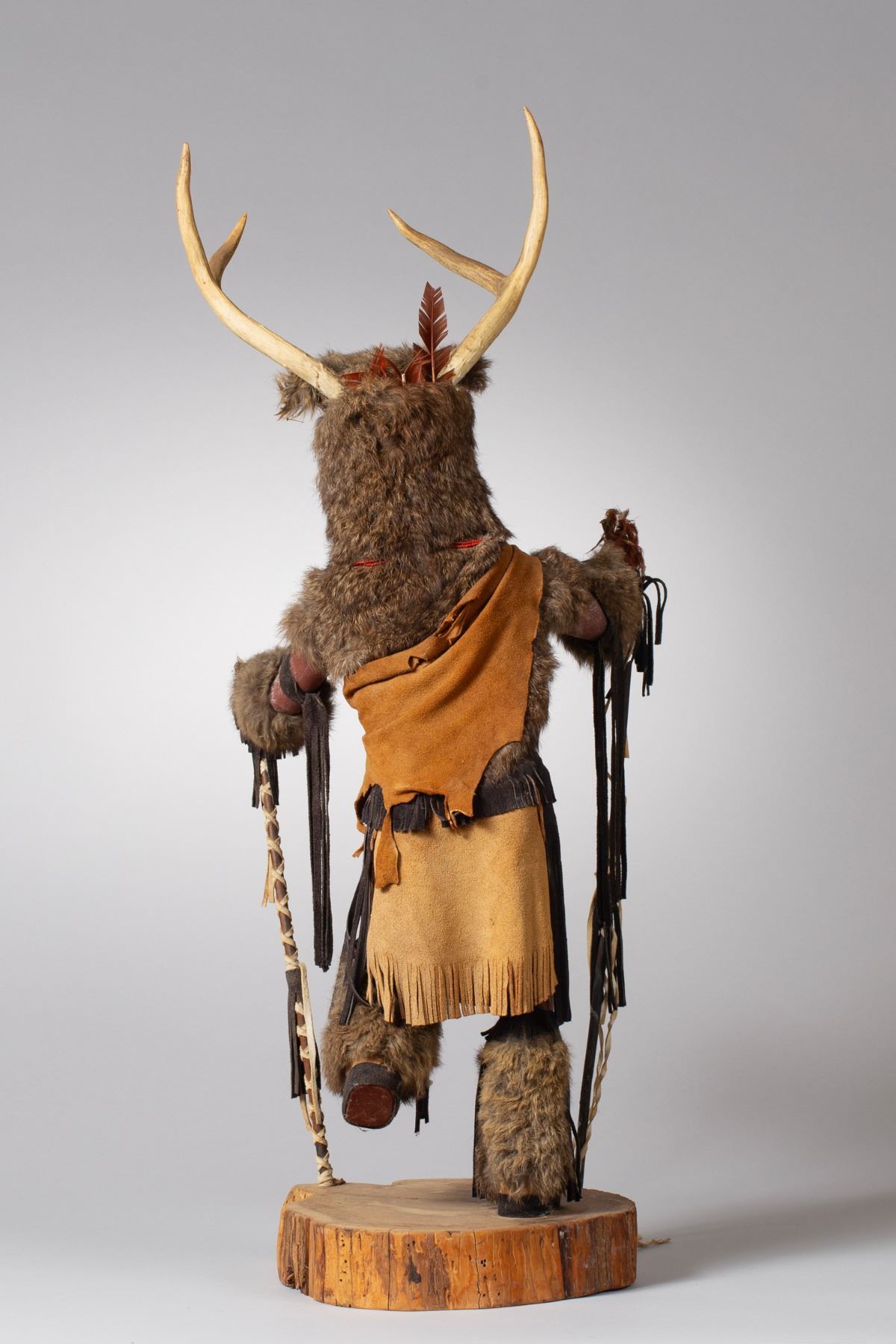 Hand carved from Cottonwood root, brightly painted and adorned with nice accents: antlers, staffs, and fur.