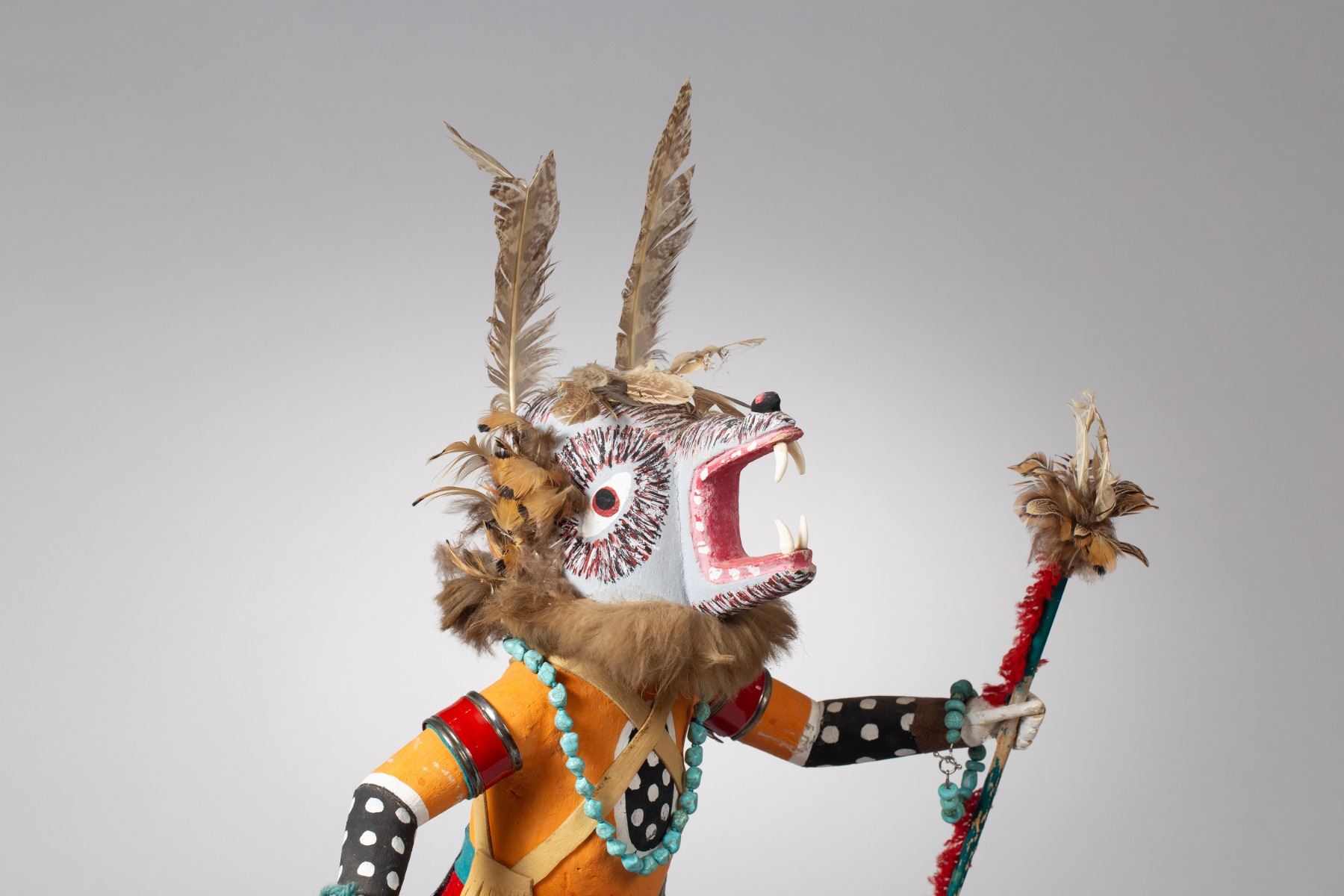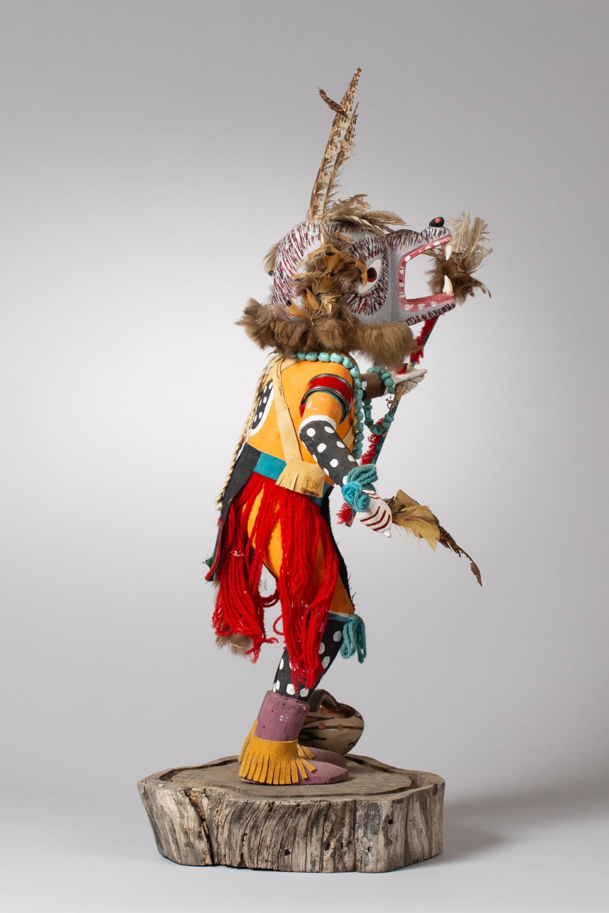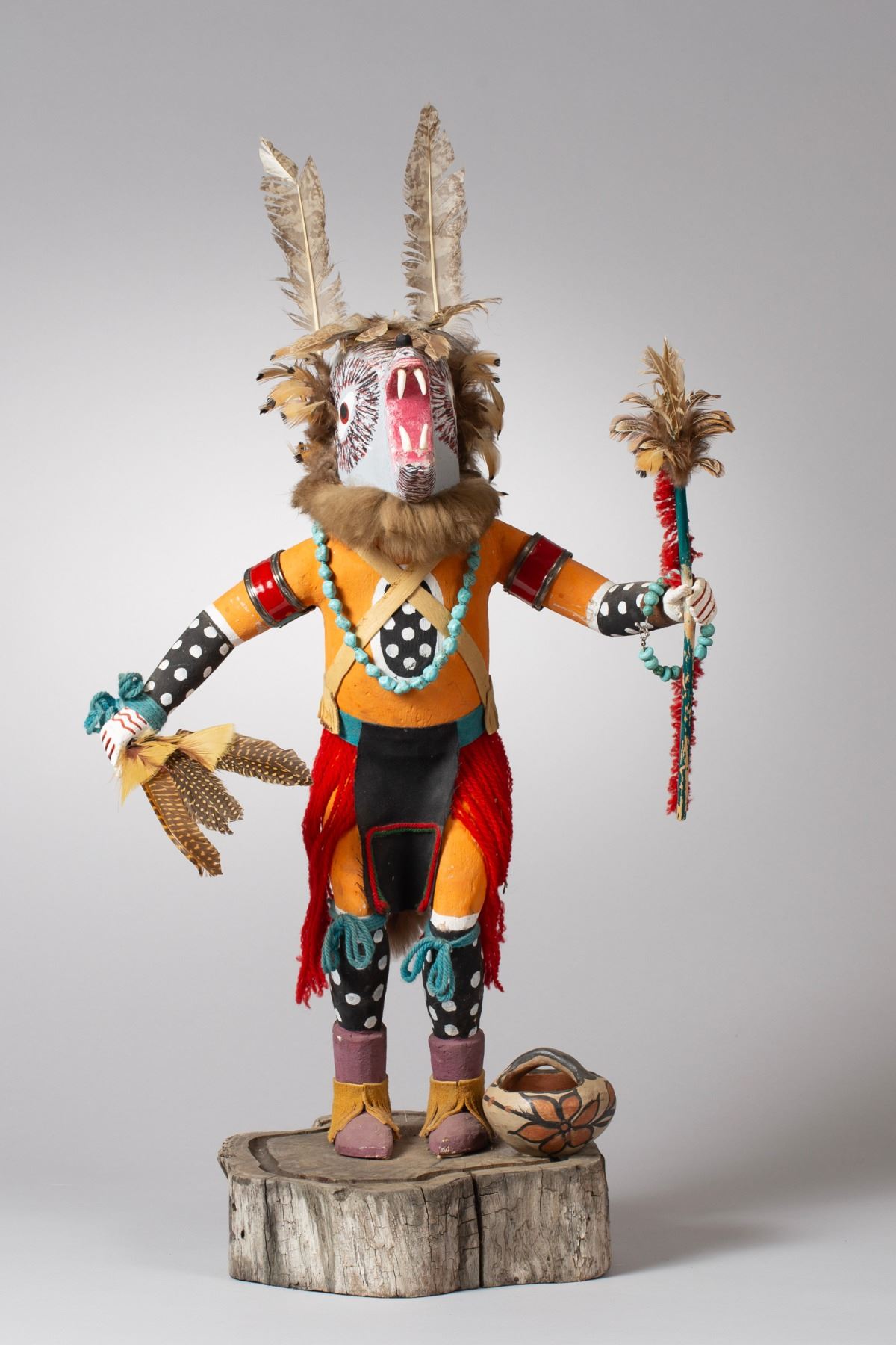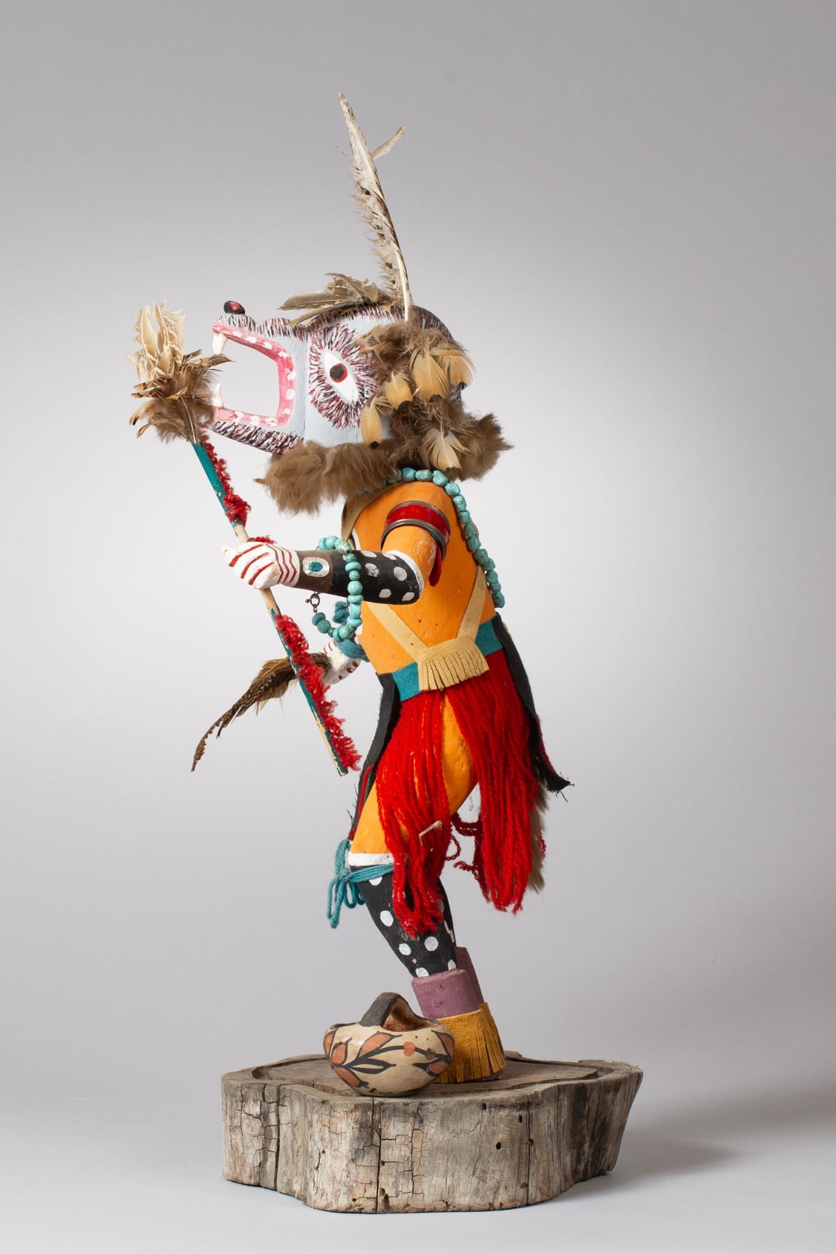 Hand carved from Cottonwood root, brightly painted and adorned with nice accents: antlers, staffs, and fur.
