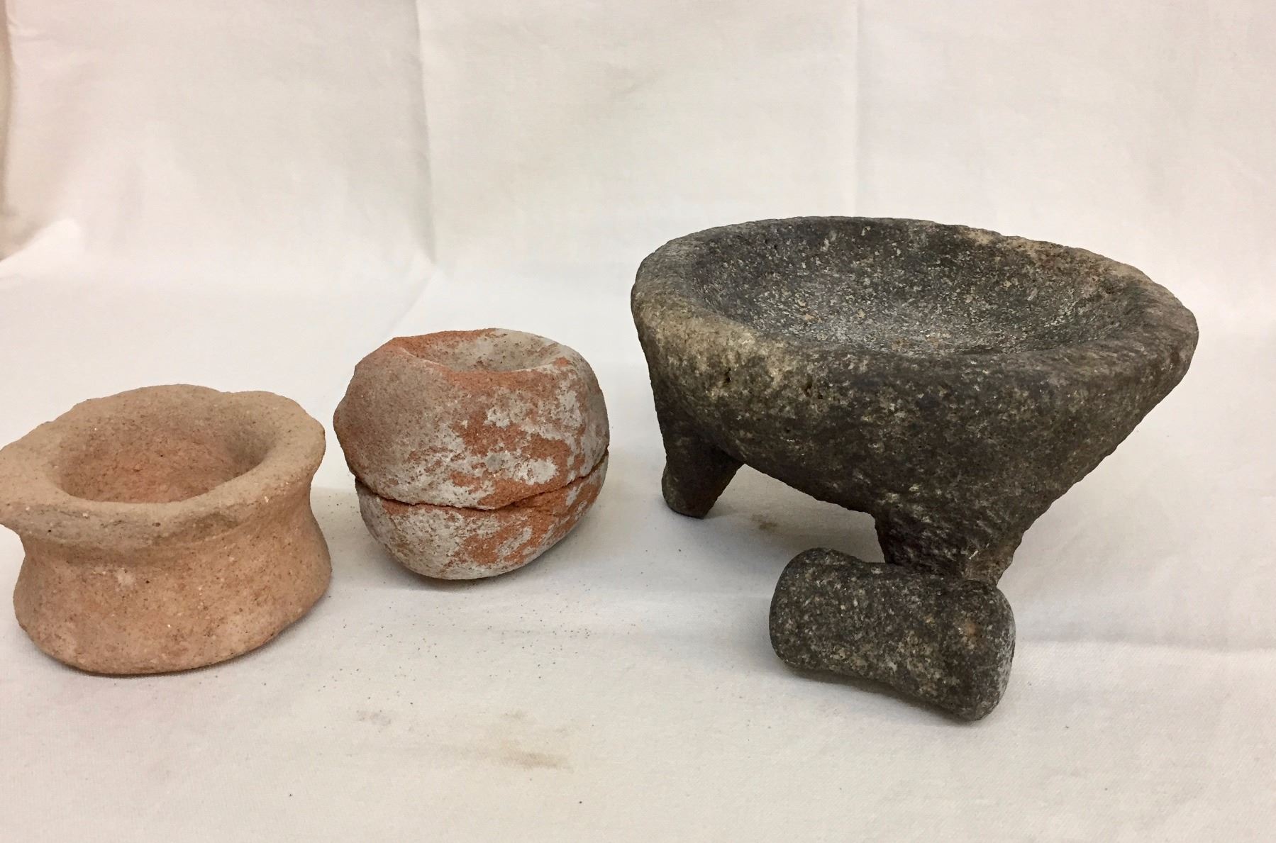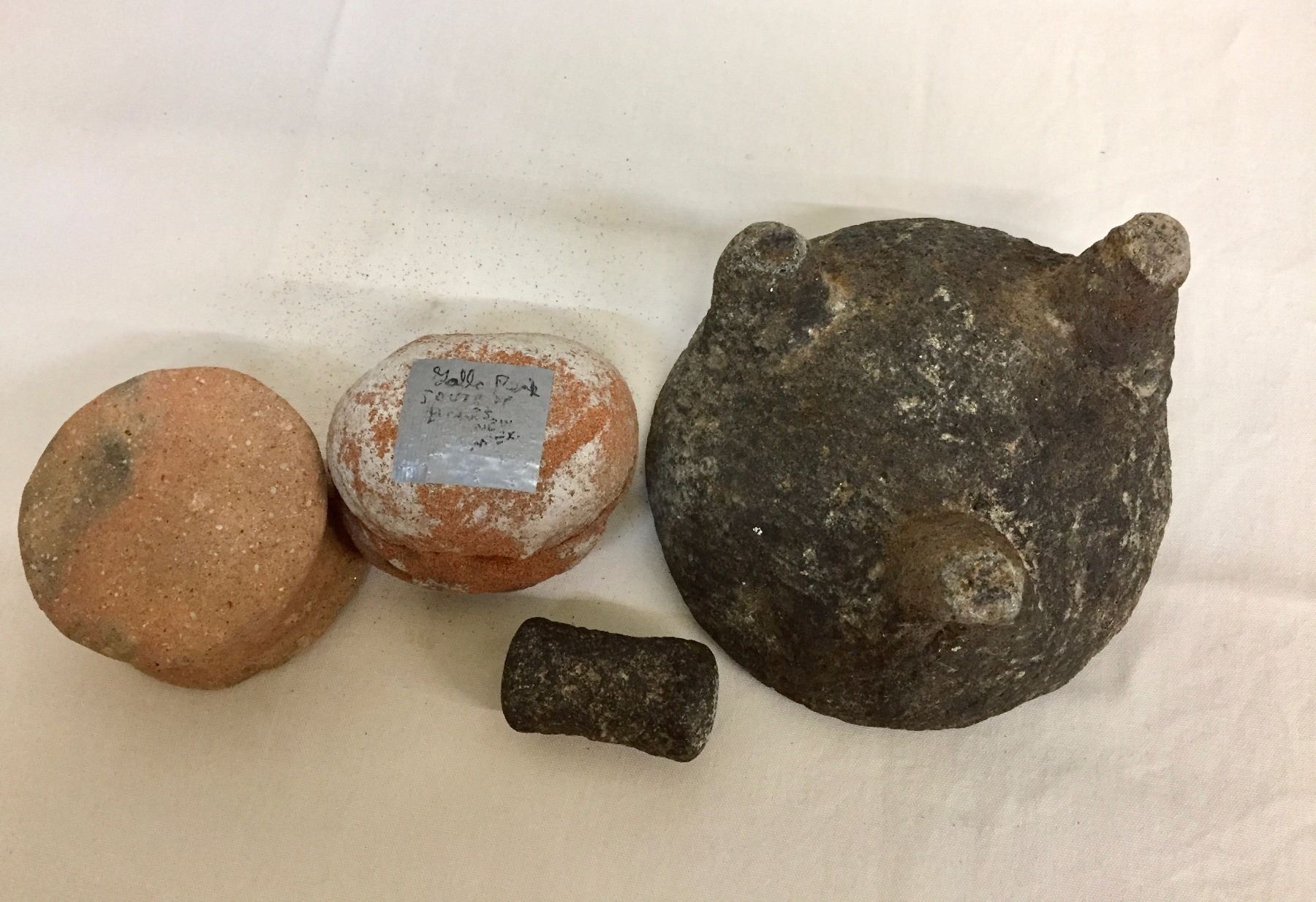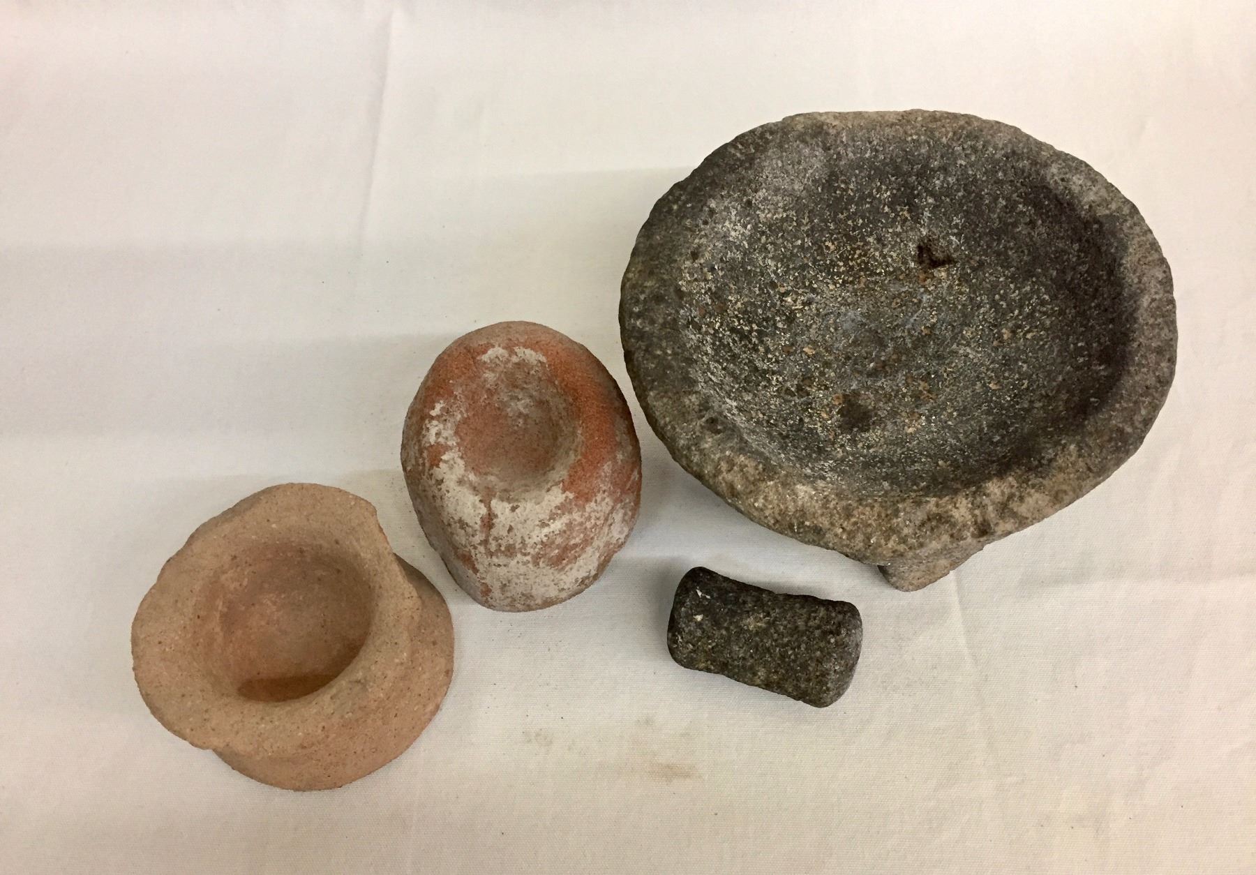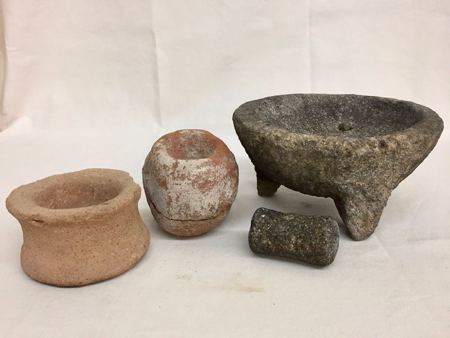 Description: 4 various old grinding stones / bowls. Maker: Various, unknown. Approx. Age: Prehistoric and historic. Size: Sizes range from 7 5/8” across x 4 1/4” deep to 4 1/4” across x 2 1/8” deep. Condition: Pretty good for their age, normal wear expected. Please look closely at the pictures - they are an important part of our description. Shipping: There will be a $10 handling / packaging fee for shipping this lot. The actual cost of postage will be added on top of that.