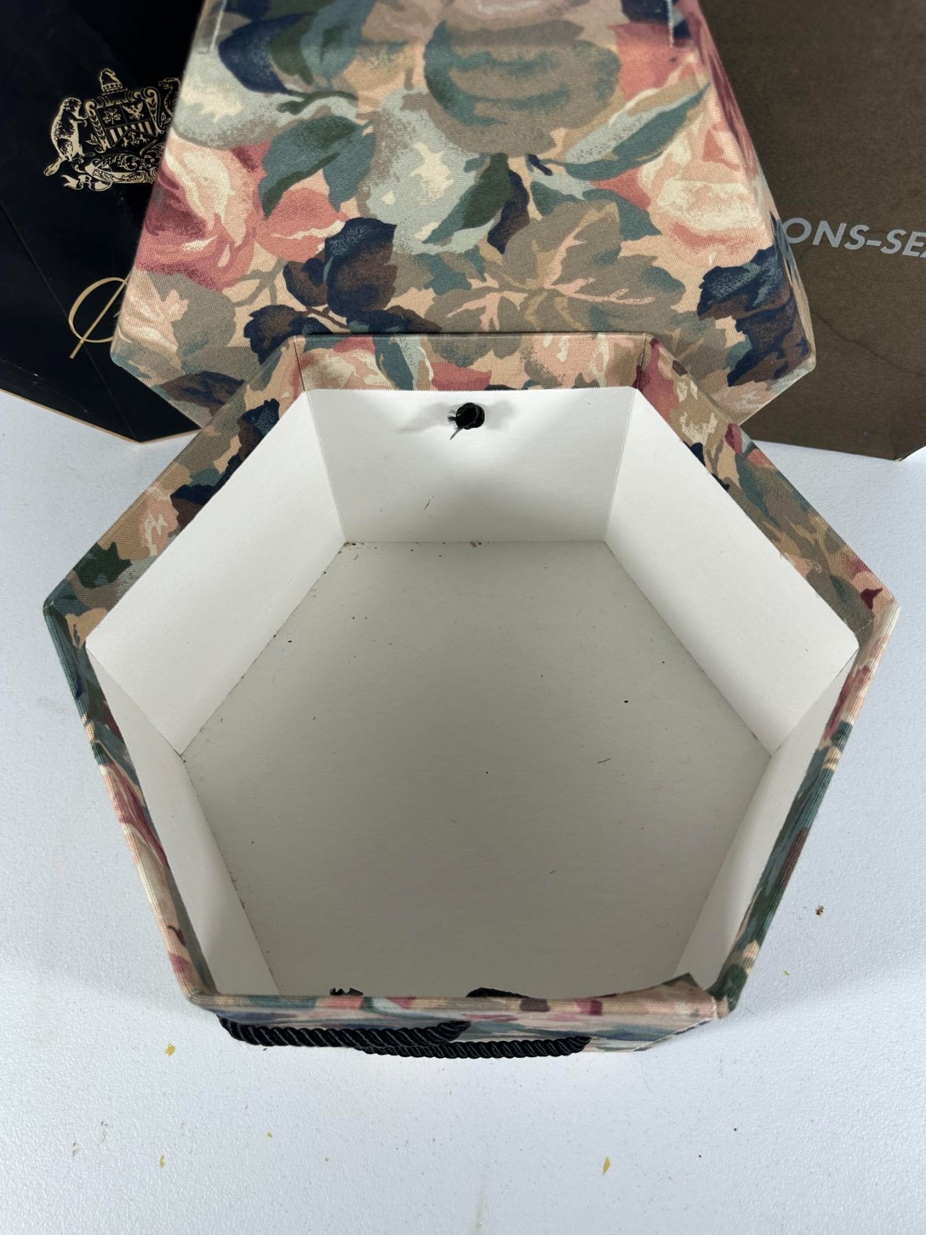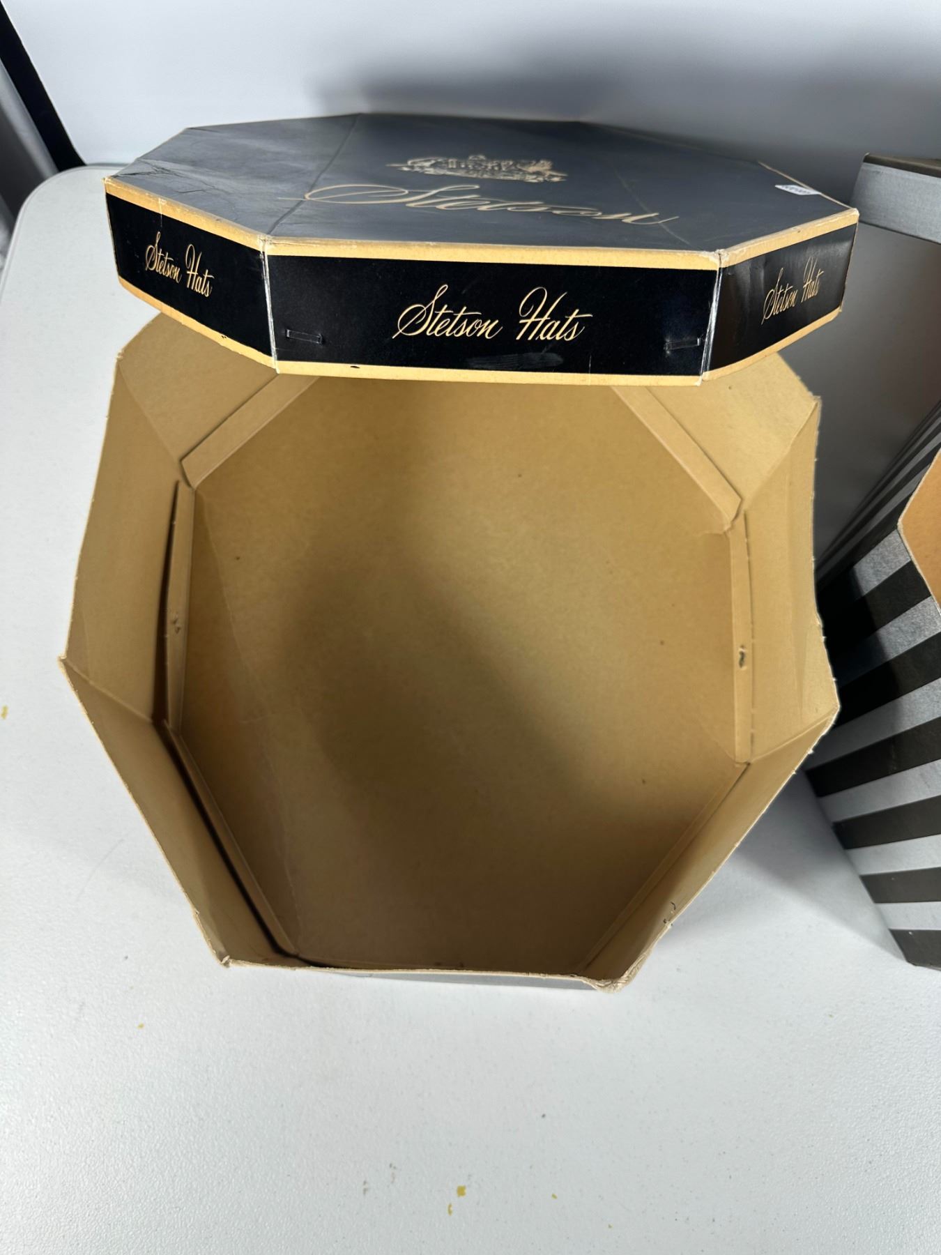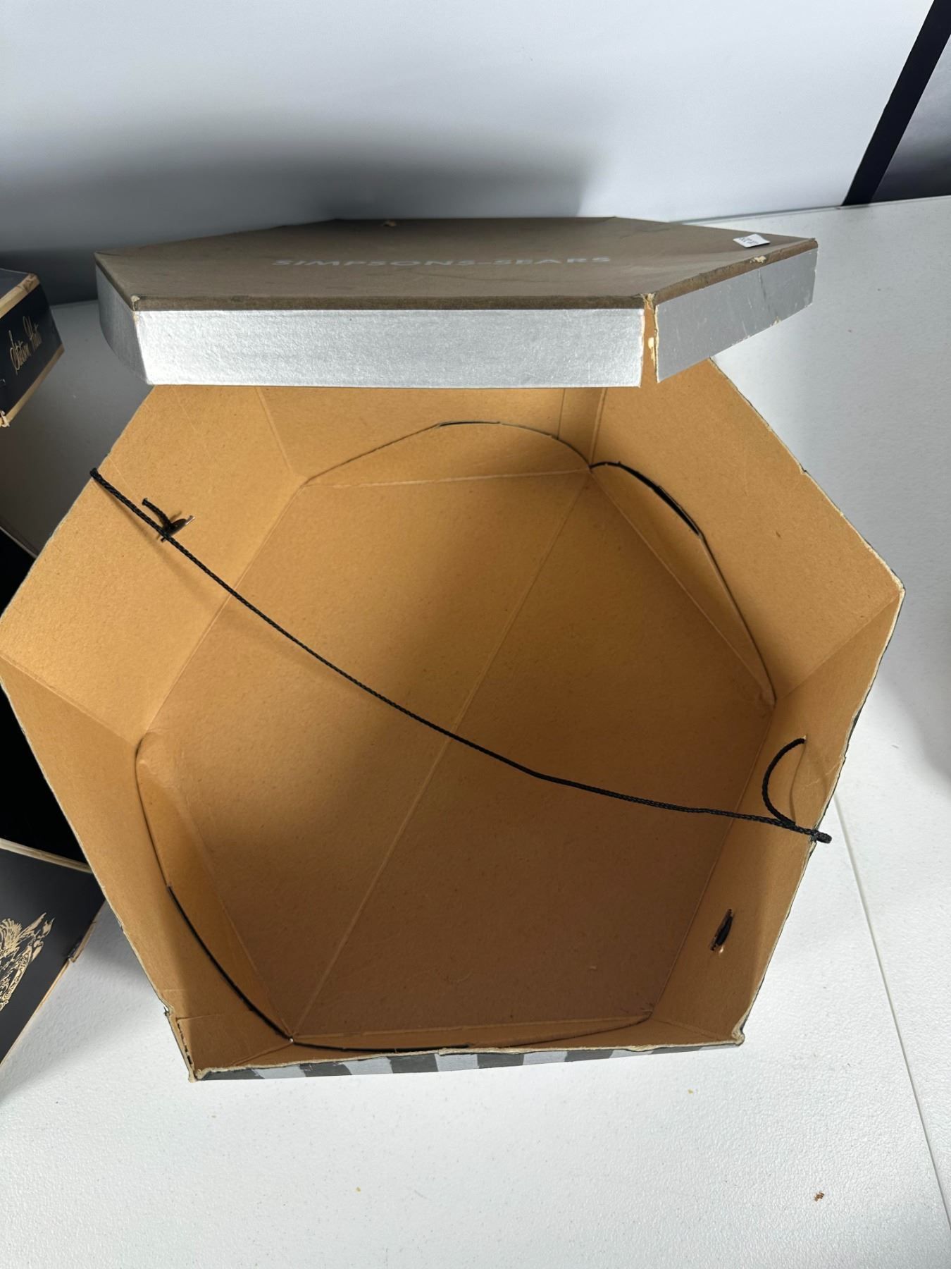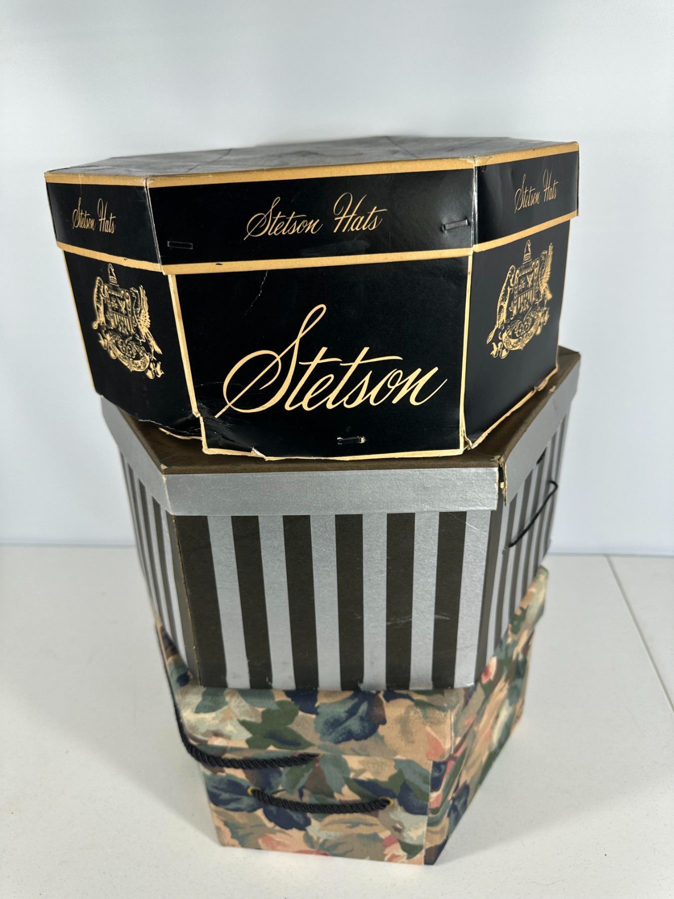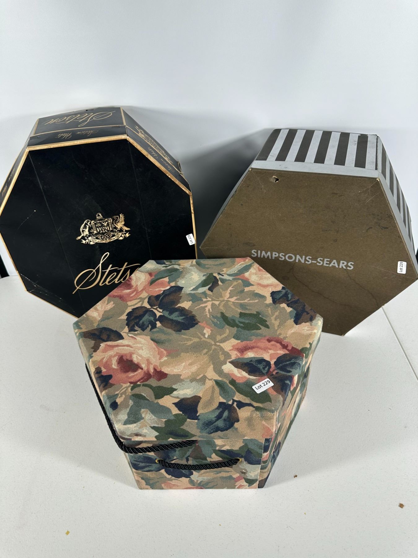 Assortment of three vintage hat boxes including Stetson, Simpsons‑Sears, and a floral fabric‑covered example. Ideal for display or storage.