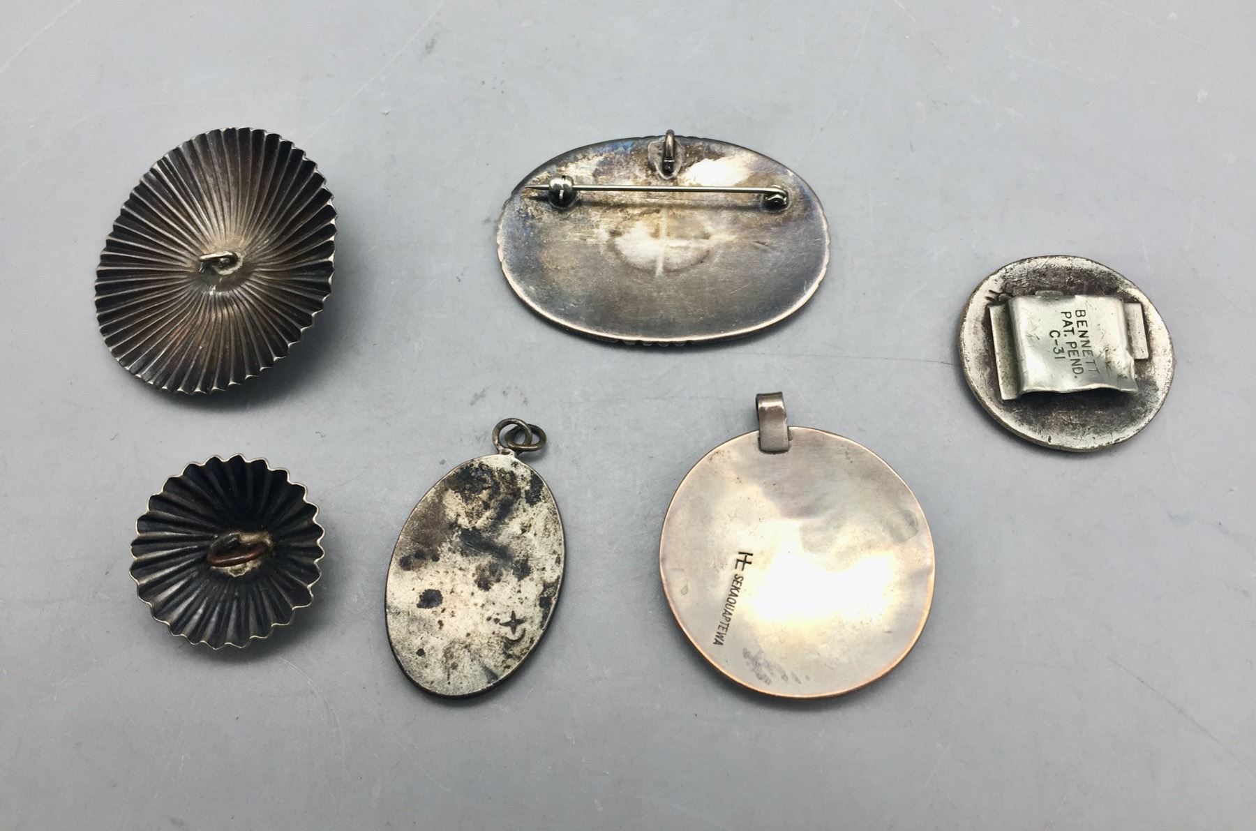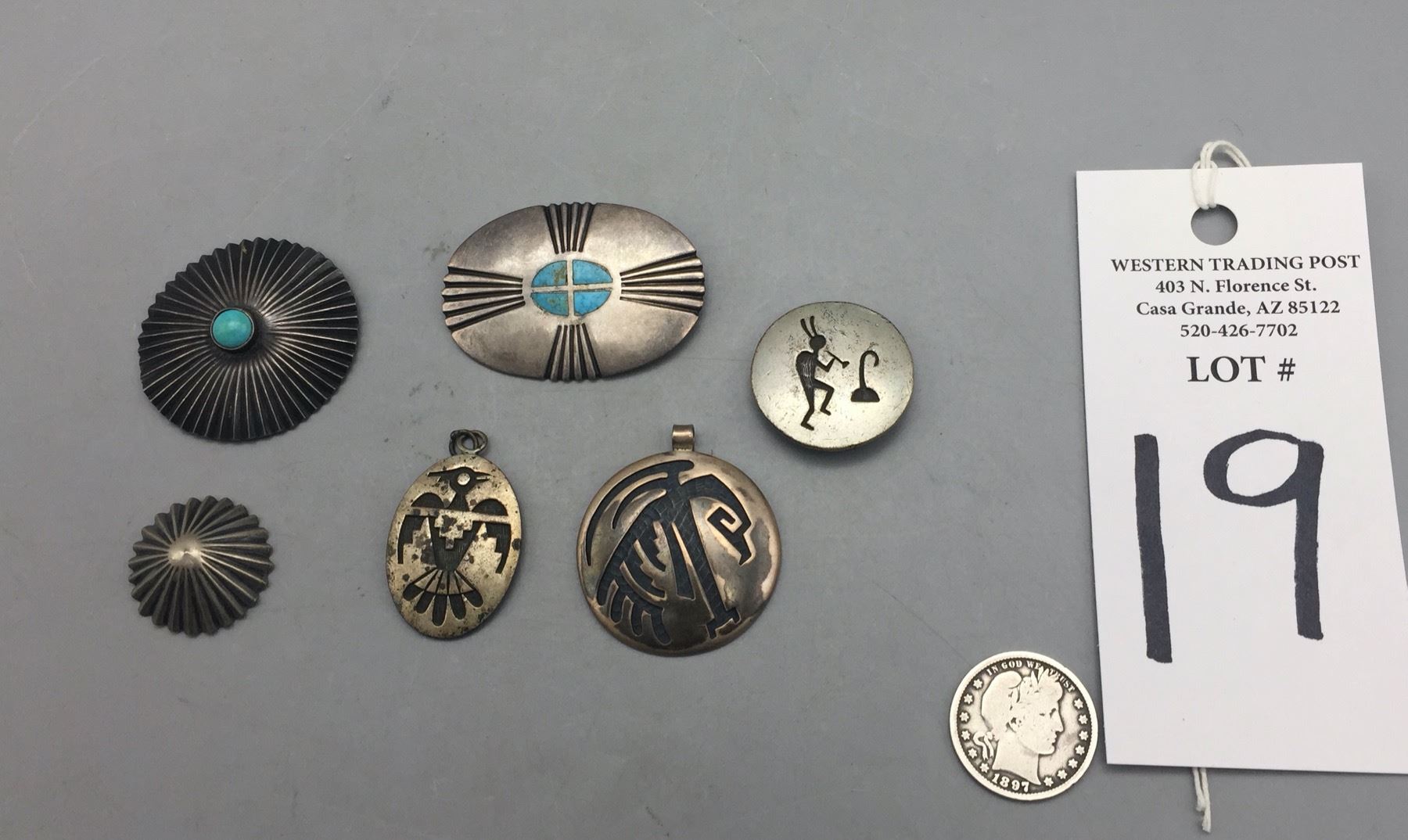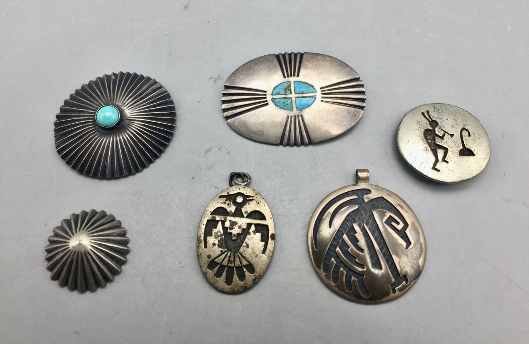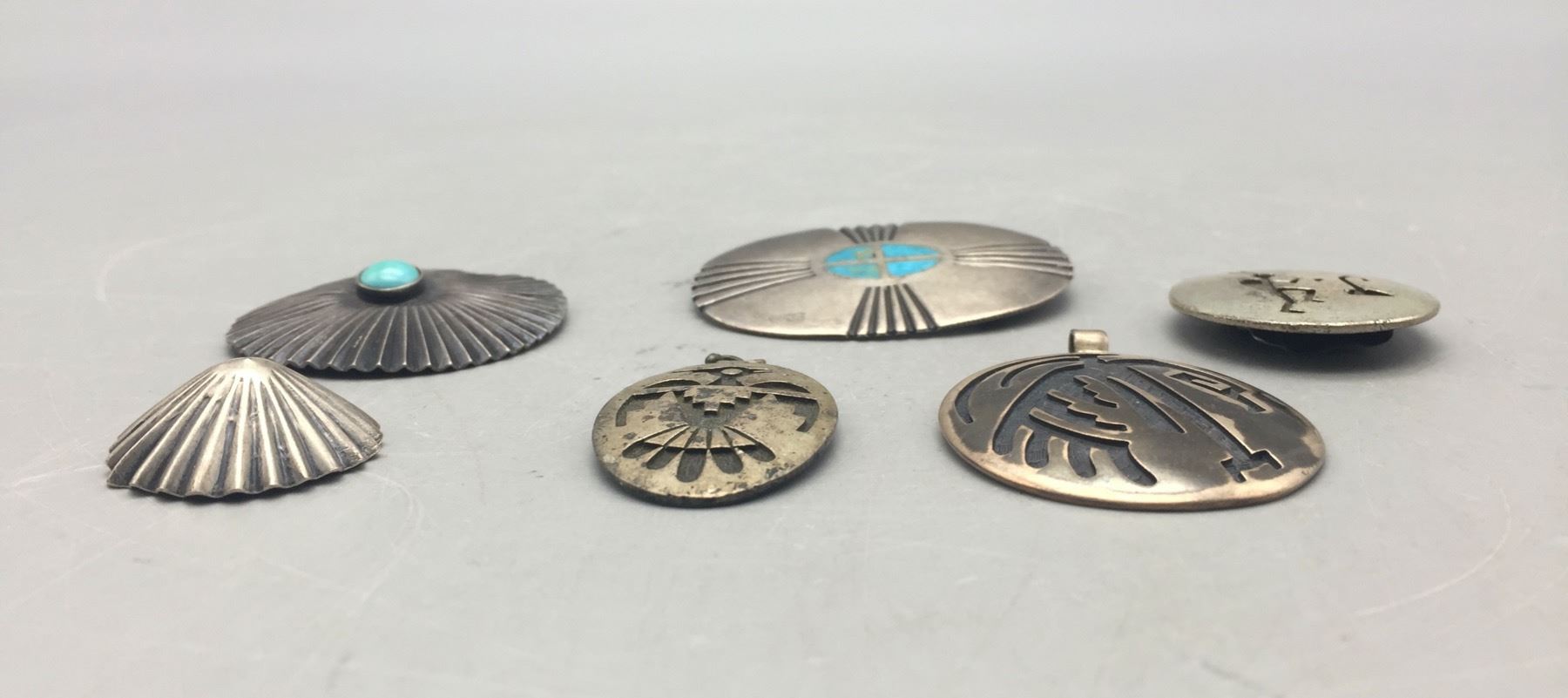 Description: For sale in this lot is a group of vintage pendants, pins, and buttons. All are various sizes and designs, some are set with turquoise. Appear to be sterling silver. Maker: Various. Approx. Age: Vintage. Size: Various, combined weight is 50.9 grams. Condition: Good for their age, normal wear expected. Please look closely at the pictures - they are an important part of our description. Shipping: There will be a $5 handling / packaging fee for shipping this lot. The actual cost of postage will be added on top of that.