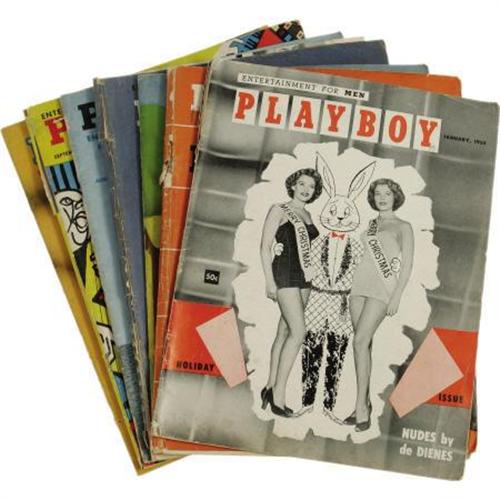 <B>"Playboy" Magazine Group of 7 (1954).</B></I> From 1954, the first full year of its publication (the first issue came out in December 1953), here are vintage copies of the January (the hard-to-find second issue in Good condition with a 3" spine split), March (Good), May (Fine), June (Good-Very Good), July (Very Good-Fine), August (Very Good), and September (Very Good with some spine splitting) of the men's magazine.<BR><BR><b>Shipping:</b> Books & Catalogs (<a target="_blank" href="http://www.heritageauctions.com/common/shipping.php">view shipping information</a>)