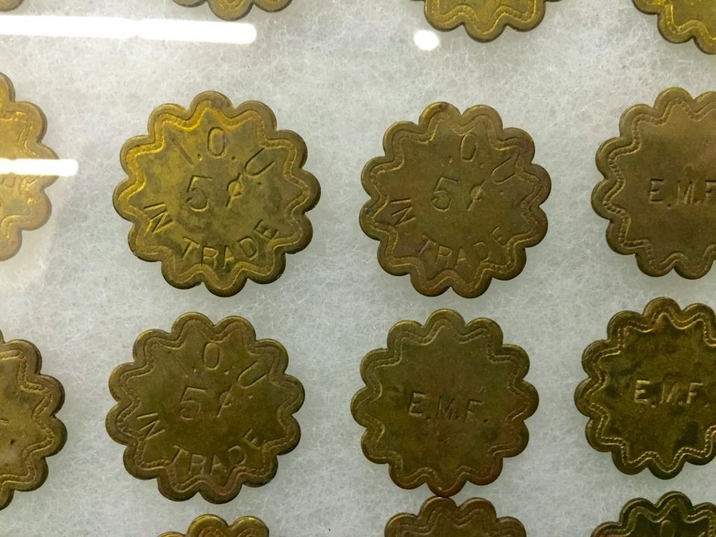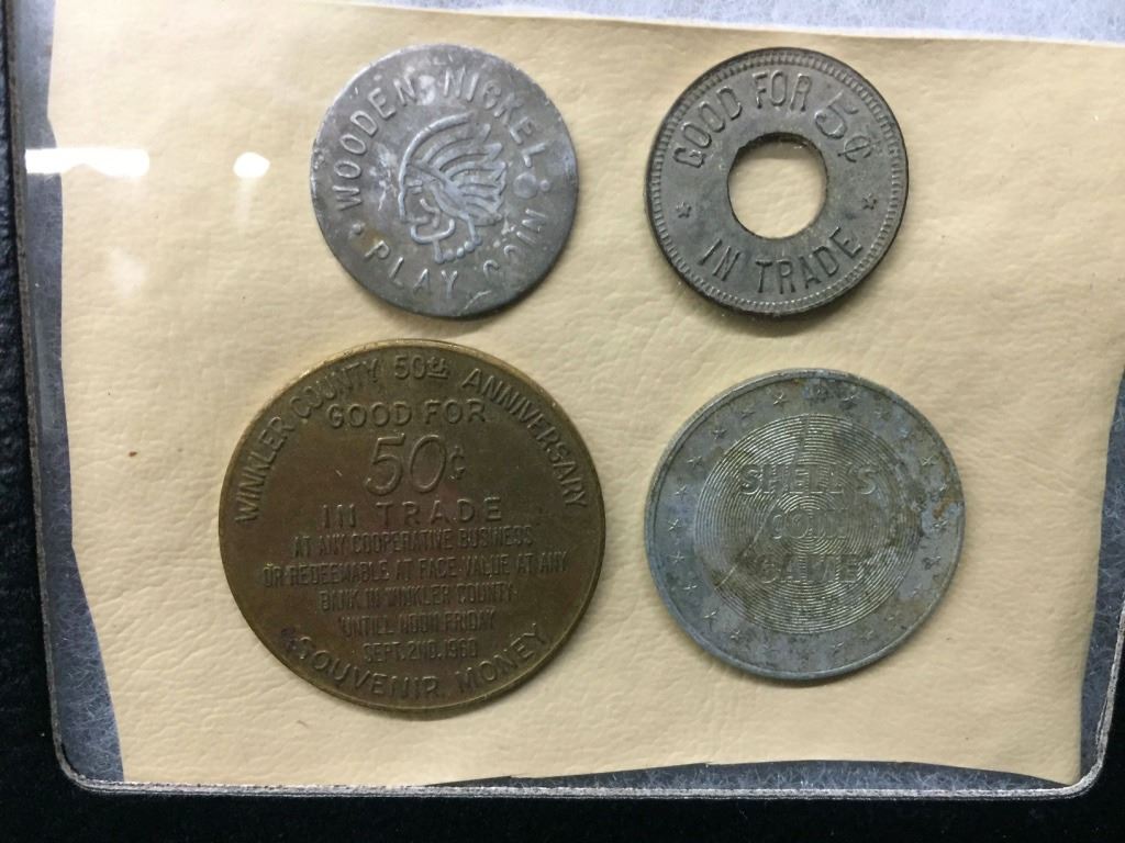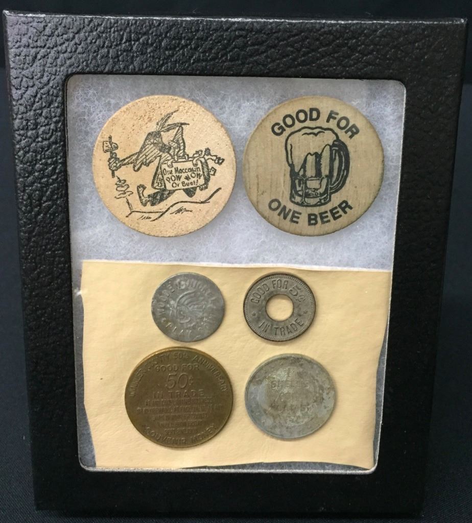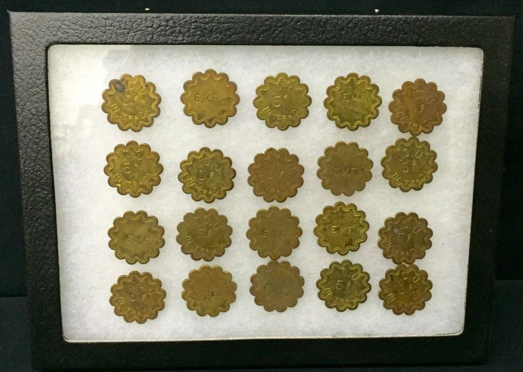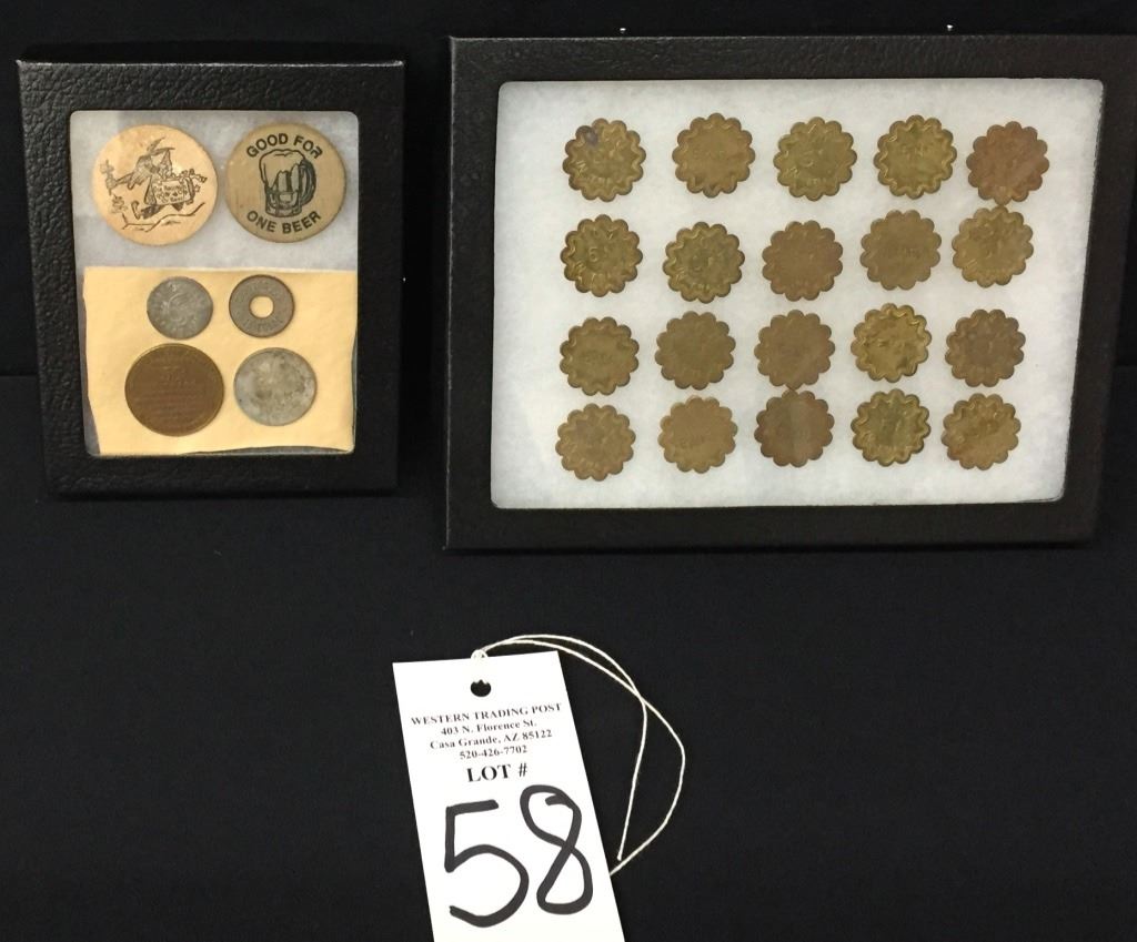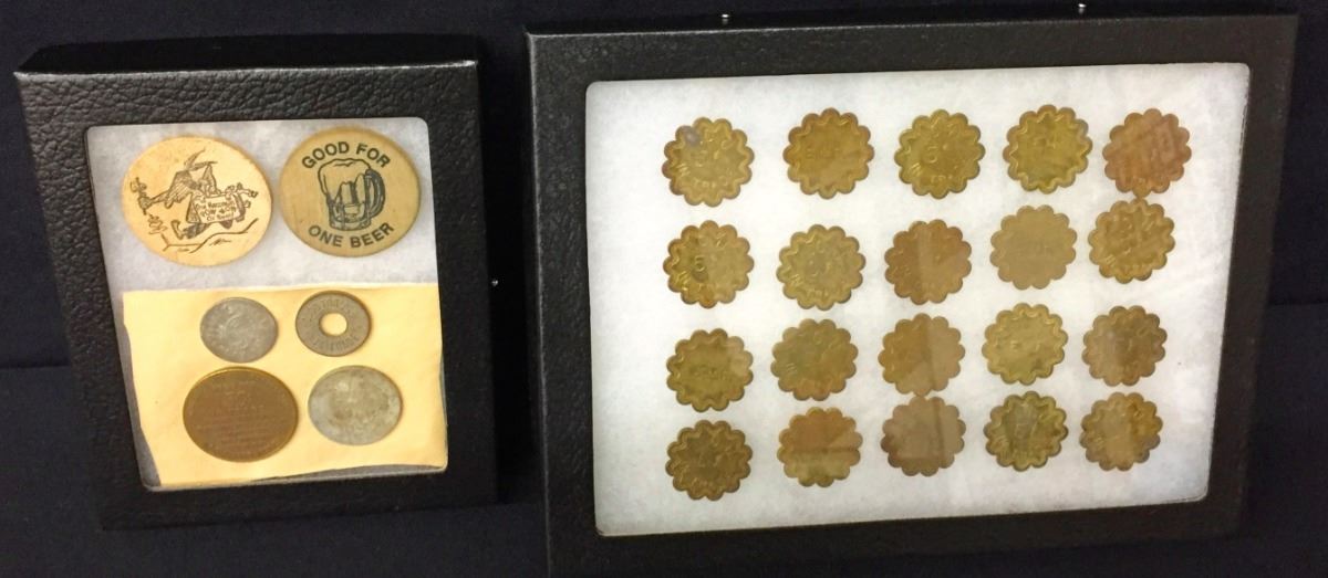 There are 2 different shadowboxes with a total of 26 various tokens in this lot. Most tokens appear to be from about 1900 through the 1950s. Please look closely at the pics as they are an important part of our description. Shipping: There will be a $7 handling / packaging fee for shipping this lot. The actual cost of postage will be added on top of that.