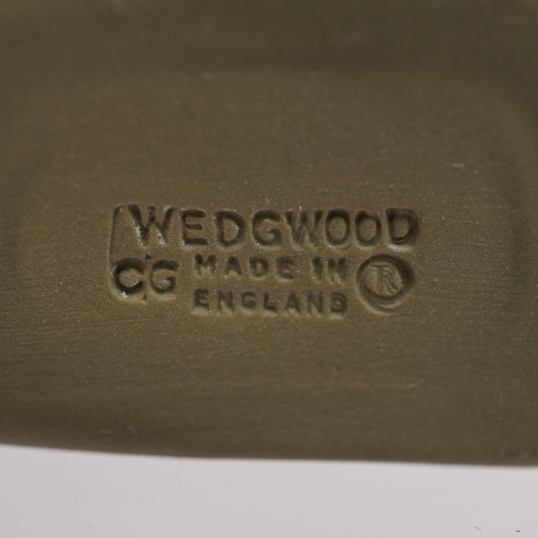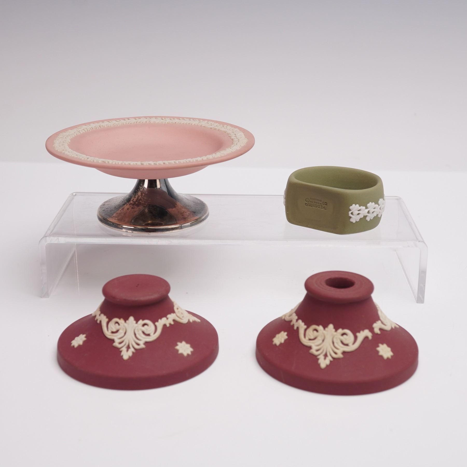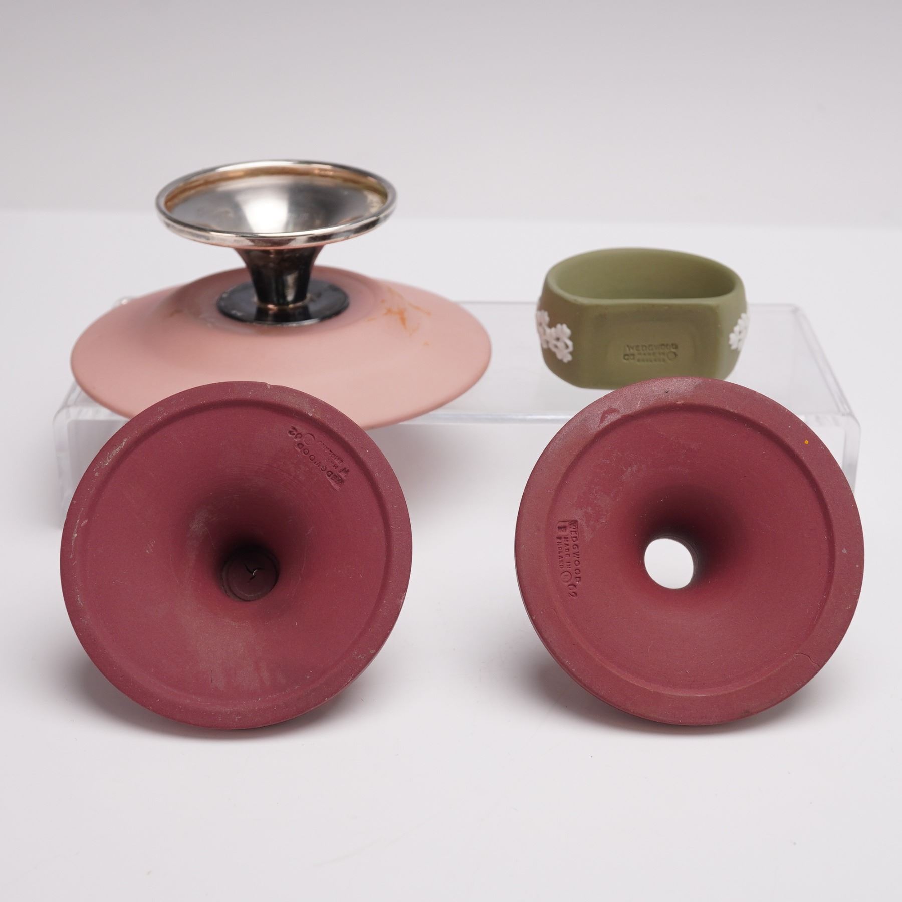 Includes a sage green napkin ring decorated with white floral relief, a pair of wine red stands with scrolling foliate motifs in white relief, and a small pink tazza on a silverplate base marked Silverplate. Each piece bears impressed Wedgwood marks to base. A fine group for the collector. Largest piece measures 1.75"H x 4"dia.
