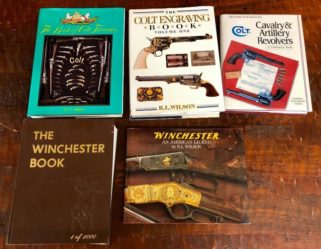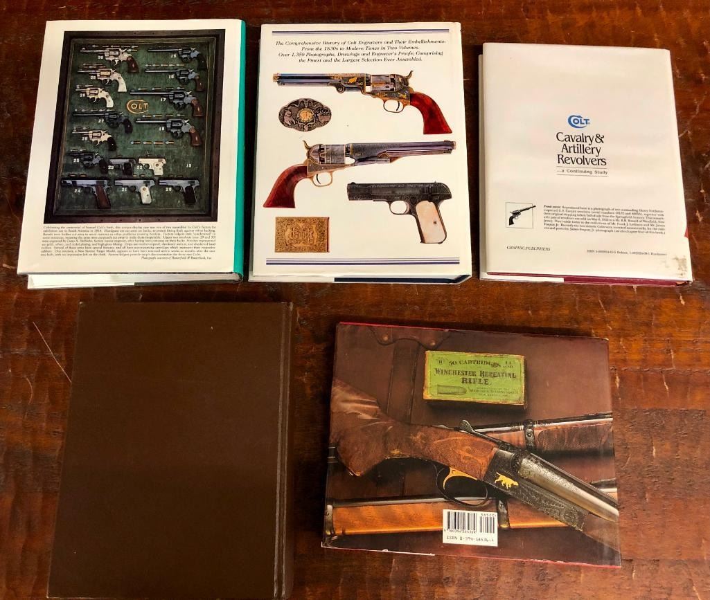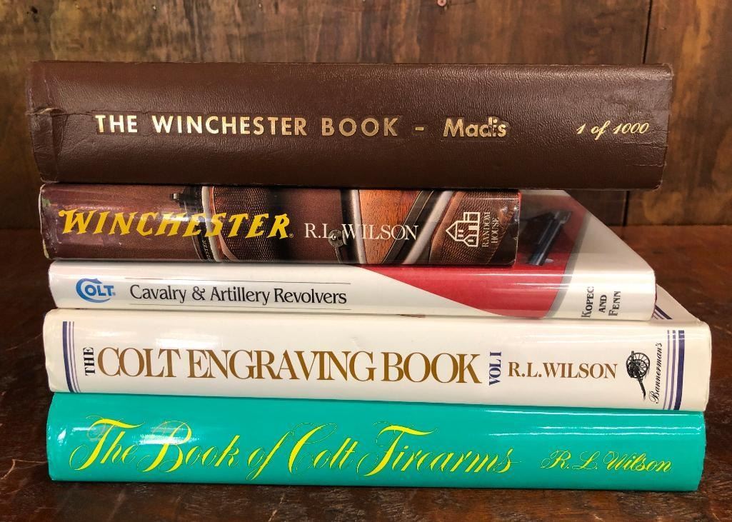 Presented for sale in this lot is a great group of reading material. These western theme coffee table books are mostly about Colt and Winchester Firearms. These books are in great condition. There are three Colt books and two Winchester books. They show many types of antique and vintage firearms and are very informative for collectors. A great and necessary addition to a true firearms collector's collection! MAKER: Various Authors. APPROX AGE: Pretty modern. SIZE: Varies. CONDITION: Good for their ages, normal wear expected. Please look closely at the pictures as they are an important part of our description and are hereby incorporated into the description, specifically with regards to condition. SHIPPING: There will be a $10 handling / packaging fee for shipping this lot. The actual cost of postage will be added on top of that. BUY IT NOW: If you would like to buy this item now, without waiting for the auction day to bid on it, we do offer this option (which is available up to 48 hours before the actual auction starts). The “Buy it Now†price is the high estimate of this lot (plus applicable fees and the Buyer's premium is discounted to 10% when using the Buy it Now option). If you would like to exercise this option, you must contact us by email (or phone as long as you talk to someone live). Reference this lot number and your intention to "Buy it Now."