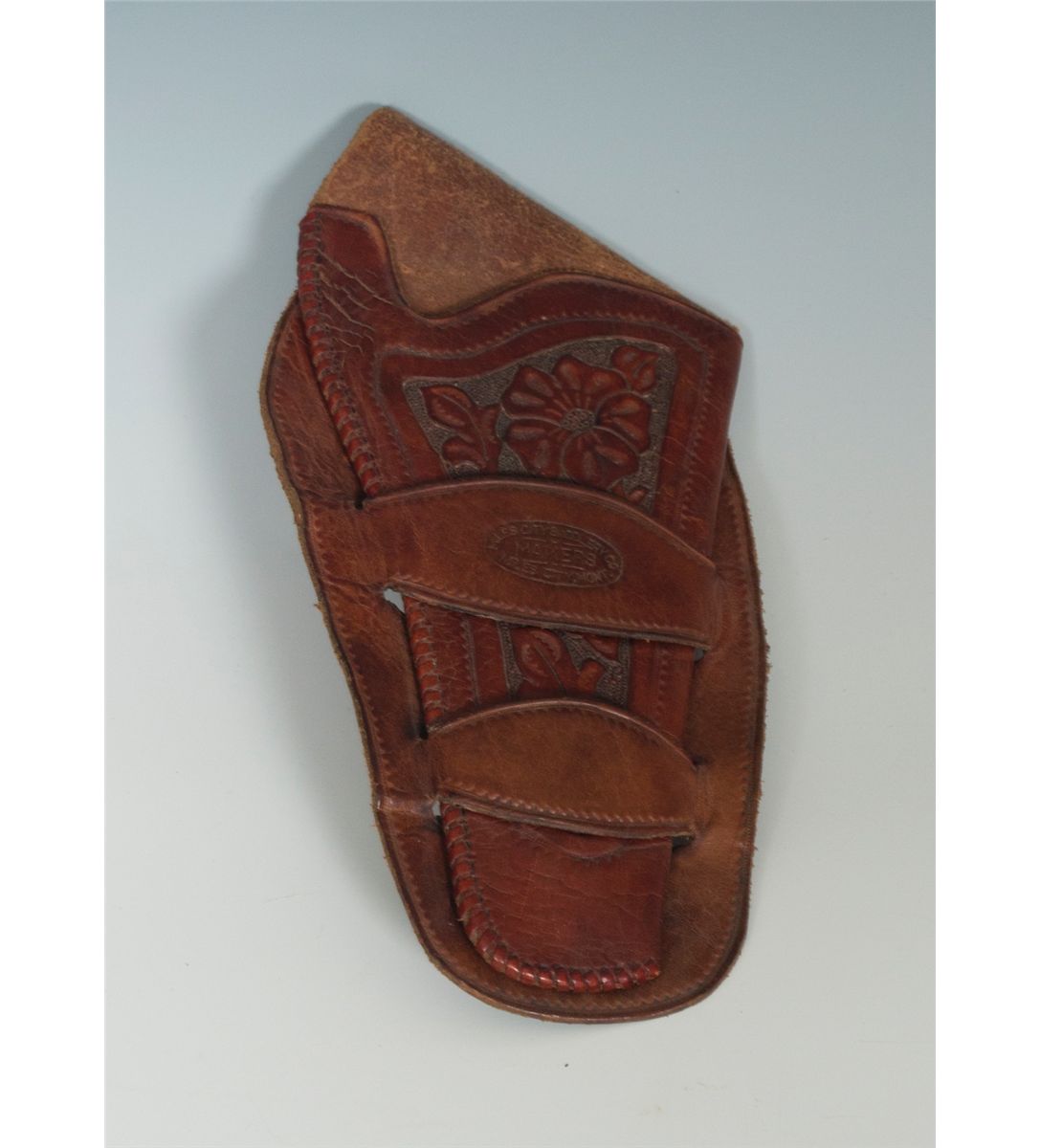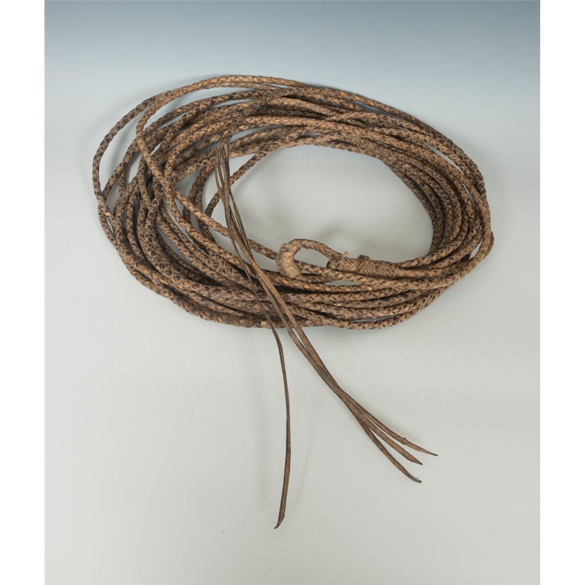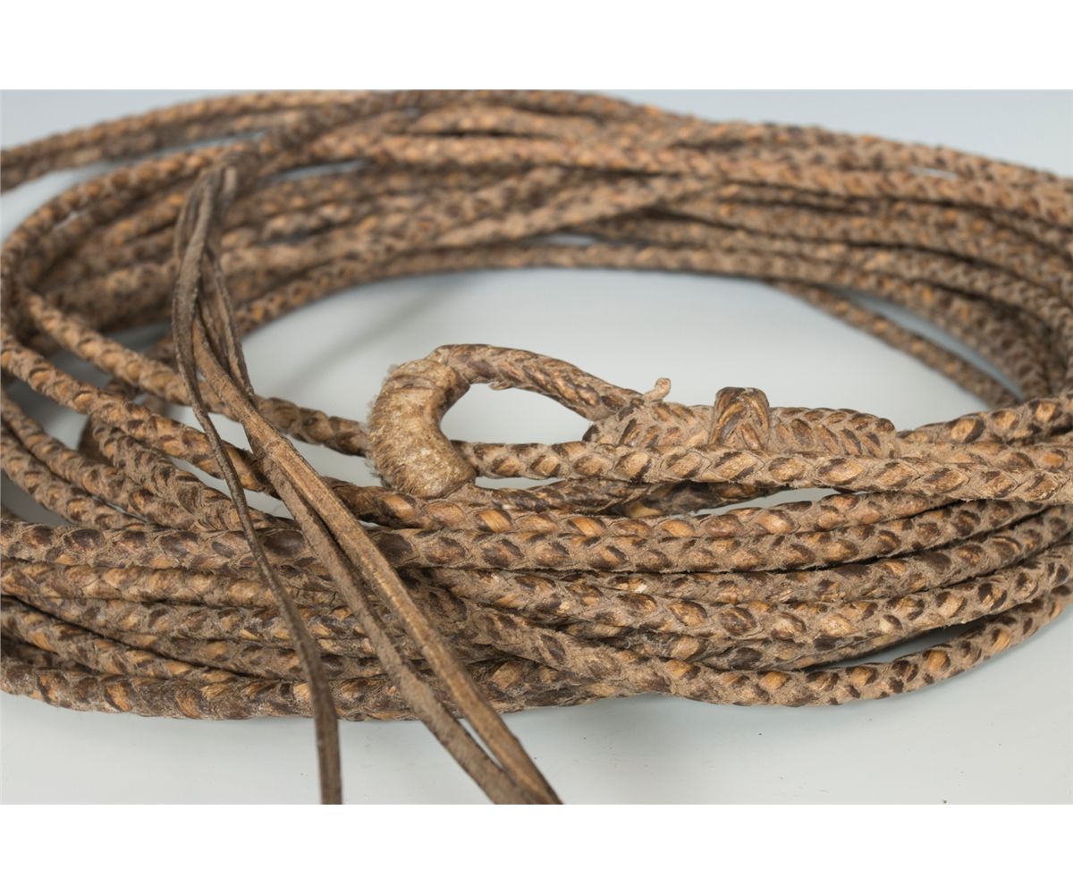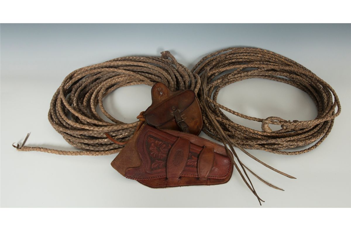 Group of Western Collectibles. Two old braided leather ropes, 71' long and 66' long. Miles City Saddlery Co. (Miles City, MT.) holster with floral tooling, 11" x 5.5". Fred Mueller (Denver, CO.) leather tally pouch, 6.5" x 6". All 19th century and all in fine condition. Provenance: Golden Eagle Trading Co.