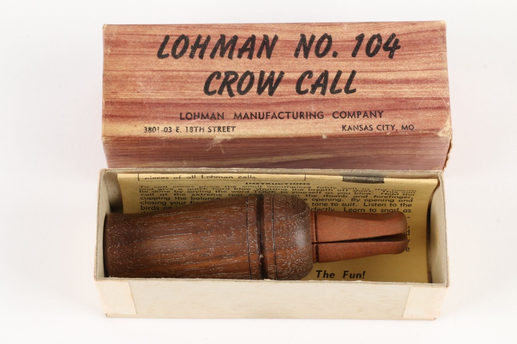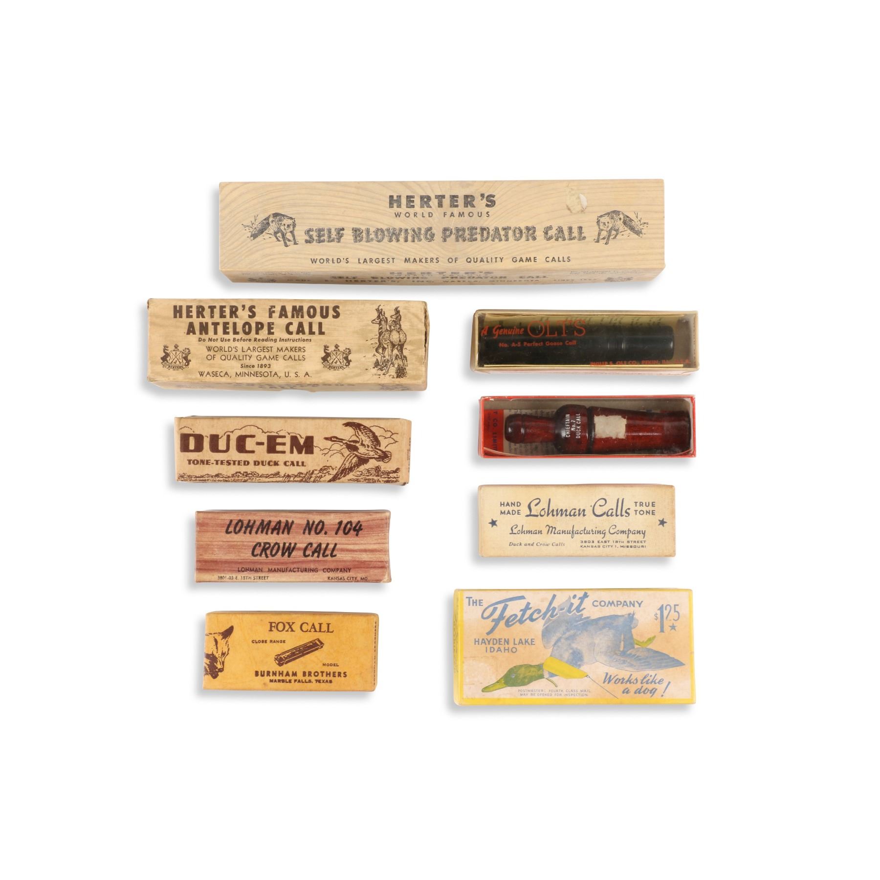 Fox Call, Fetch-it, Lohman No. 4 Crow Call, Duc-Em, Lohman Calls, Herter's Famous Antelope Call, Olt's Call, Chieftan Bird Call, Herter's, North America. Boxed. Material: Mixed. Quantity: 9. Grade: VG+. 4.5" - 10" Each Est. $125-150.