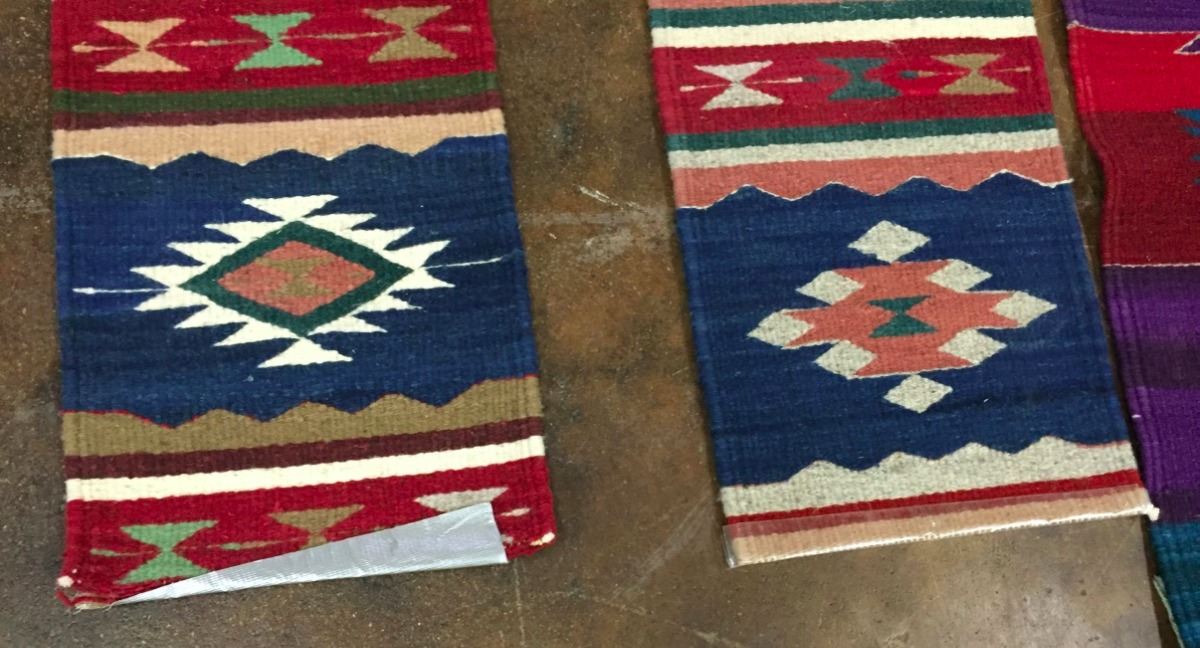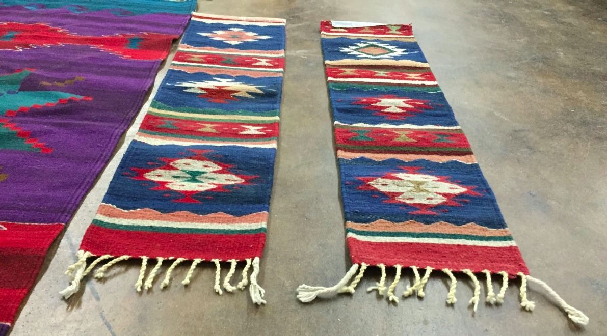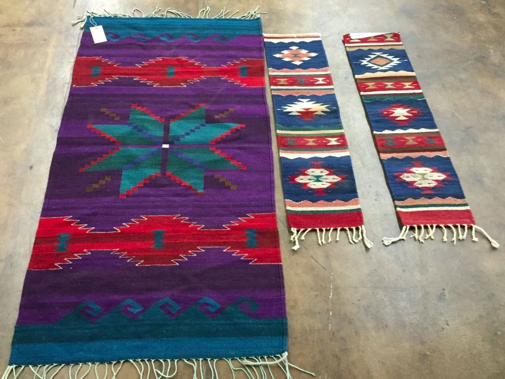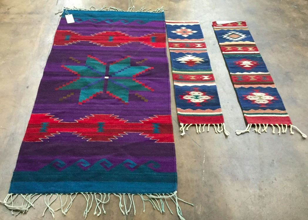 There are three Southwestern style weavings included in this lot. The two smaller ones measure 10 inches wide by 39 inches long. The bigger one is 30 inches x 58 inches. Please note one of the smaller ones has a damaged end. Please look closely at pics - they are an important part of our description. Shipping: There will be a $7 handling / packaging fee for shipping this lot. The actual cost of postage will be added on top of that.