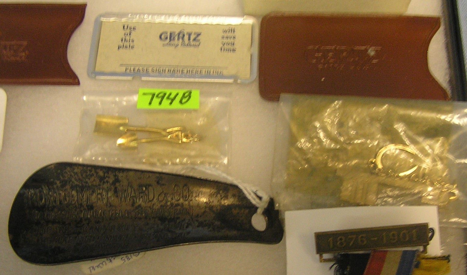 Group of advertising collectibles includes mini groundbreaking shovel for Crystal Cathedral, gold plated key for Meadow Brook national bank. Early Montgomery Ward shoe horn est. value $40.00-$50.00