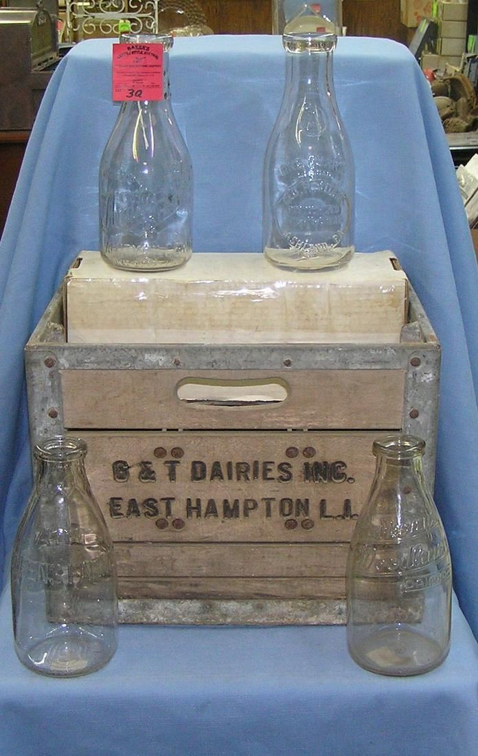 Group of antique milk bottles with original wood and metal advertising crate from East Hampton Long Island est. value $125.00-$150.00