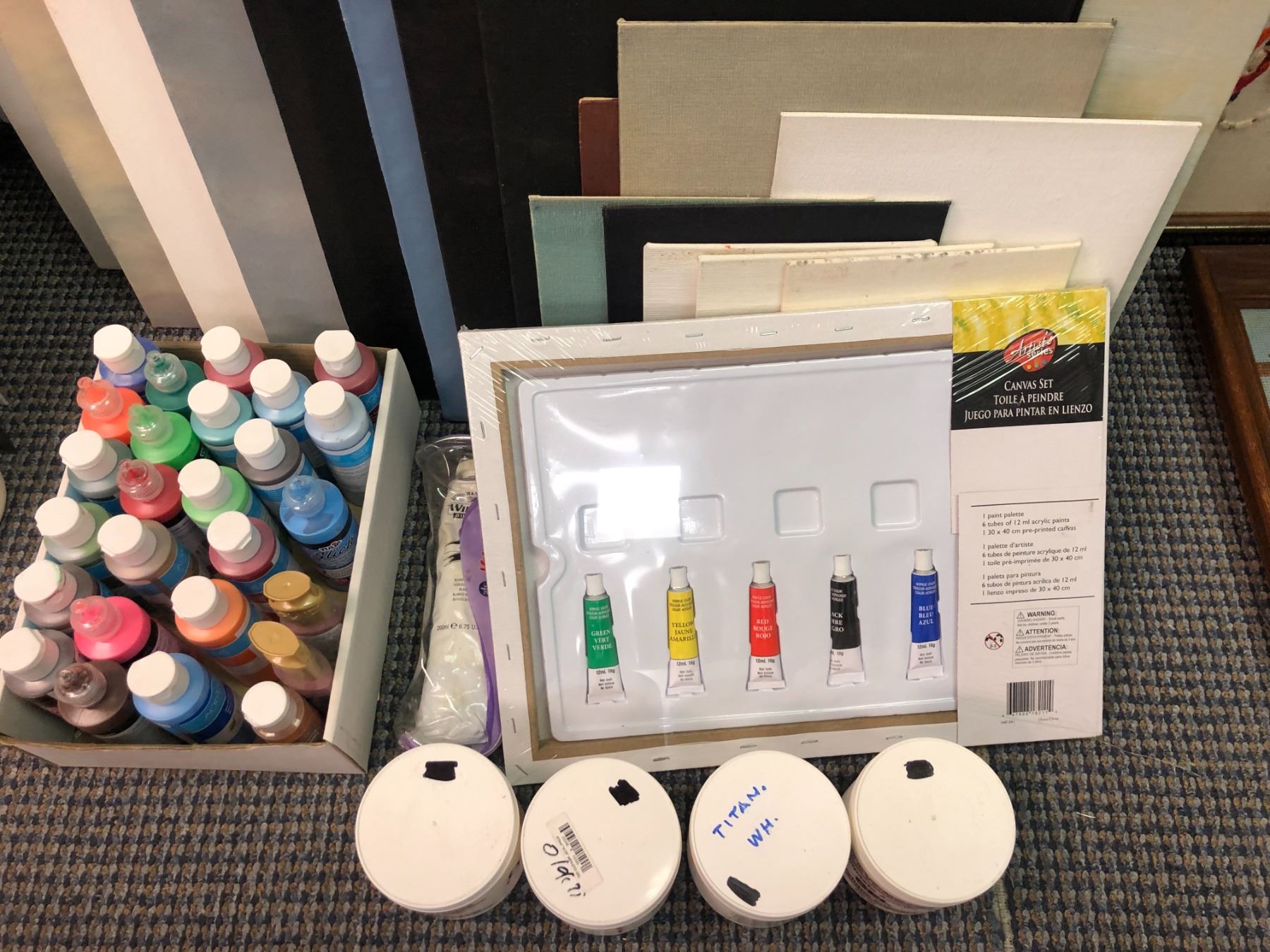 Group of artist's supplies - blank canvases/ assorted color paints/ acrylic gloss gel bottles etc.