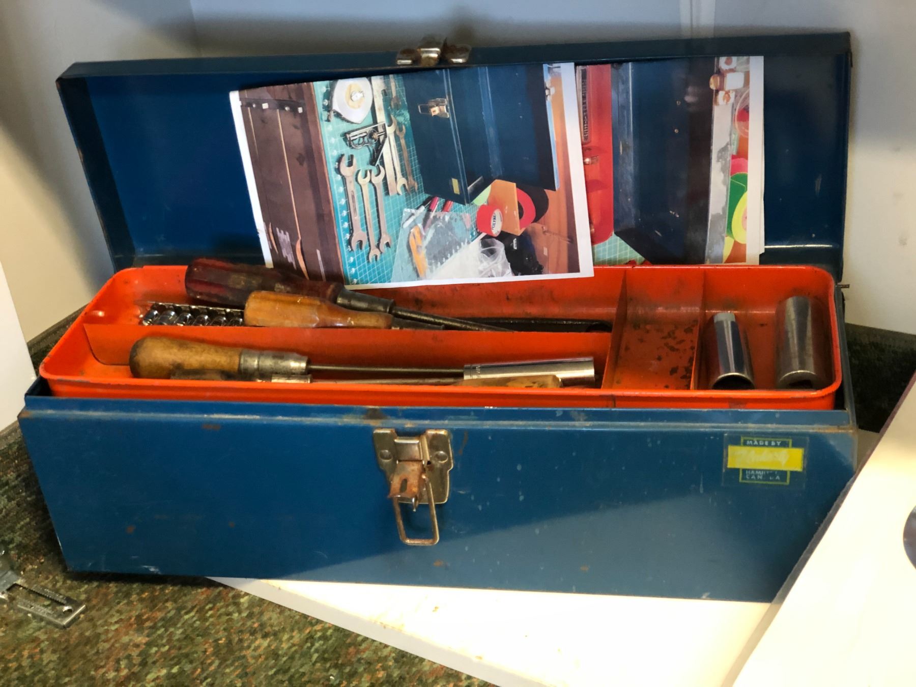Group of assorted "Hero" Props - toolbox / clothing / apron record to chomp - multiple ep. & scenes (From the superhero show)