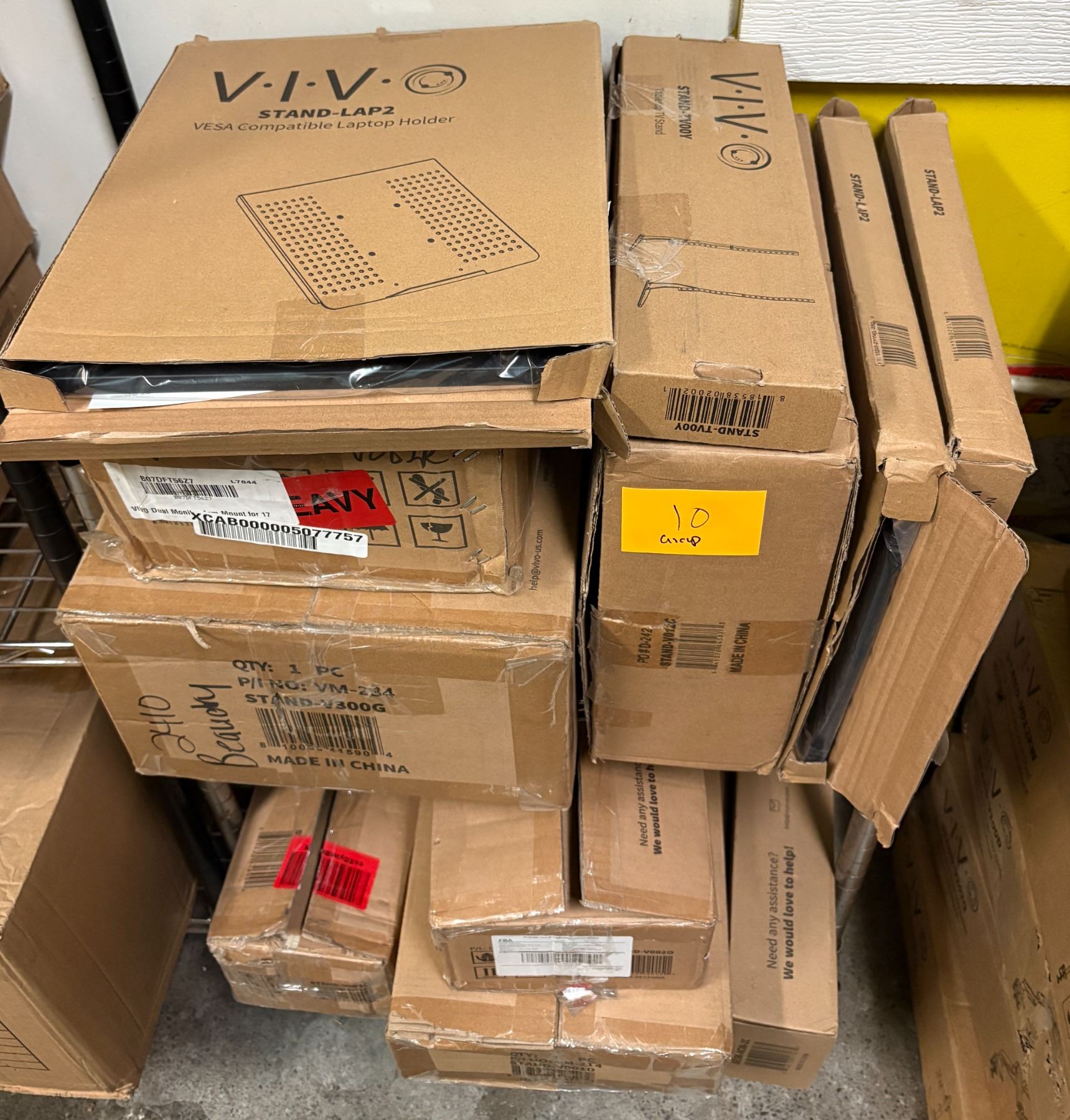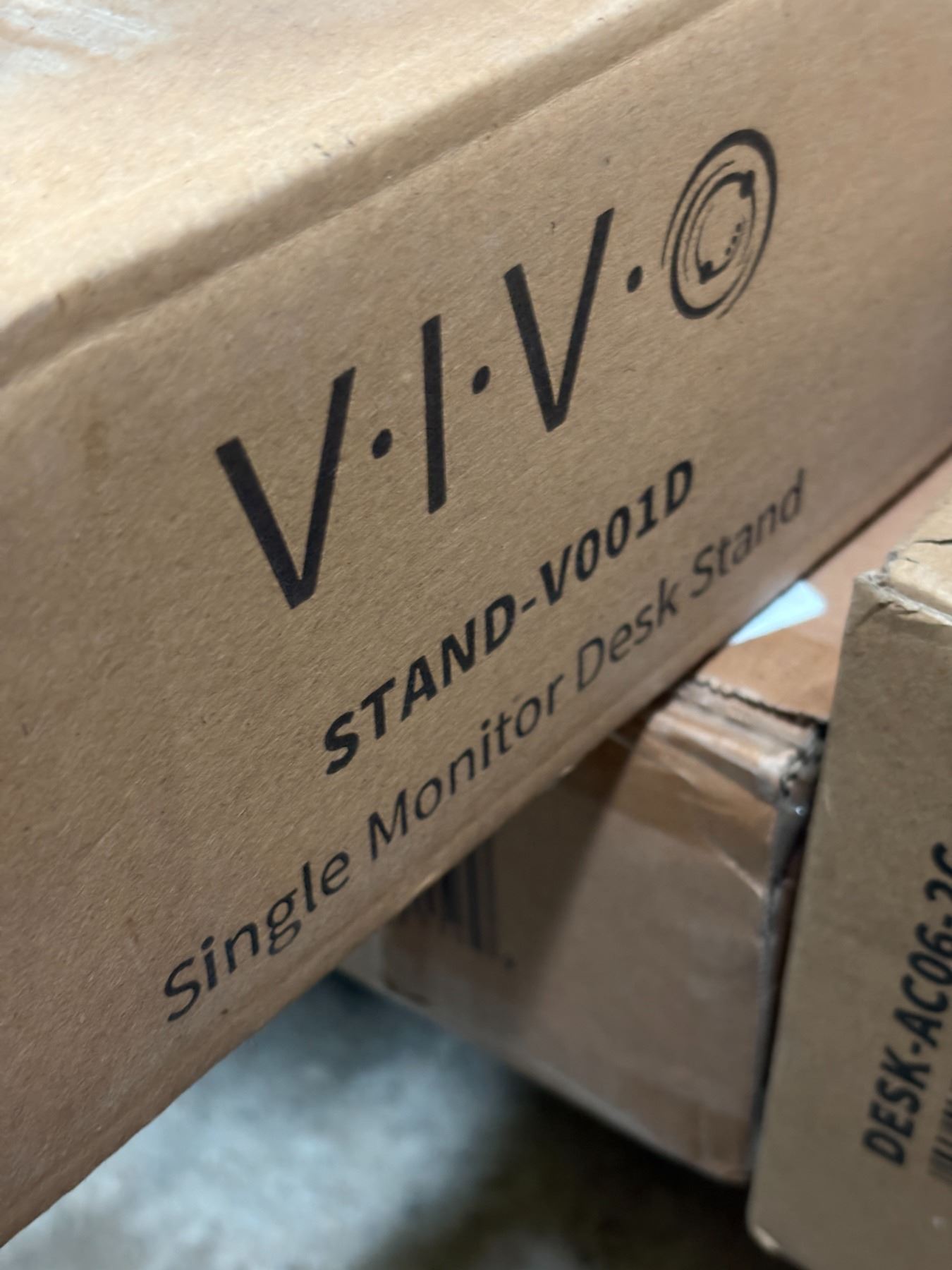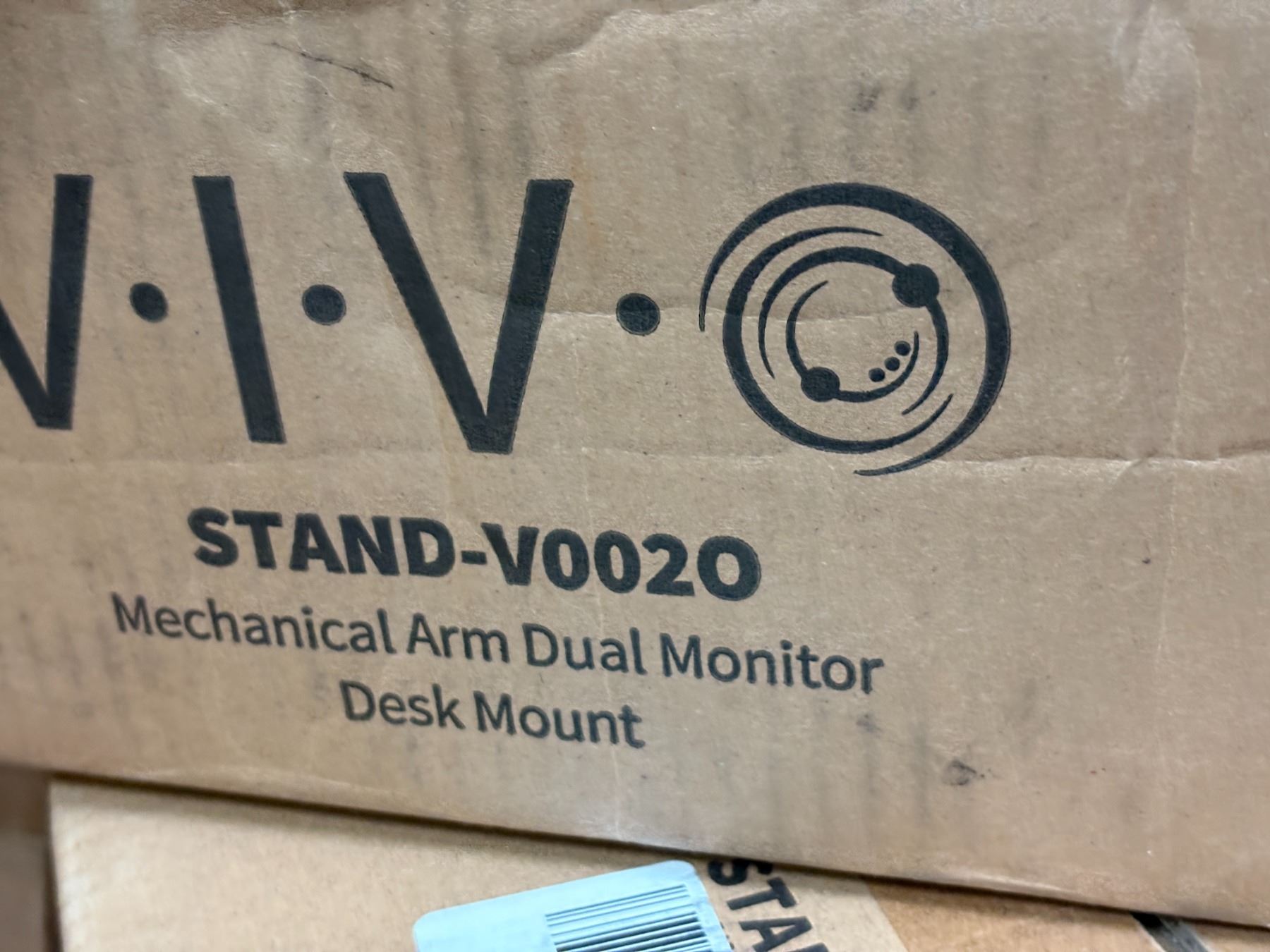 Group of assorted VIVO mounts - dual mechanical arm, dual desk mounts, single monitor mounts etc. (refurbished in boxes)
