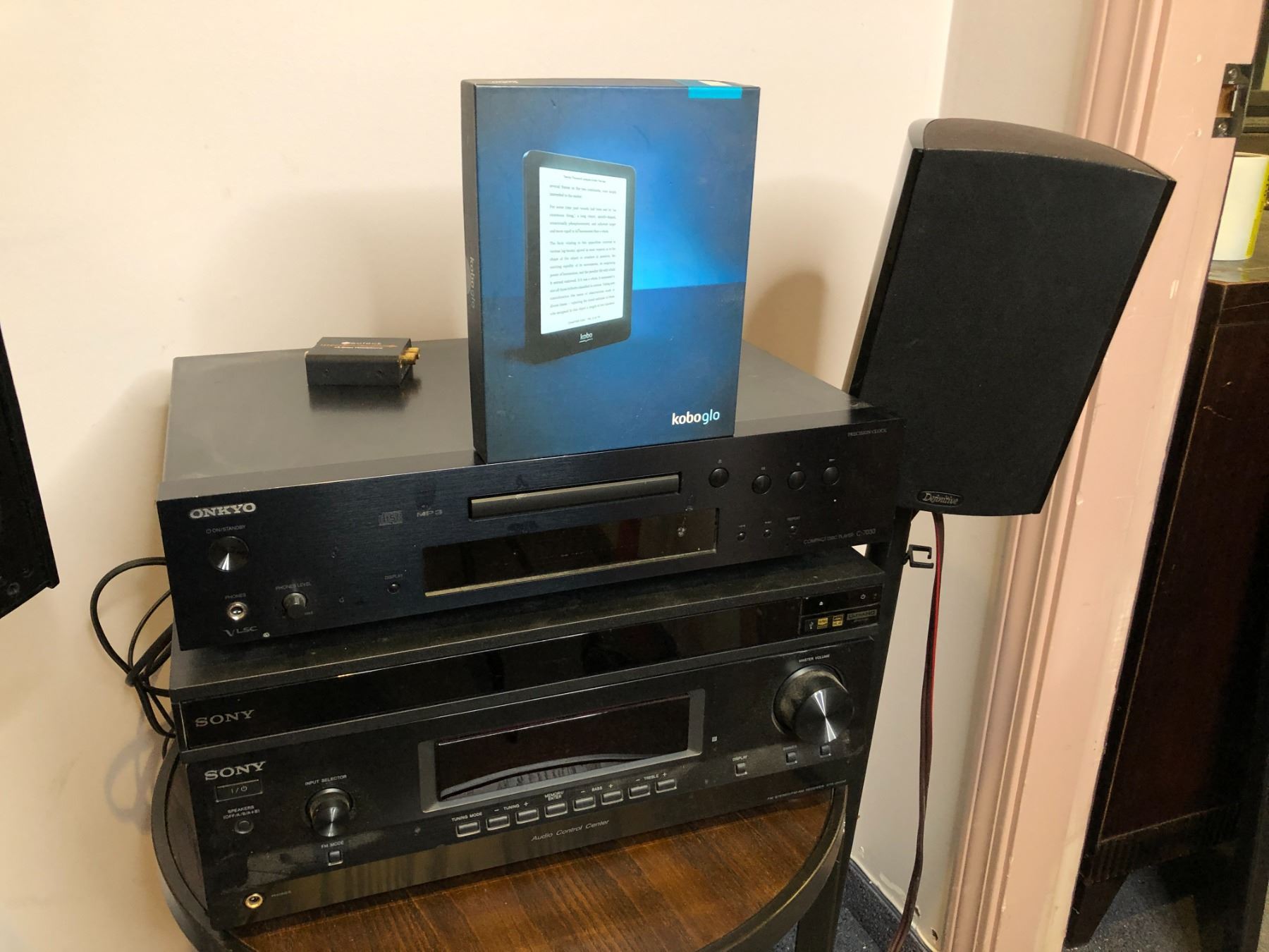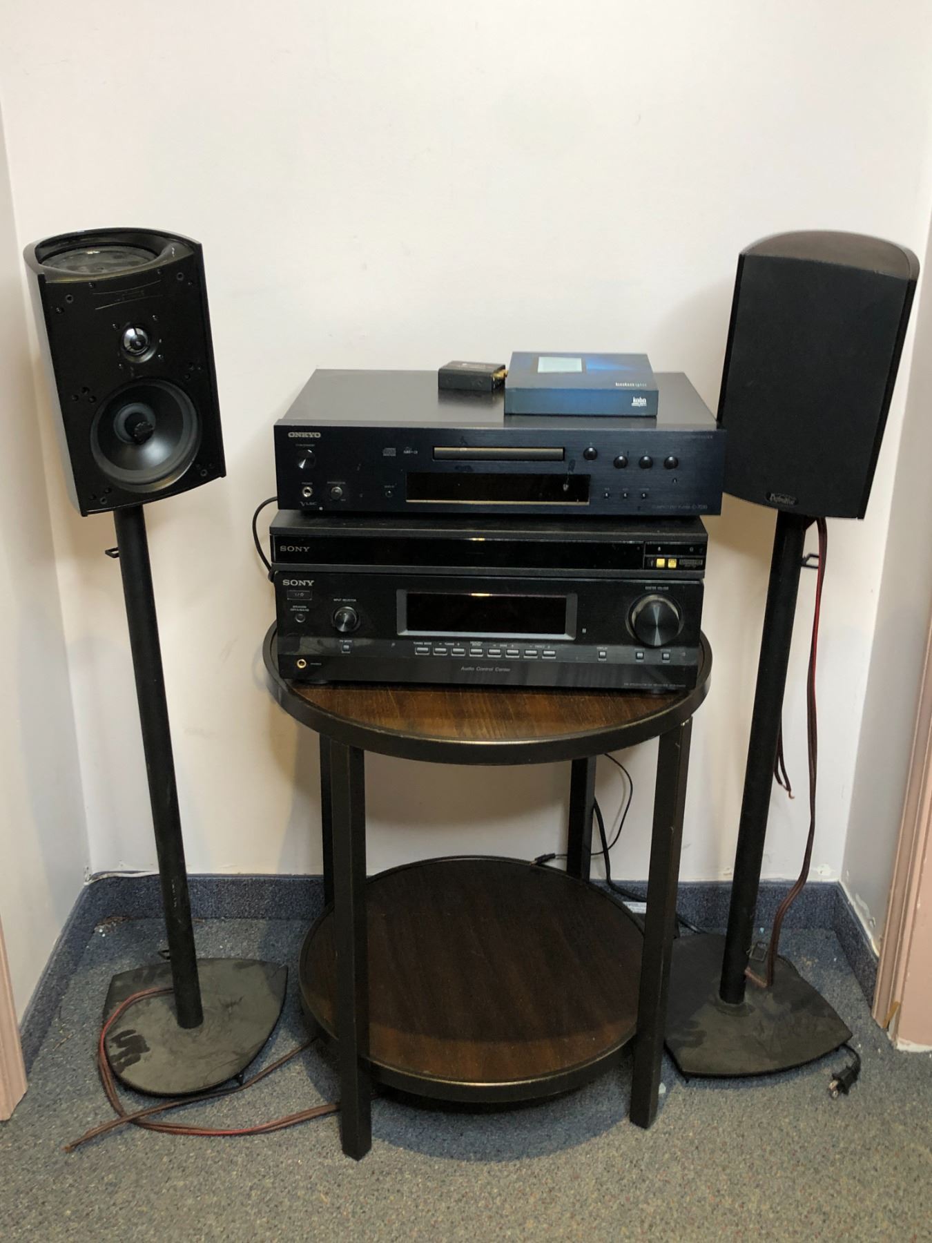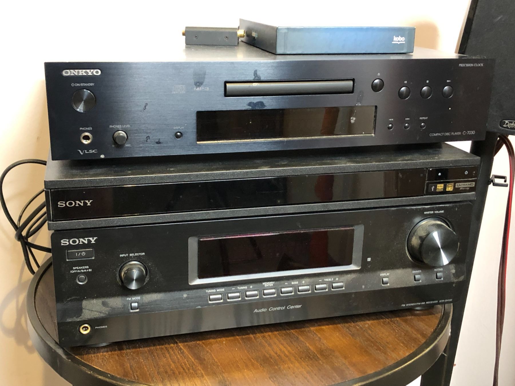 Group of assorted audio items - includes Sony FM stereo receiver STRDH130/ Sony ultra HD blu ray DVD player/ Onkyo compact disk player w/ Definitive speakers w/ stands