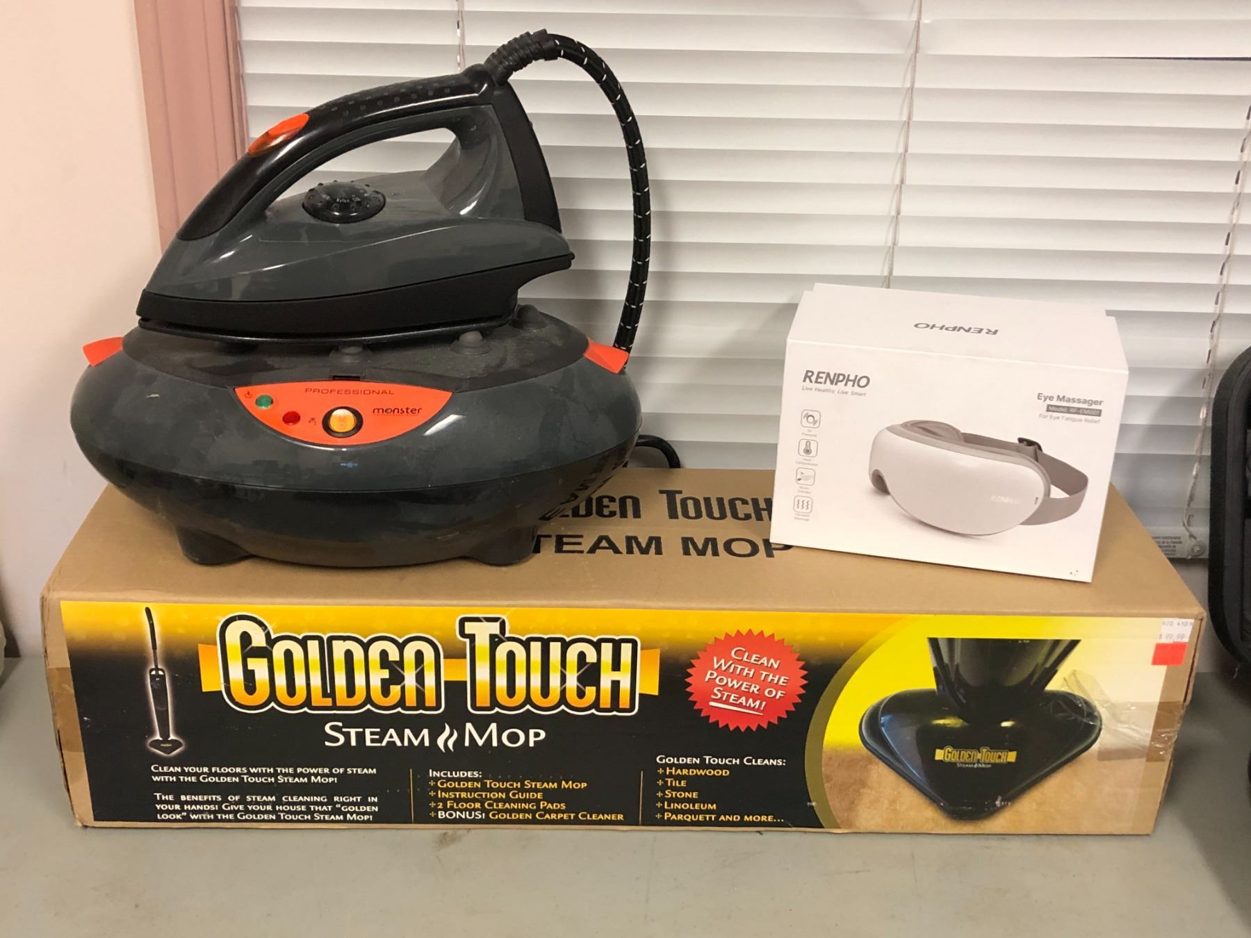 Group of assorted estate items - includes Golden Touch steam mop/ Renpho eye massager & Monster Professional Iron/Steamer