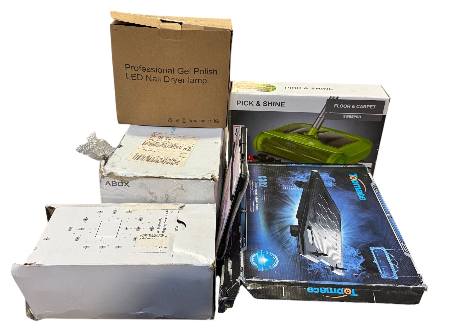 Group of assorted household - includes LED nail dryer lamp / Pick & Shine floor carpet sweeper / Pixseal II laminator / Topmate cooling equipment for gaming notebook etc